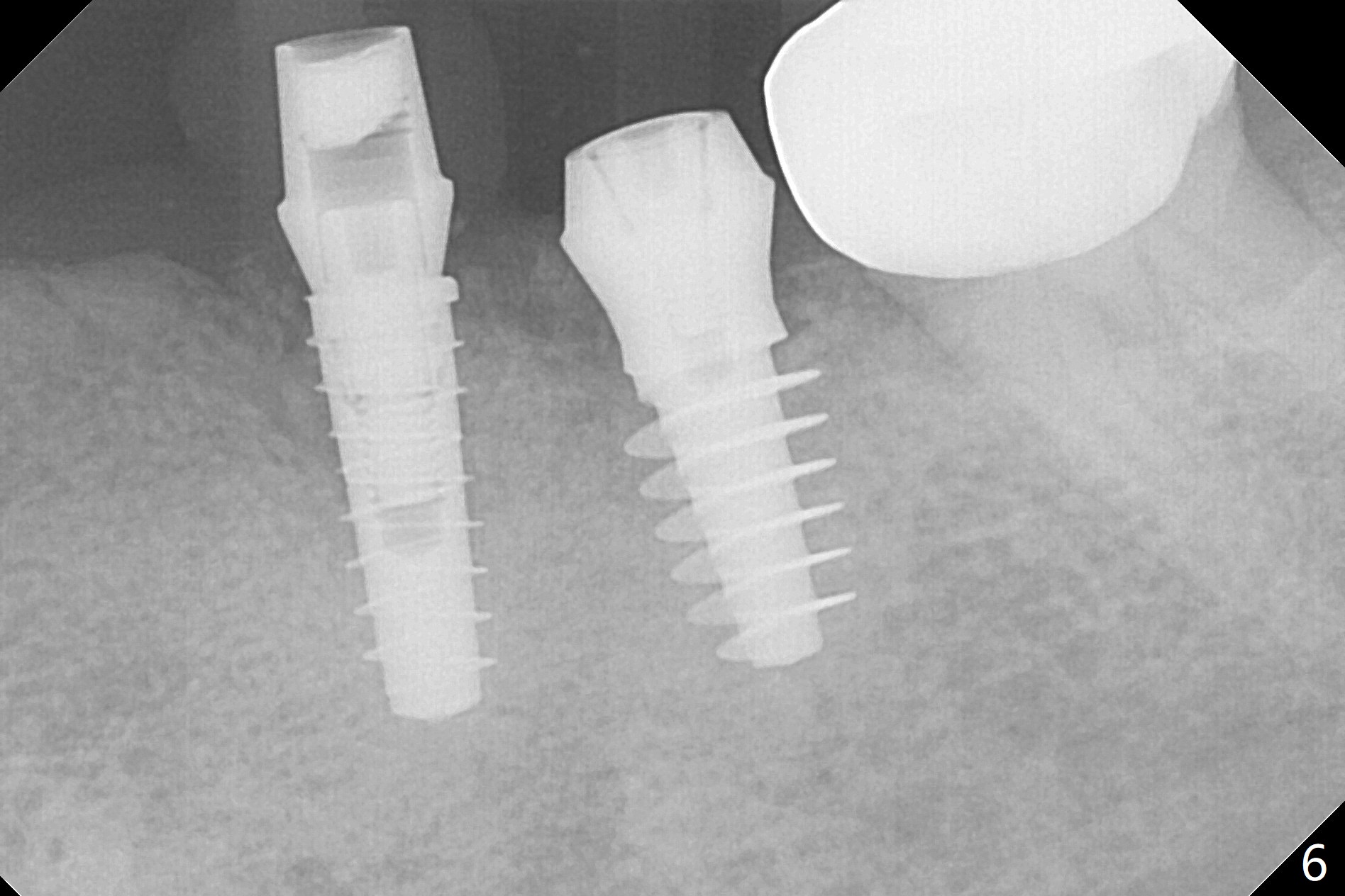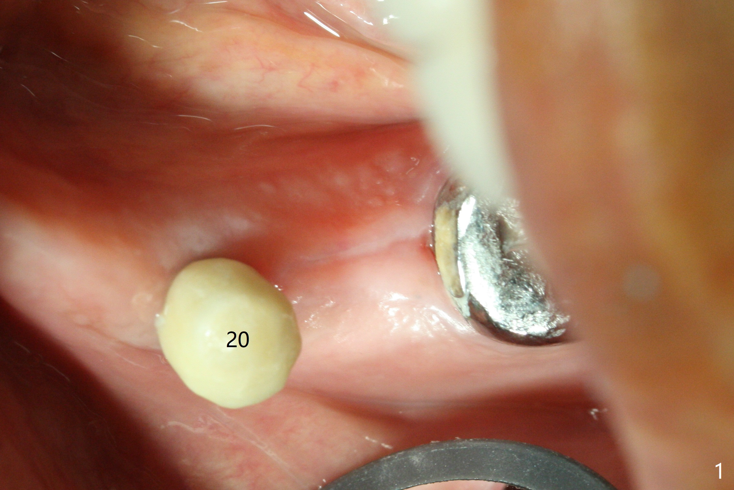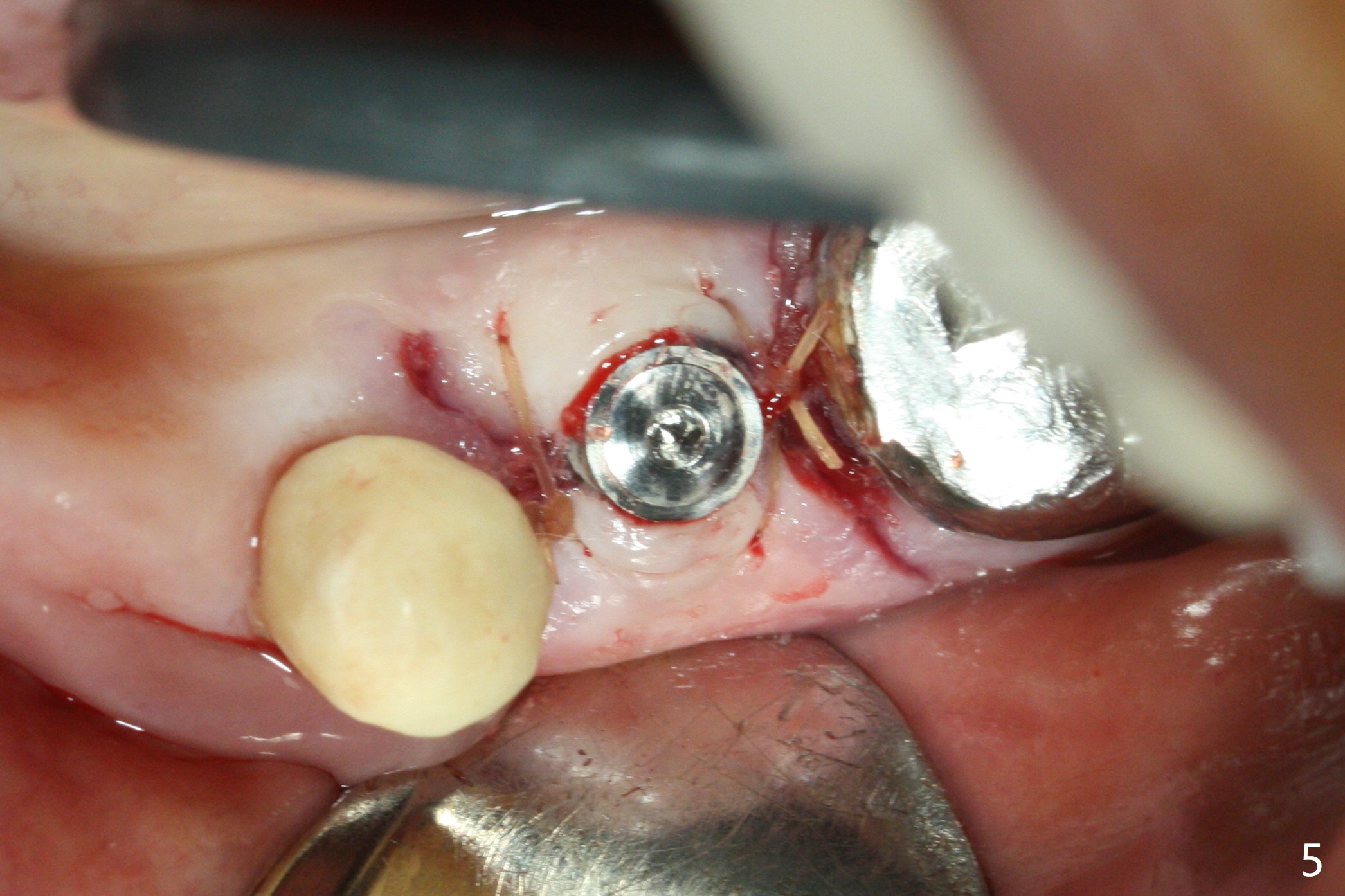 In fact the ridge at #19 is wide (Fig.1); there is enough bone to place a 5 mm implant (Fig.2 (5 mm implant positioner)). The gingiva is 3 mm in thickness. After use of Marking Drill, 5.3 mm Magic Drill (MD) for 9 mm and 4.8 mm MD for ~10 mm, a 5.5x9(3) mm Magicore is placed with primary stability, but too deep. When the implant is reversed, stability loses. After the autogenous bone from bone core is placed in the osteotomy, stability restores to a certain degree (Fig.3); there is no occlusal clearance when a 4.3x3 mm solid abutment is placed. Vera graft is placed around the implant (Fig.4 *) and a healing screw is placed (Fig.4,5).