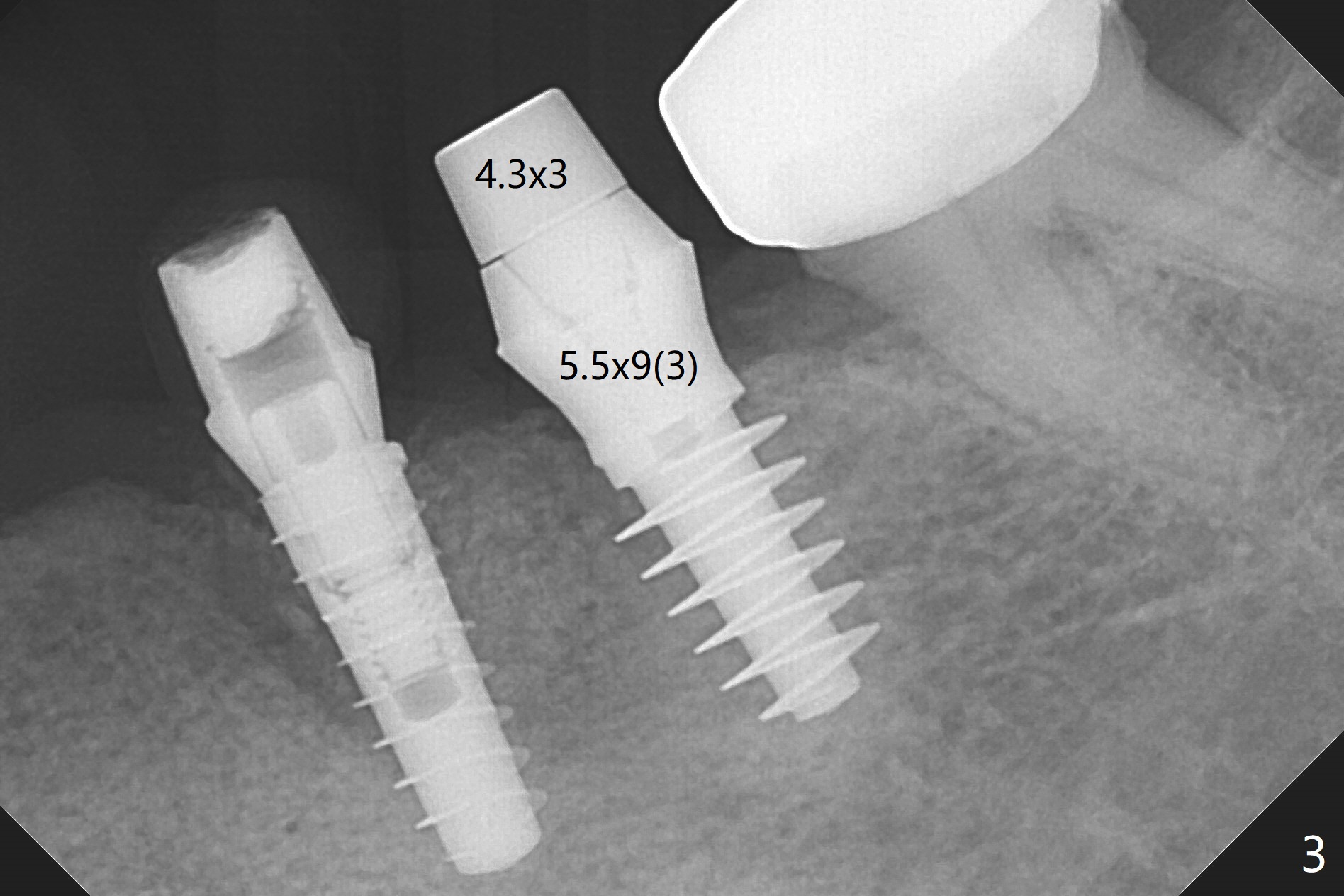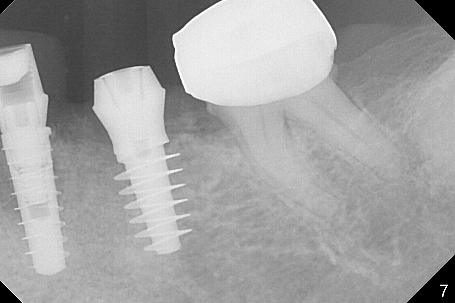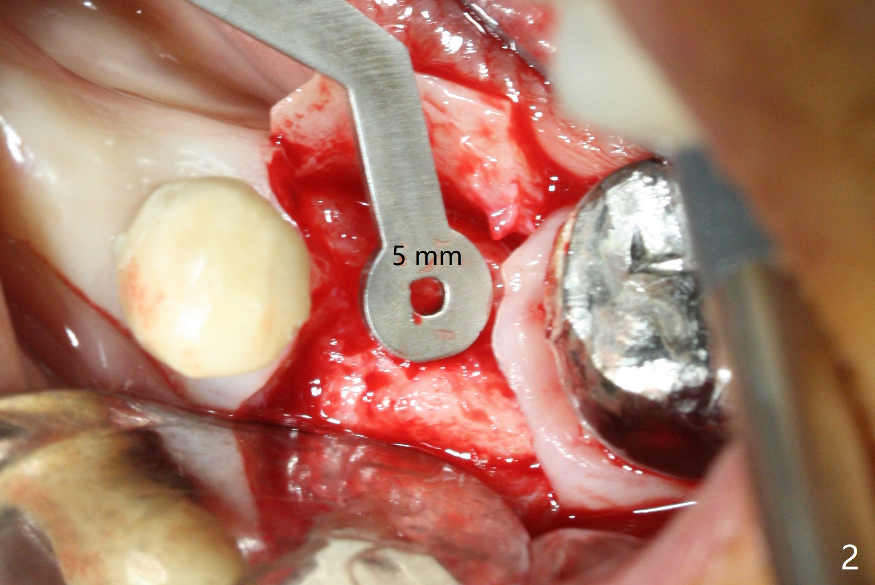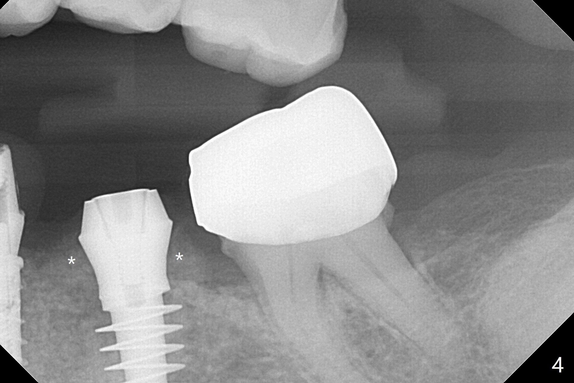 In fact the ridge at #19 is wide (Fig.1); there is enough bone to place a 5 mm implant (Fig.2 (5 mm implant positioner)). The gingiva is 3 mm in thickness. After use of Marking Drill, 5.3 mm Magic Drill (MD) for 9 mm and 4.8 mm MD for ~10 mm, a 5.5x9(3) mm Magicore is placed with primary stability, but too deep. When the implant is reversed, stability loses. After the autogenous bone from bone core is placed in the osteotomy, stability restores to a certain degree (Fig.3); there is no occlusal clearance when a 4.3x3 mm solid abutment is placed. Vera graft is placed around the implant (Fig.4 *) and a healing screw is placed (Fig.4,5).