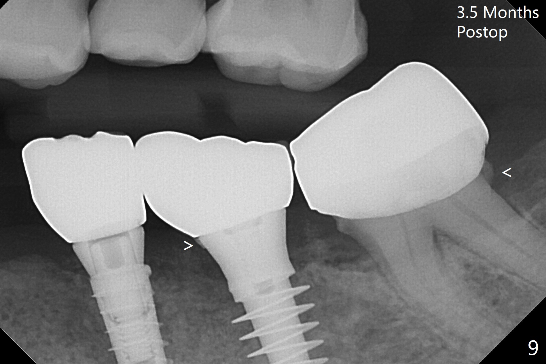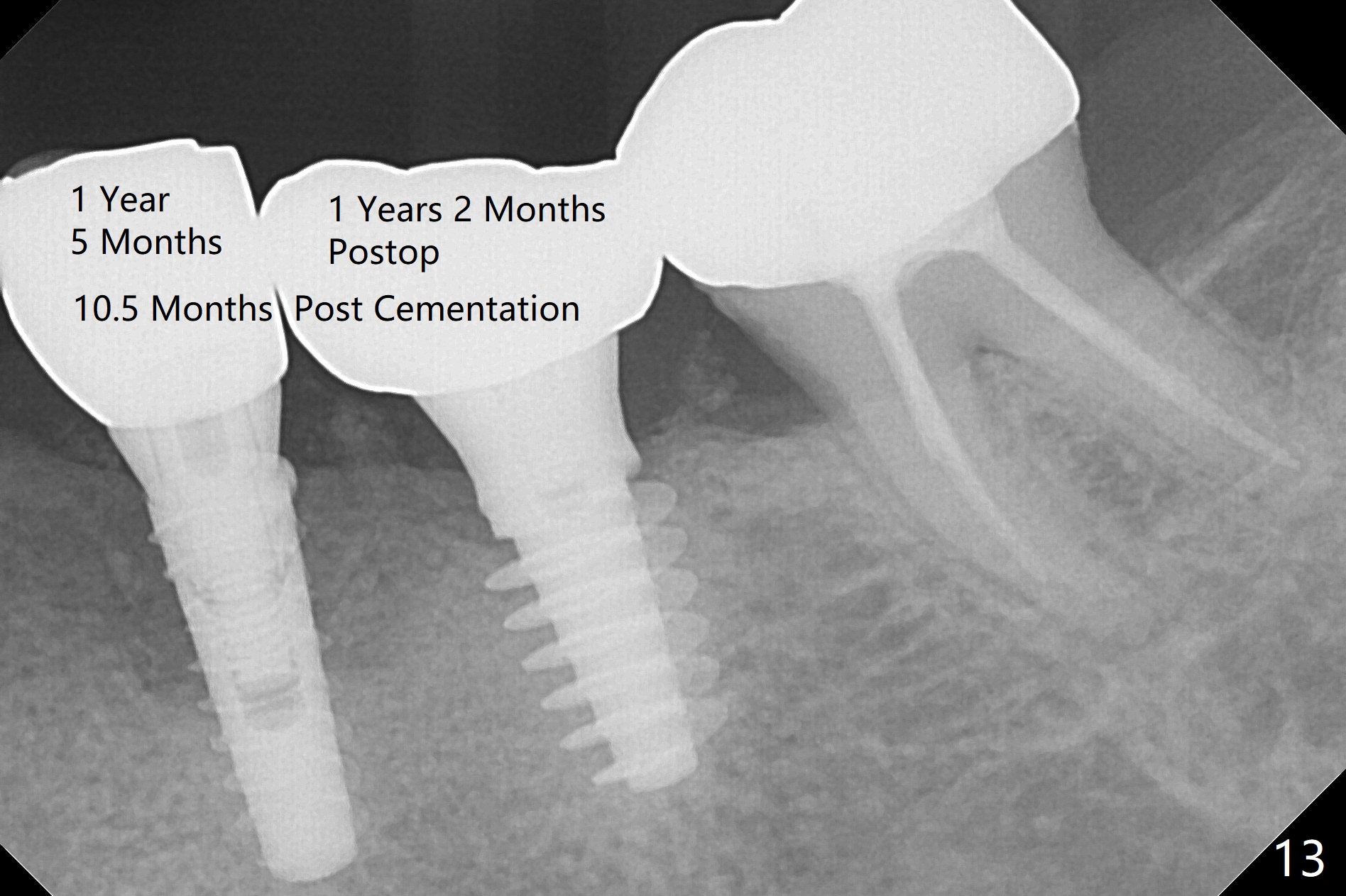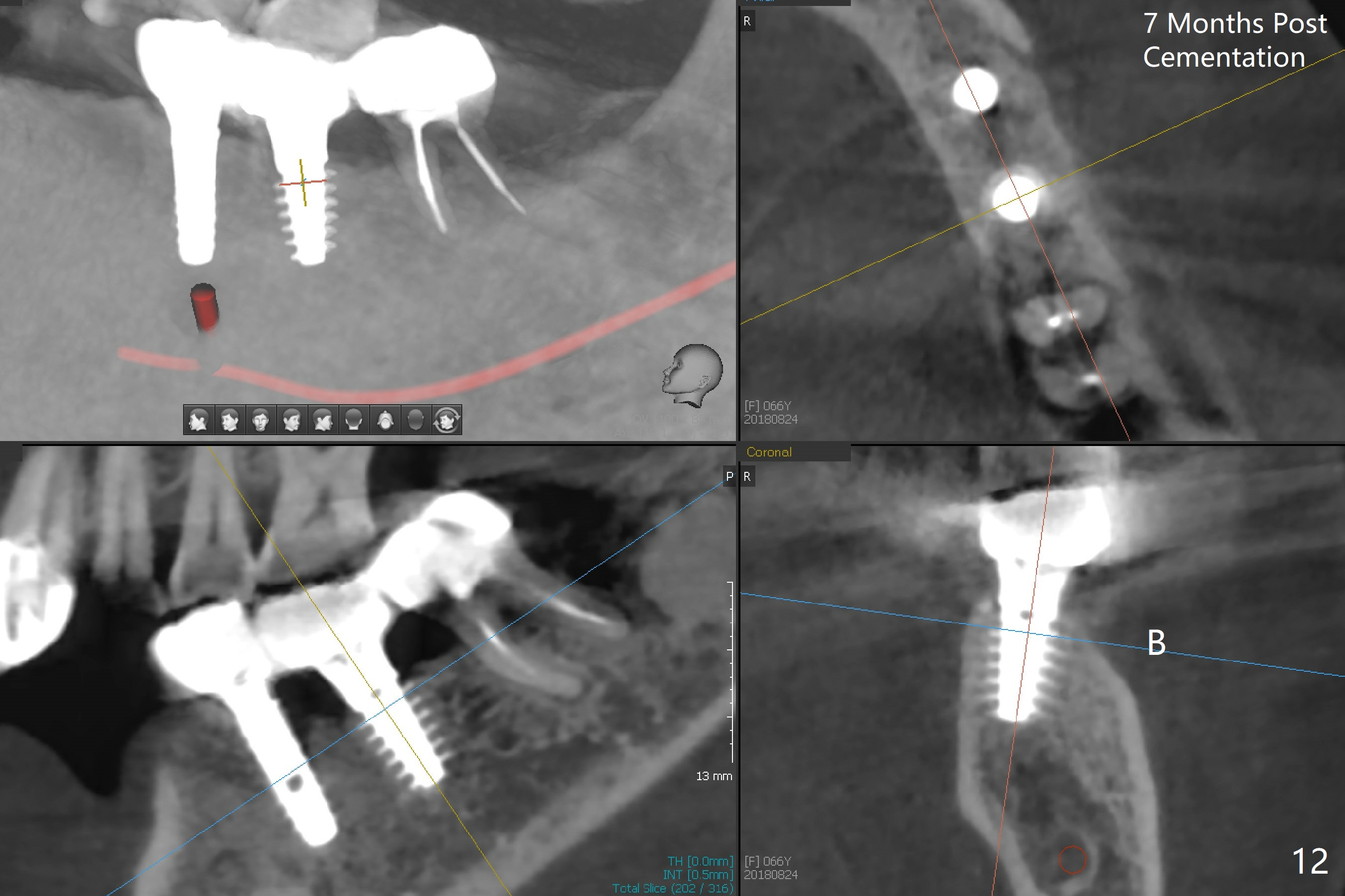 There is no bone loss at #20 or 19 six and 3 months postop, respectively (Fig.6,7). After placing and trimming a 4.3x3 mm Magicore solid abutment, impression is taken (Fig.8). After cementation for #19 and 20 crowns, the crown of #20 is removed for cement removal; attention is paid to cement removal around the crown at #19. In fact, the removal is ineffective with the crown of #20 is reseated and retightened (Fig.9 >). Repeated removal proves to be futile (Fig.10 >). The most effective method will be to take X-ray immediately after #20 crown removal and reseating without torque so that it will be easier to remove the remaining cement if needed. It may be ok in term of hygiene, since proximal brush is used daily. While the crowns at #18 and 19 are being redone because of food impaction, the tooth #18 needs RCT; the Magicore seems to have no bone loss 4 months post cementation (Fig.11). CBCT shows that the Magicore seems to have been placed in the middle of the crest 7 months post cementation (Fig.12 (B: buccal)). The gingiva at #19 is apparently healthy 8 months post cementation. The crown at #19 is recemented 10.5 months post cementation (Fig.13).