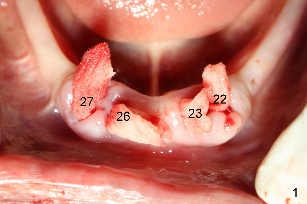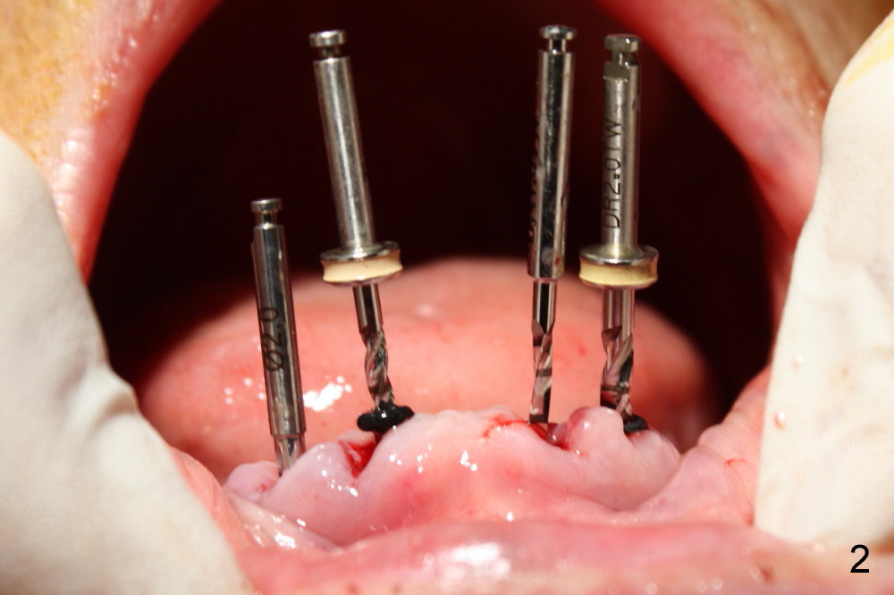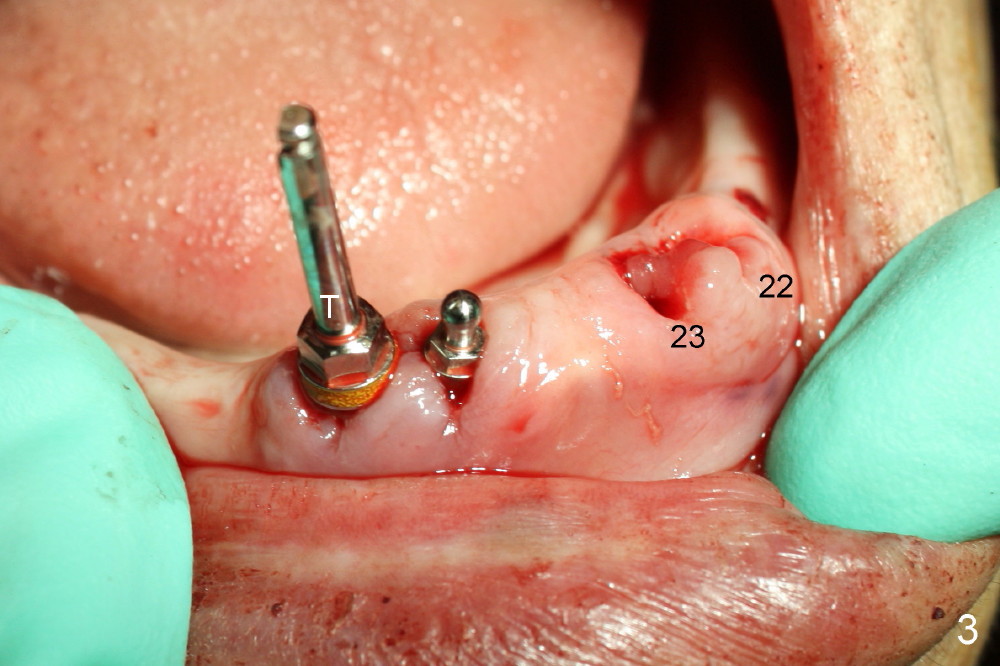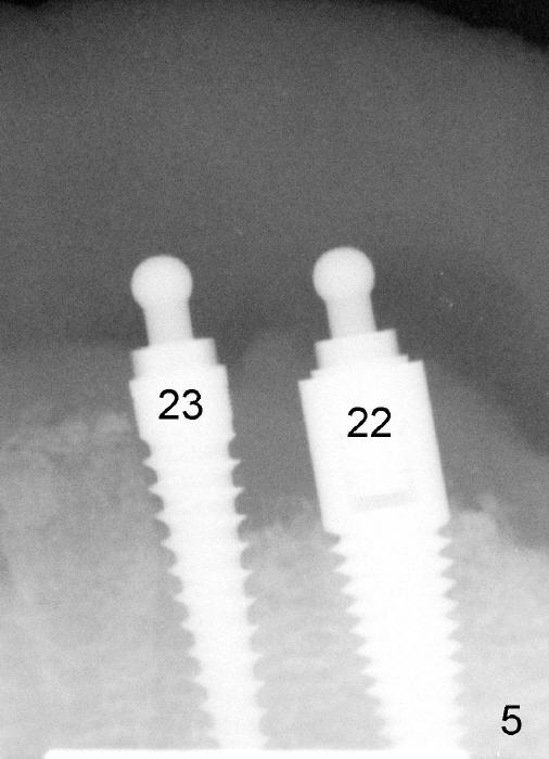 Following tooth extraction, the sockets are thoroughly debrided and packed with Clindamycin gauze (Fig.1: #22,23,26,27). PA is taken when 1.5 mm pilot drills are placed in the lateral incisor sockets and 2.0 mm in the canine sockets (Fig.2). Fig.3 shows that 4.5x17 mm tap (T) is placed in the lower right canine region, while 3.5x17 mm one piece implant is placed in the lower right lateral.