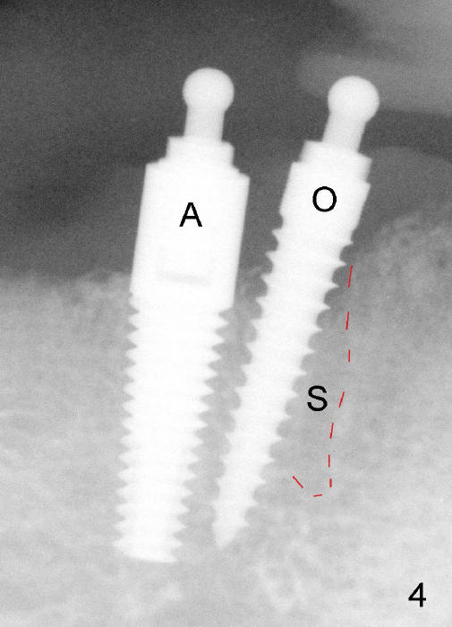 Fig.4 shows a ball abutment (A) is inserted to a 4.5x17 mm tapered implant at the site of the tooth #27. In fact, the one piece implant (O) deviates distally. S stands for the original socket.