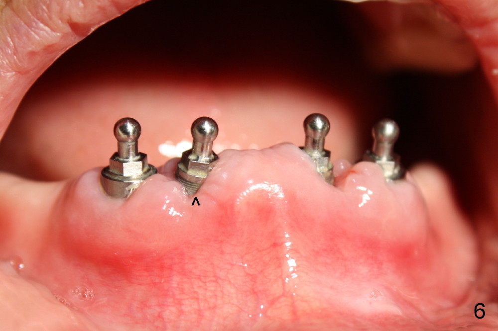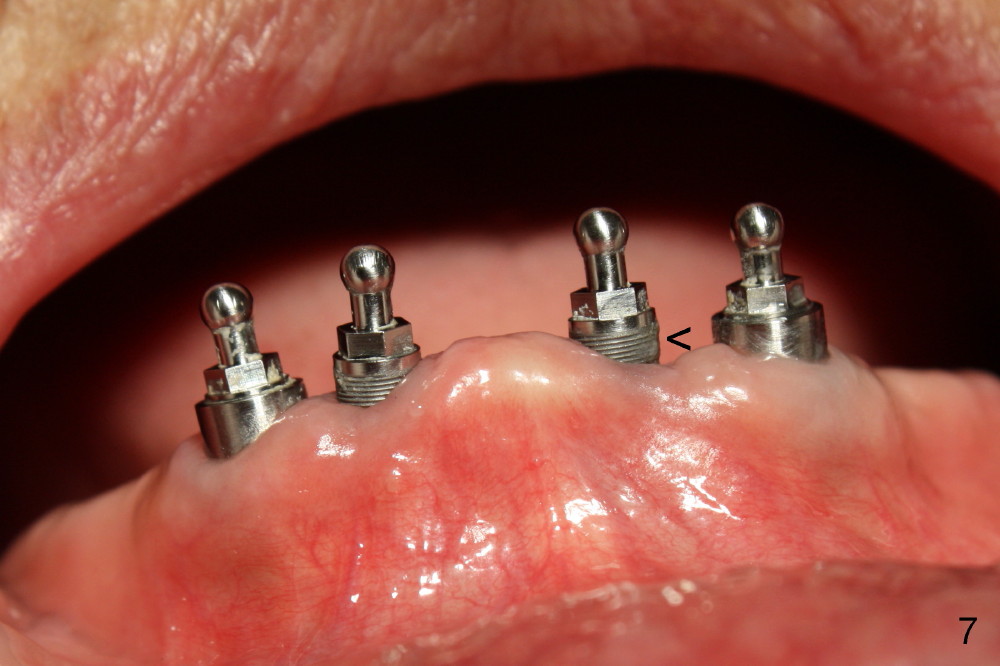 These difficulties are related to limited socket exposure during osteotomy. The threads of the implants (<) are exposed as early as one week postop (Fig.6) and last 4 months postop (Fig.7). Immediate difficulty is that a lot of acrylic has to be removed to accommodate the balls. In one word, restorative space is not wide enough. Raising flaps with alveoloplasty prior to osteotomy could solve the problems (Fig.4,5).