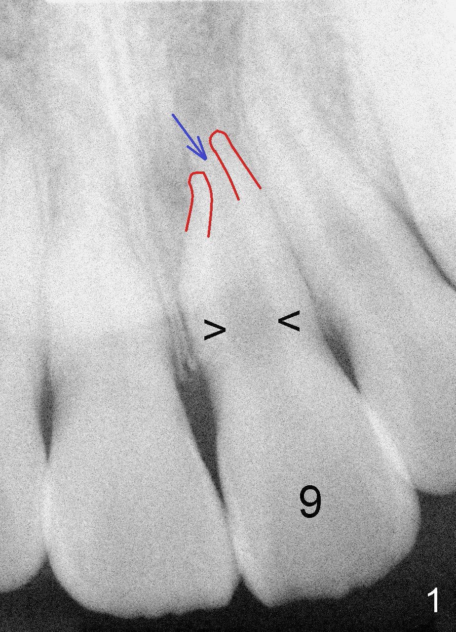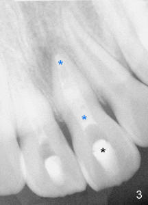 calcium hydroxide paste (Fig.3: blue *) in the root canal system for one week. Place a