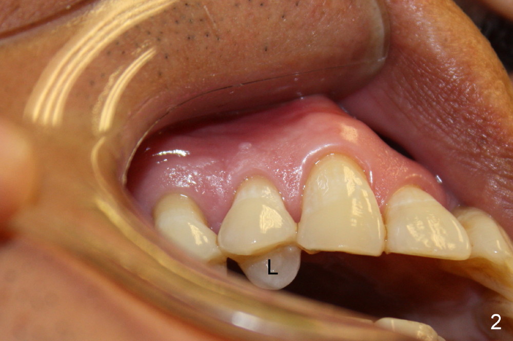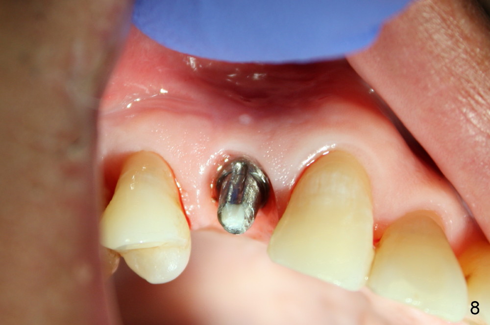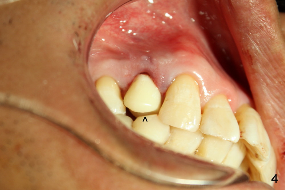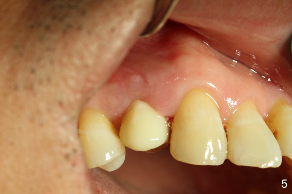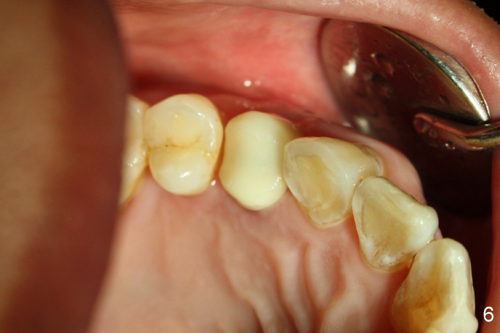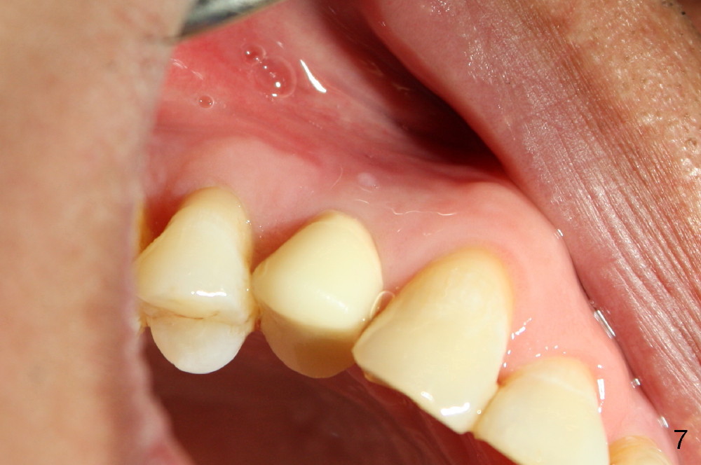 Five days later, the gingiva around the provisional returns to normal color (Fig.5,6, as compared to Fig.3,4). There is minimal postop pain in spite of difficult exodontia.