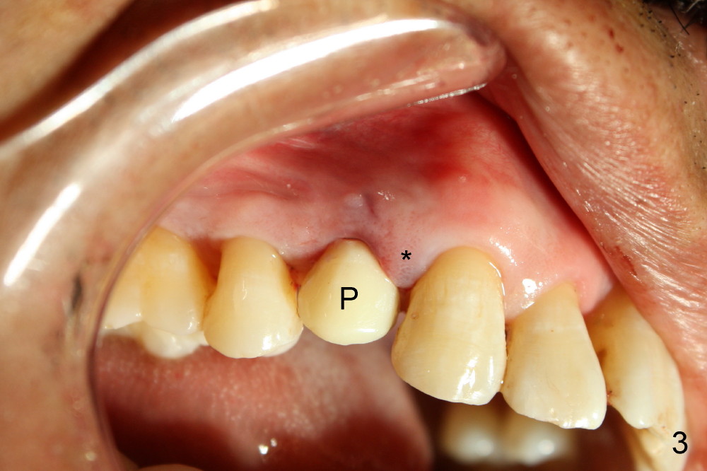A provisional is fabricated immediately after extraction and implant and definitive abutment placement (Fig.3,4: P). The provisional hold the papilla in place (Fig.3 *). There is no occlusal contact with the opposing dentition (Fig.4 ^). The gingiva looks purplish due to difficult extraction. The tooth keeps fracturing while being extraction. The bone is dense. On the other hand, the dense bone helps achieve primary stability of the implant.