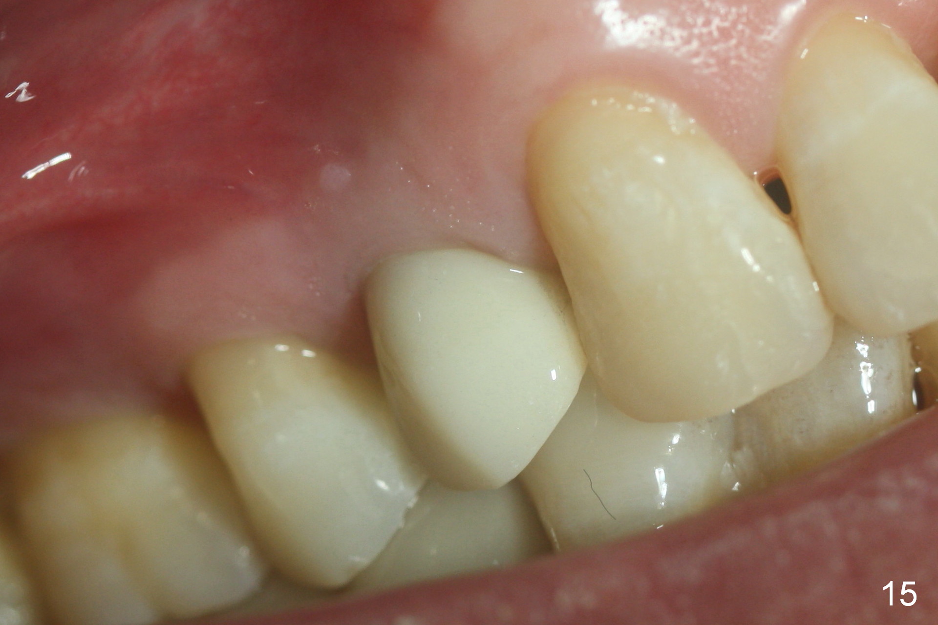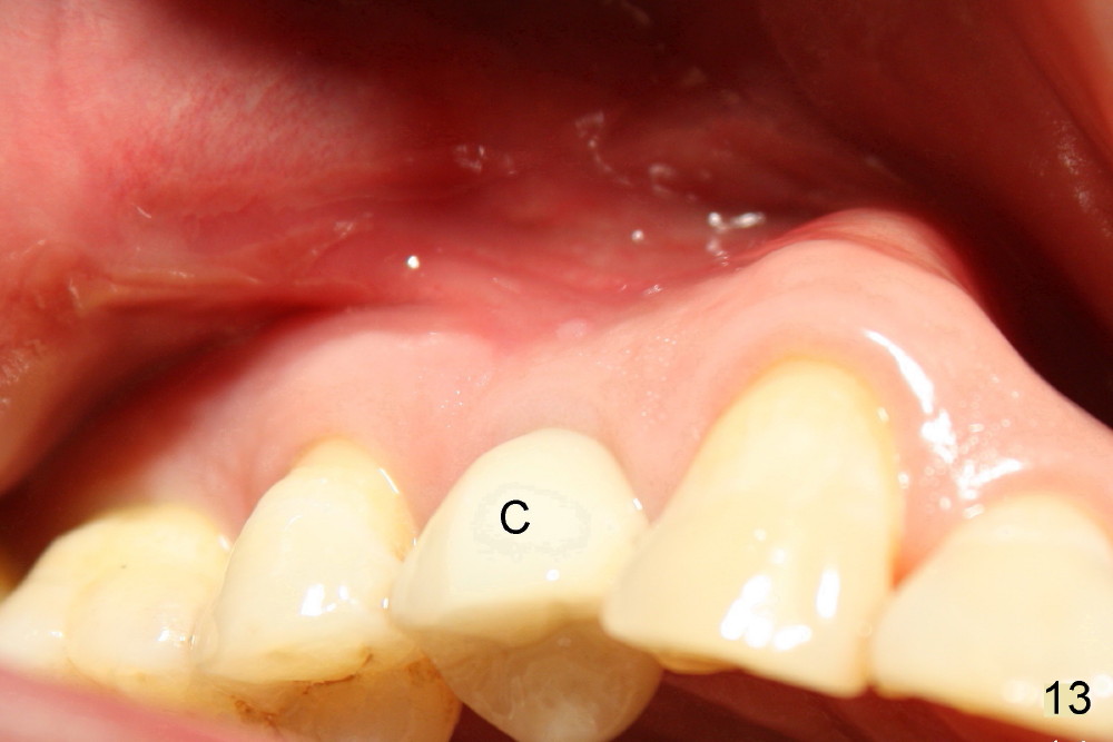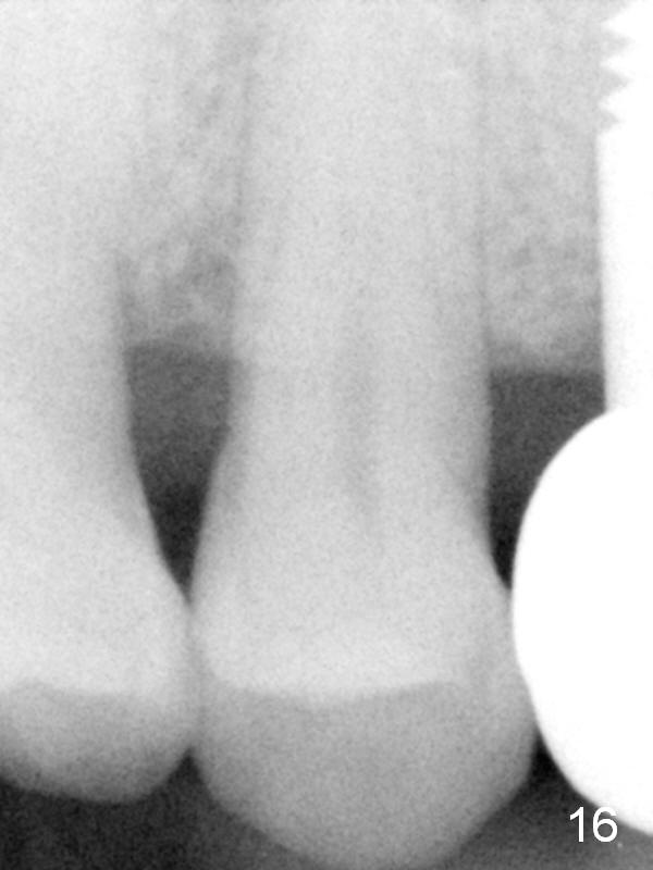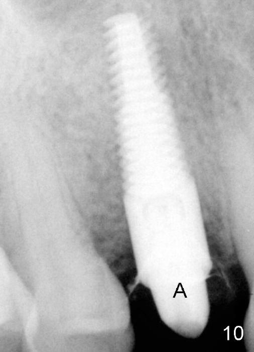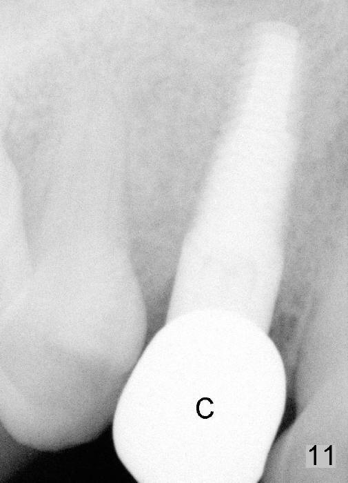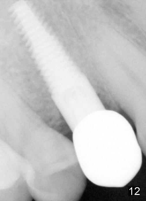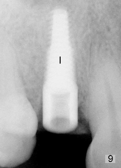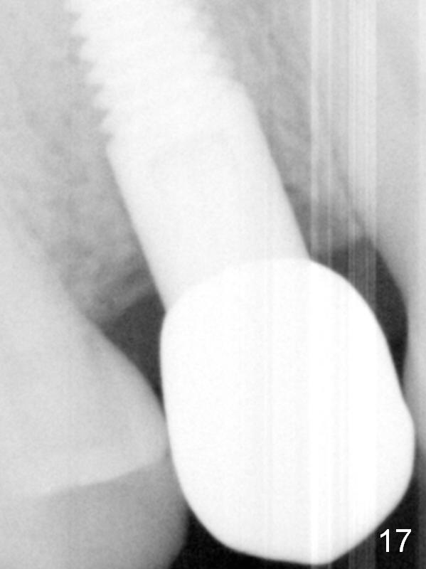 The patient returns 6 months postop for impression of a permanent restoration. The gingiva with knife-edged papillae adapts to the provisional (Fig.7). The gingiva looks healthy when the provisional is removed (Fig.8). The buccal bone resorption seems to be minimal, as compared to Fig.1,2. There is no bone loss between immediately postop (Fig.9 I; implant), 4.5 months postop (Fig.10 A: abutment), 4 and 7 months post cementation (Fig.11,12 C: crown). Soft and hard tissue morphology remains normal 7 months post cementation (Fig.13). No bone loss is observed 15 months post cementation (Fig.14). The papillae (Fig.15) and bone (Fig.16,17) remain stable 29 months post cementation.