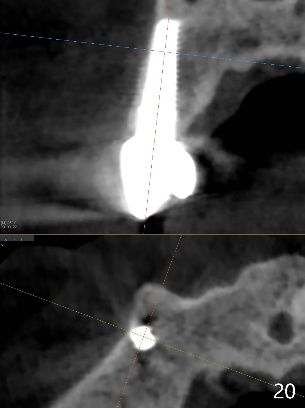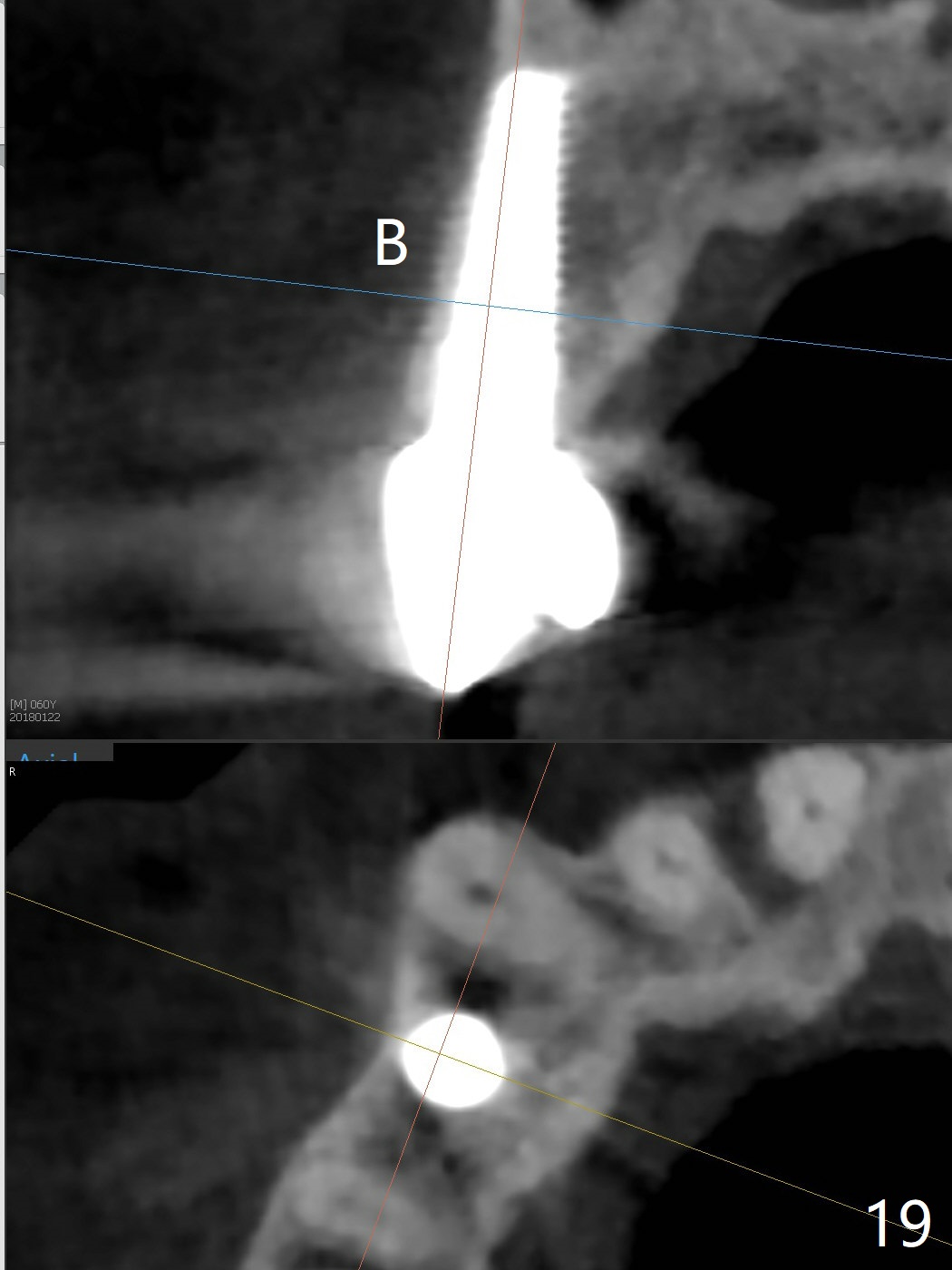 The long implant seems to be appropriate for the patient with periodontitis and bruxism (Fig.18, 2 years, 10 months post cementation). The implant appears to be placed buccally (B, Fig.19,20 (CBCT coronal and axial sections), 4 years, 5 months post cementation).