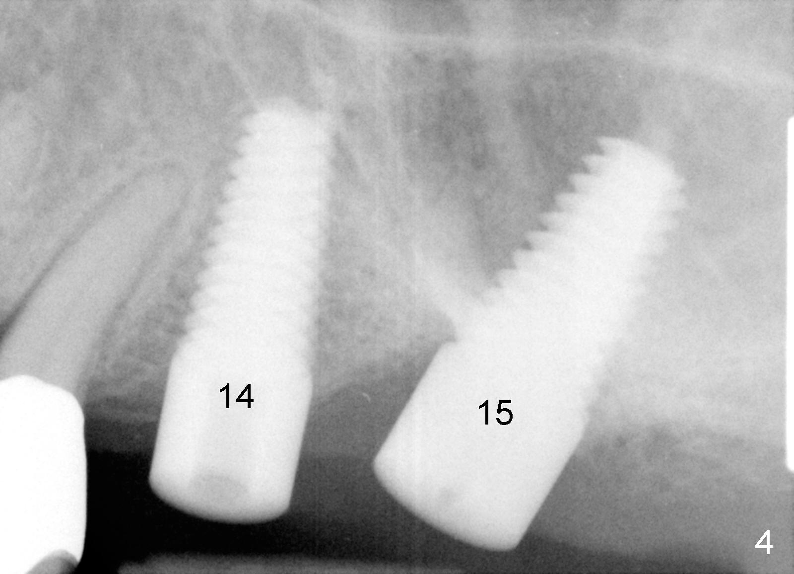 The implant at the site of #14 turned out to be not parallel to the tooth #13 (root) or the implant at the site of #15 (Fig.4), when the retainer (crown) of #13 was used as surgical guide.