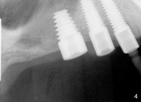 In fact, healing screws had been removed (Fig.1). There is space inside the well of the implant #5 and less obvious in that of #3 (because its wall is thicker). When implants tilt, the opening of the wells is visible (Fig.2-4).