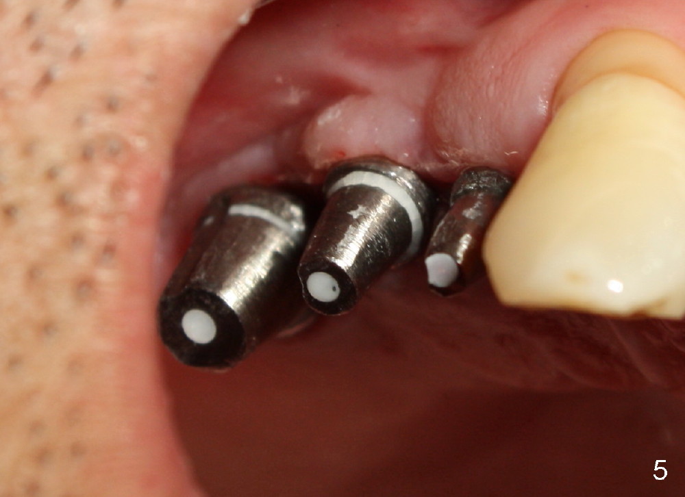 Implants at the site of #3 and 5 were placed for Kent a month earlier. Immediately before placing a third one in between, something had been done for the first two implants in preparation for guidance. Can you guess what that is?