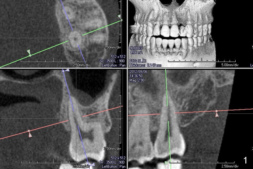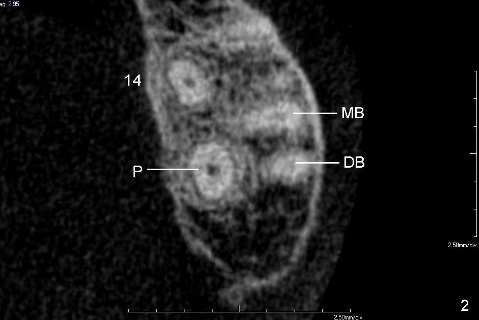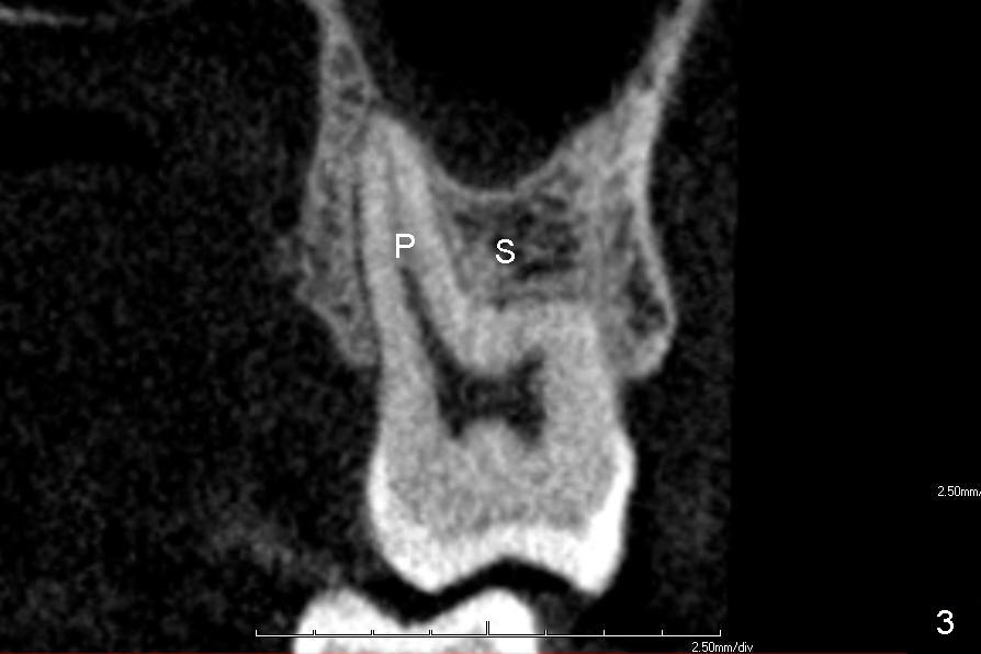 A 60-year-old man requests replacing the teeth #2 and 3, which have root fracture. Both of these two teeth have 3 roots (palatal (P), mesiobuccal (MB) and distobuccal (DB) (X-ray not shown). CT images from a different patient are used instead (Fig.1-3). The upper left image of Fig.1 (i.e., Fig.2) is an axial section, lower left (Fig.3) coronal and lower right sagittal.