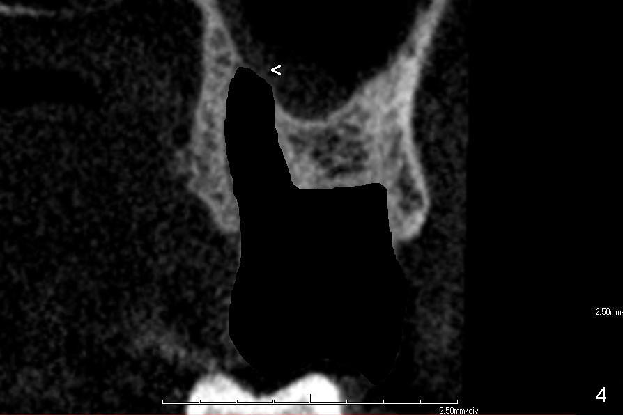 One of these two teeth is to be extracted first (Fig.4). Granulation tissue is removed, followed by copious irrigation. The socket morphology is studied. The apicobuccal aspect of the palatal socket is so thin that it may be perforated during tooth extraction and/or bone expansion mentioned below (Fig.4 <). Clindamycin gauze is placed in the extraction socket while the other tooth is being extracted.