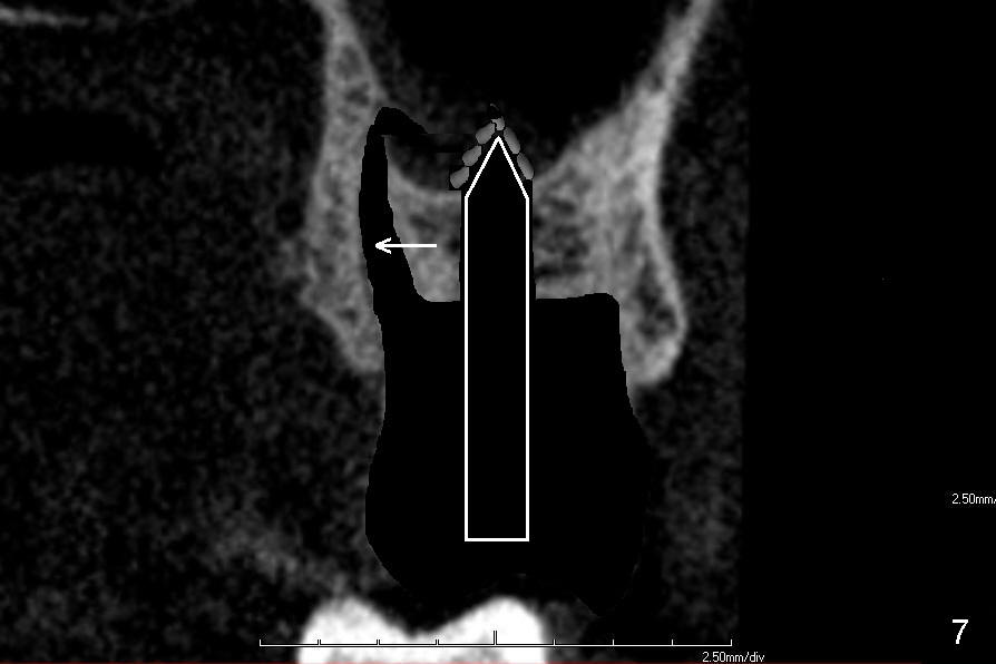 If the septum is small or destroyed by the infection, an implant will be placed in the palatal root (Fig.5), since it is the biggest among these 3 roots (Fig.2). The advantage is that the implant is longer than that placed in the septum (Fig.8). The drawback is that the implant is off center (Fig.5, as compared to that placed in the septum (Fig.8)). The implant placed in the palatal socket is relatively small in diameter. The whole socket will not be occupied by the implant. Collagen membrane will be used to help close the socket as well as bone graft.