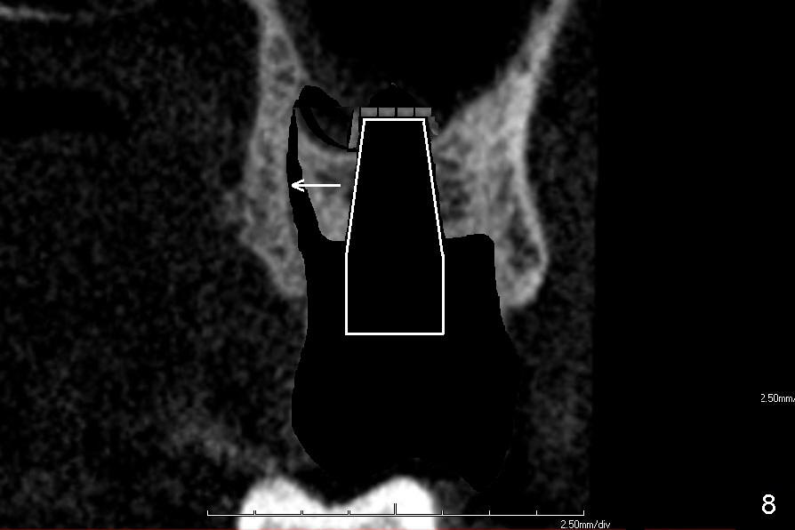 If the septum is not so bad in size, osteotomes (RT series) will be used to expand it (to obliterate 3 sockets) and finish sinus lift to increase implant length if bone is not too hard to manipulate (Fig.6,7). Osteotomy is finished by using proper size and length of taps. Finally a large, but relatively short implant is placed in the septum (Fig.8). Arrowheads in Fig.6-8 indicate that as osteotomes are driven in sequentially (Fig.6,7 white box) and the implant is placed (Fig.8), bone segment may be moved palatally to obliterate the palatal socket gradually.