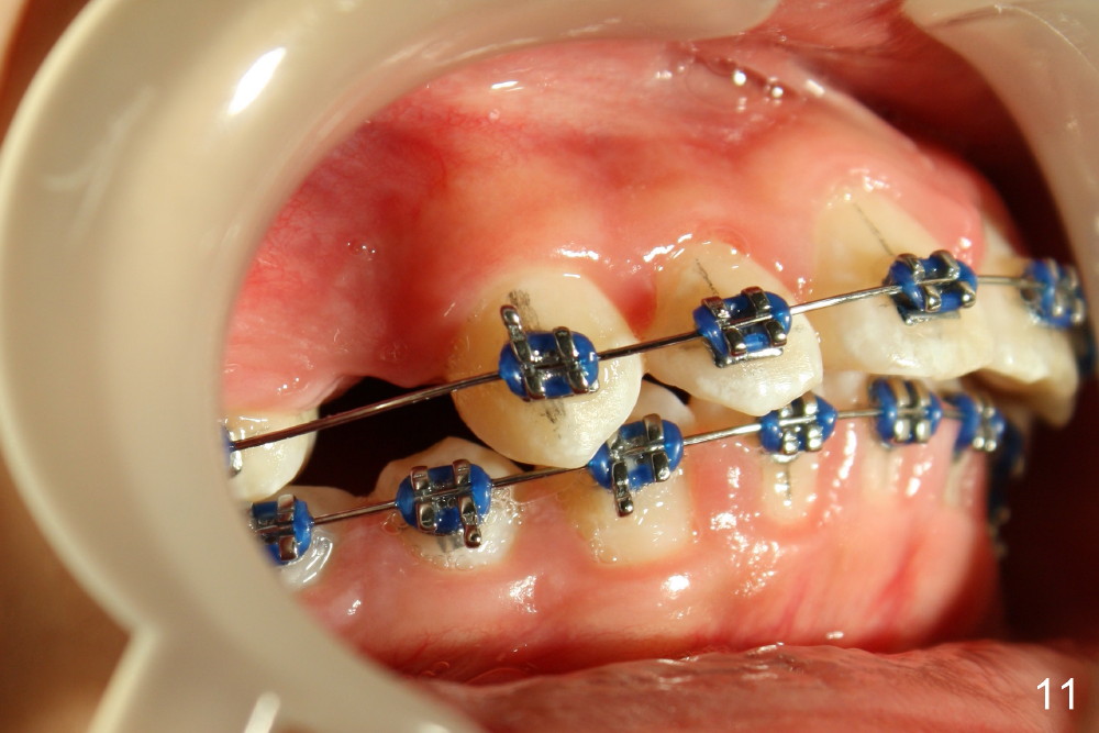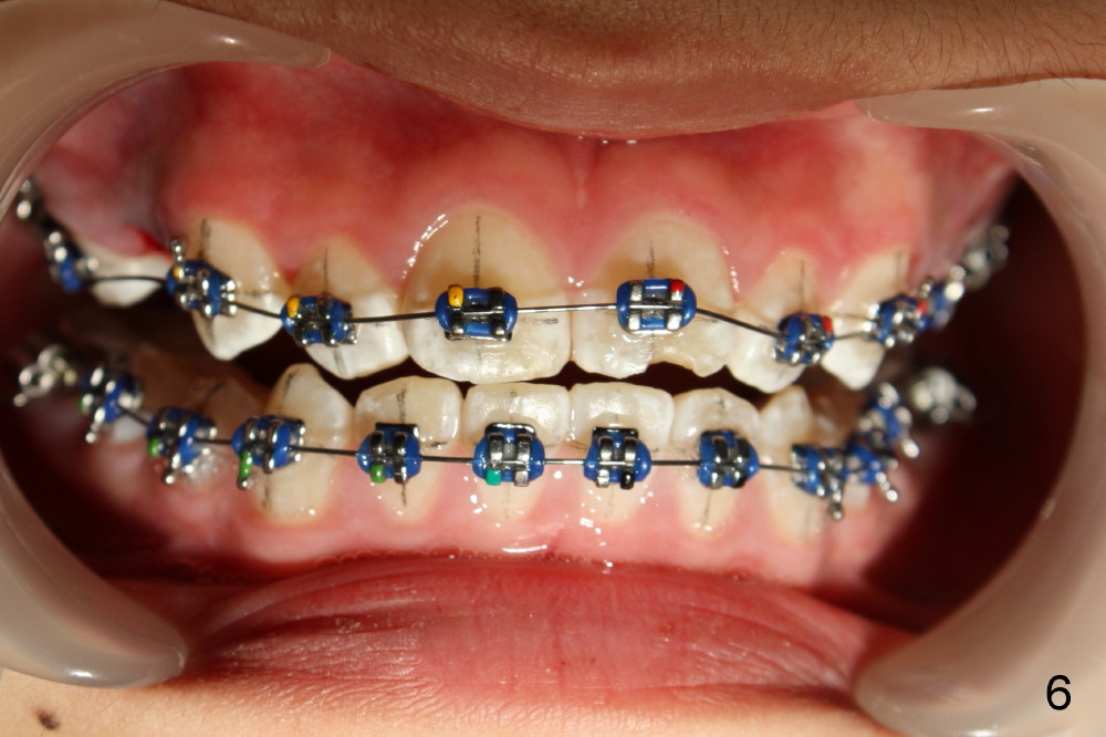 A 12-year-old boy has upper anterior protrusion (Fig.1-3). It is characterized with canine Class II malocclusion (Fig.2,3) and relatively wide crowns of these anteriors (Fig.4). It appears that one of the most efficient treatment modalities is orthodontics with extraction of the upper 1st bicuspids (Fig.3,5,6, photos taken immediately post extraction).
