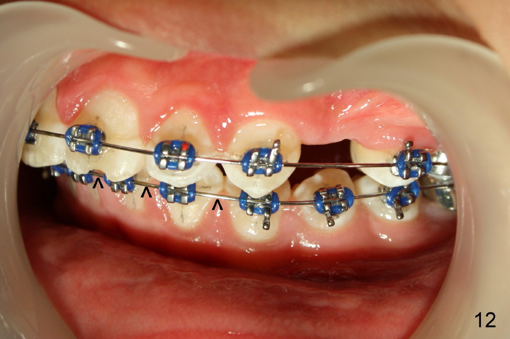 Fig.10-12 are taken 2 months post-banding. There is not enough clearance between the upper and lower incisors to retract the upper ones (Fig.10). At the present moment, the lower incisors have not been intruded, as indicated the upward bending of the anterior segment of the lower .018 stainless steel wire (just placed, Fig.12 ^). As wires become thicker and change to rectangular, the lower incisors will be intruded. There will be space for the upper anterior teeth to move distal using power chain or closed coil springs (see another case).
