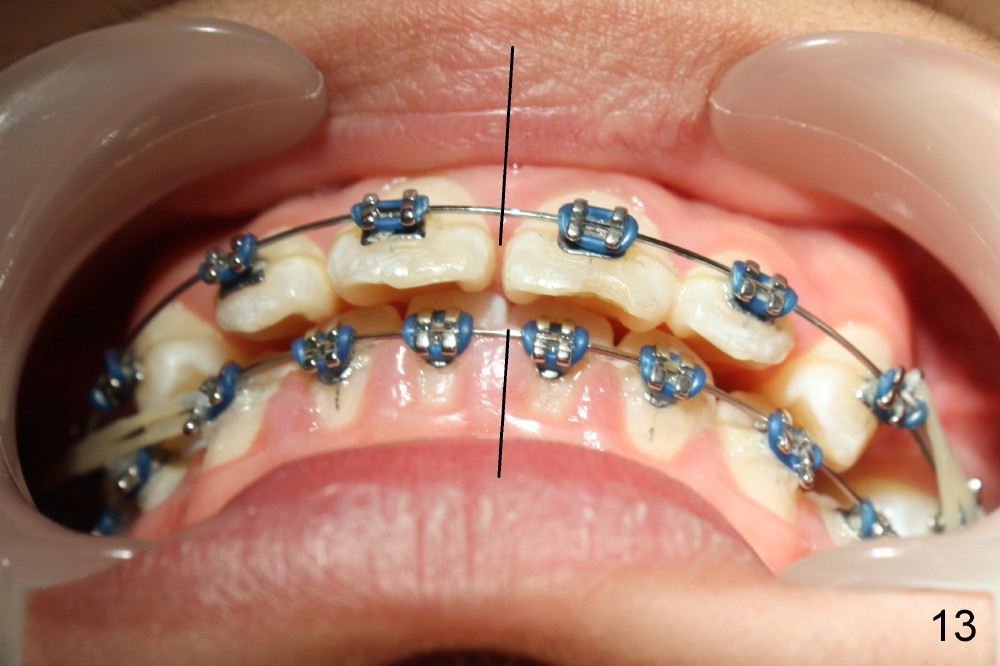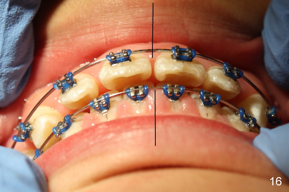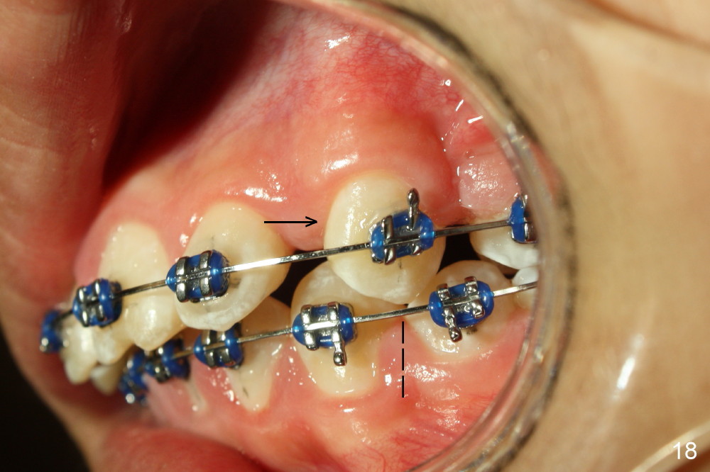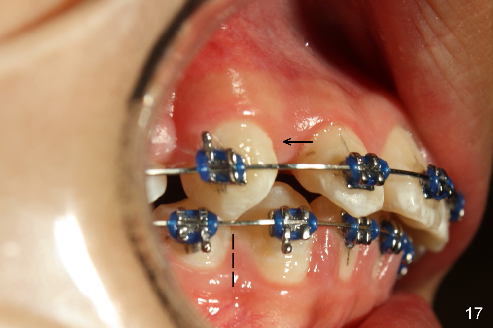 Another month of closed spring, the dental midlines nearly coincide (Fig.16) with diastemata among the upper anterior teeth. U3s move to Class I occlusion (Fig.17,18 dashed lines). .016x.022 stainless wires are placed. Next visit, a posted wire (.018x.025) is placed for the upper arch to retract the upper incisors posteriorly (Fig.17,18 arrows), followed by moving the posterior teeth anteriorly (Fig.14,15 arrows). One-year follow up is shown as follows.