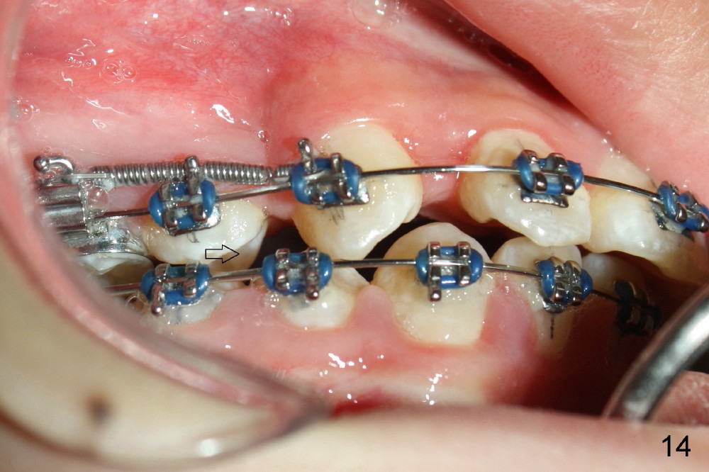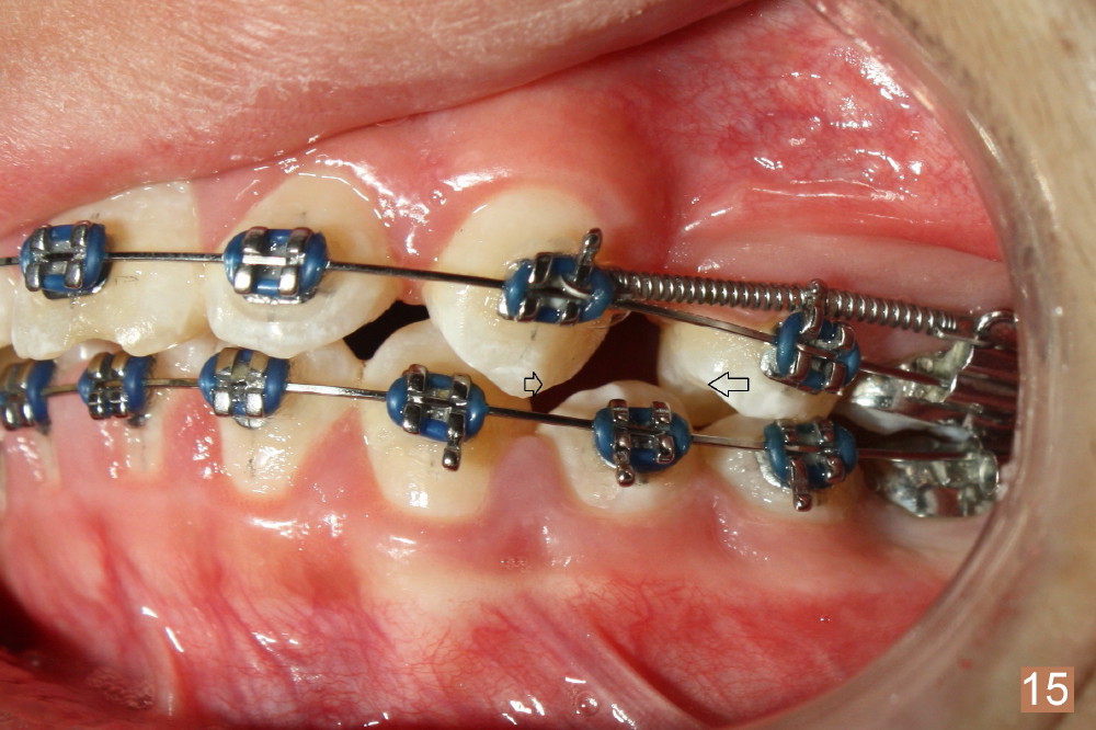 One and a half months after placement of .016x.016 niti wires and closed springs between U3 and 6, UR3 appears to have been over distalized (Fig.14), whereas UL3 needs to be further distalized. Our next main job is to mesialize U5s (Fig.14,15: large open arrows).