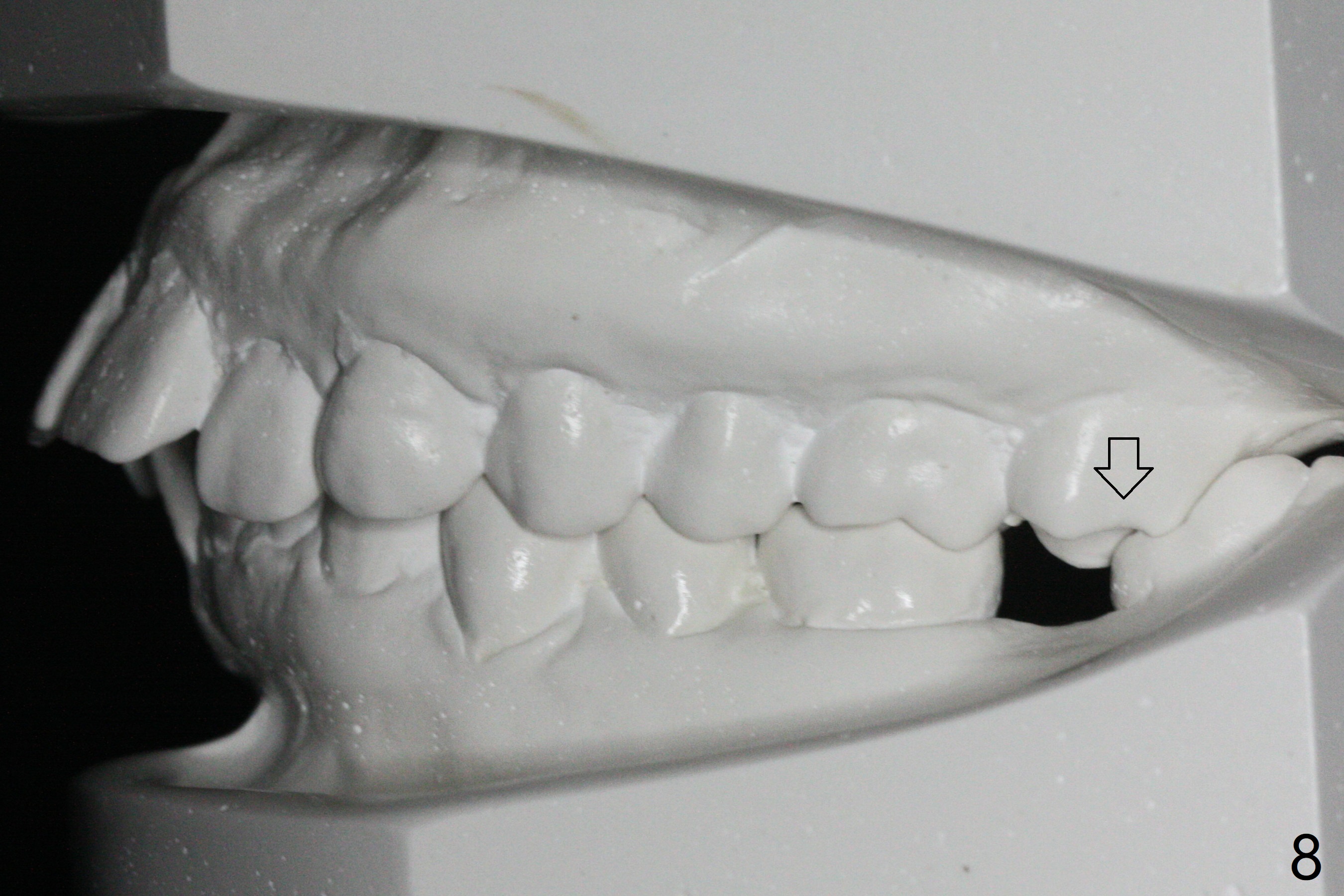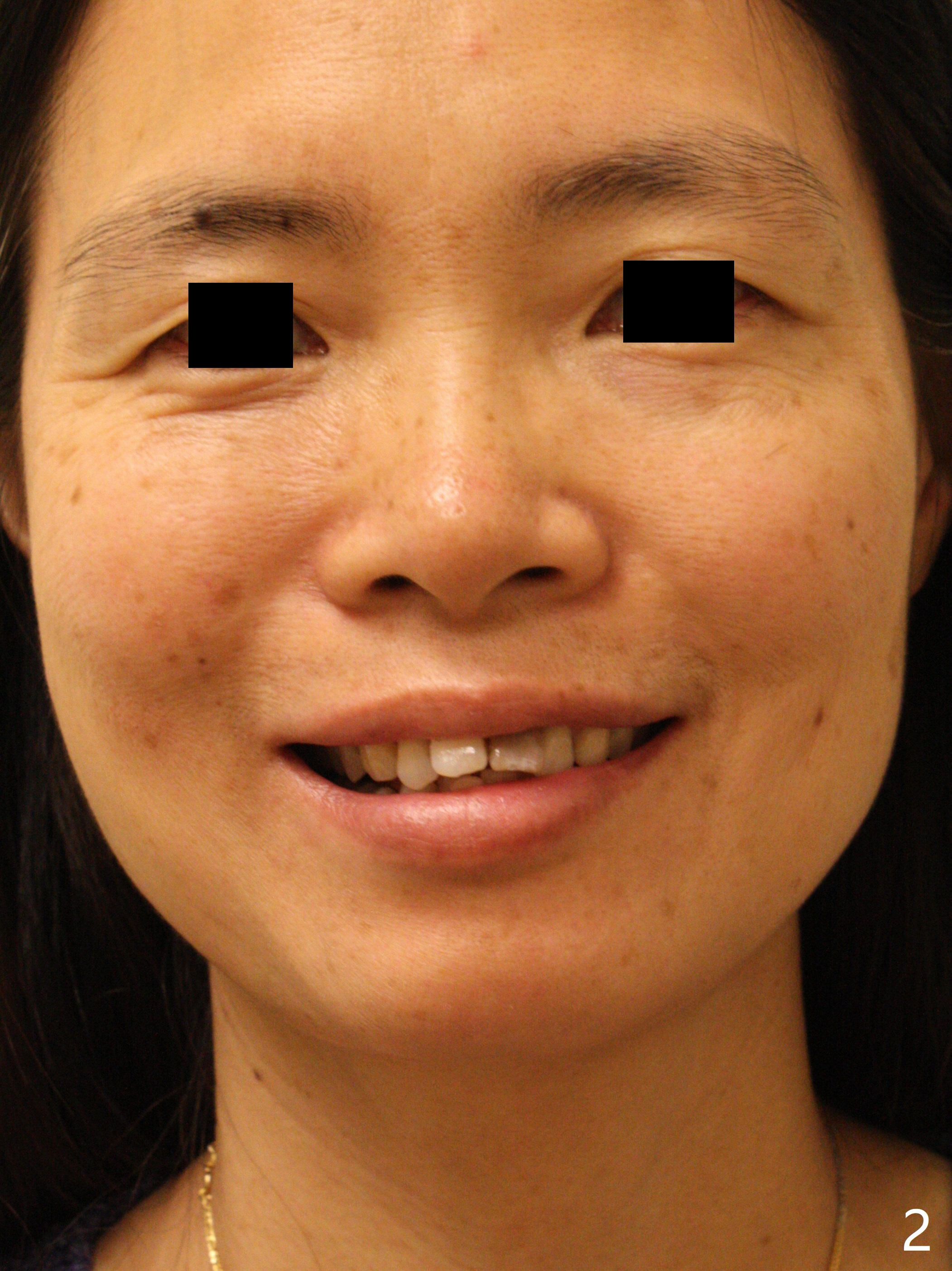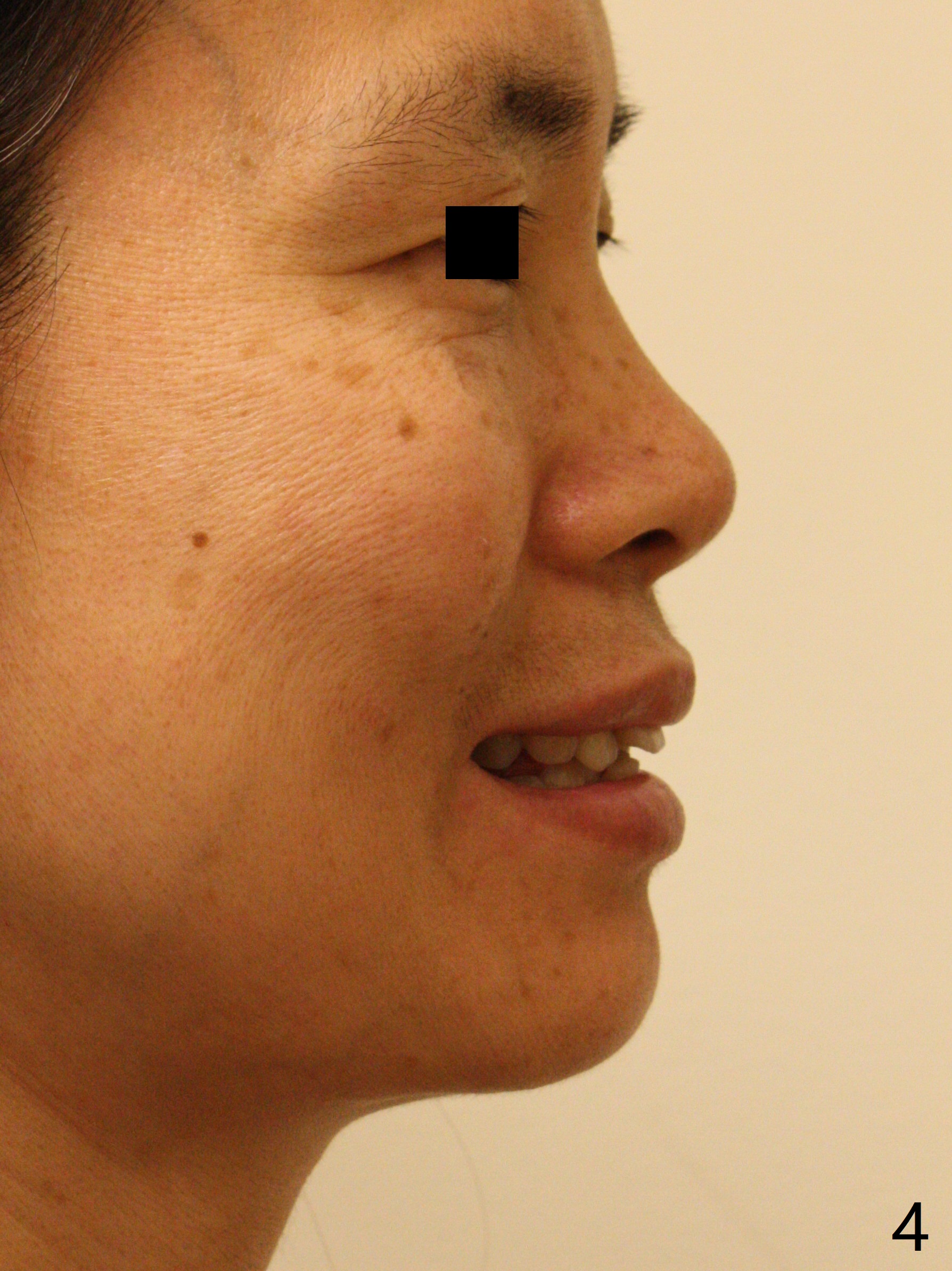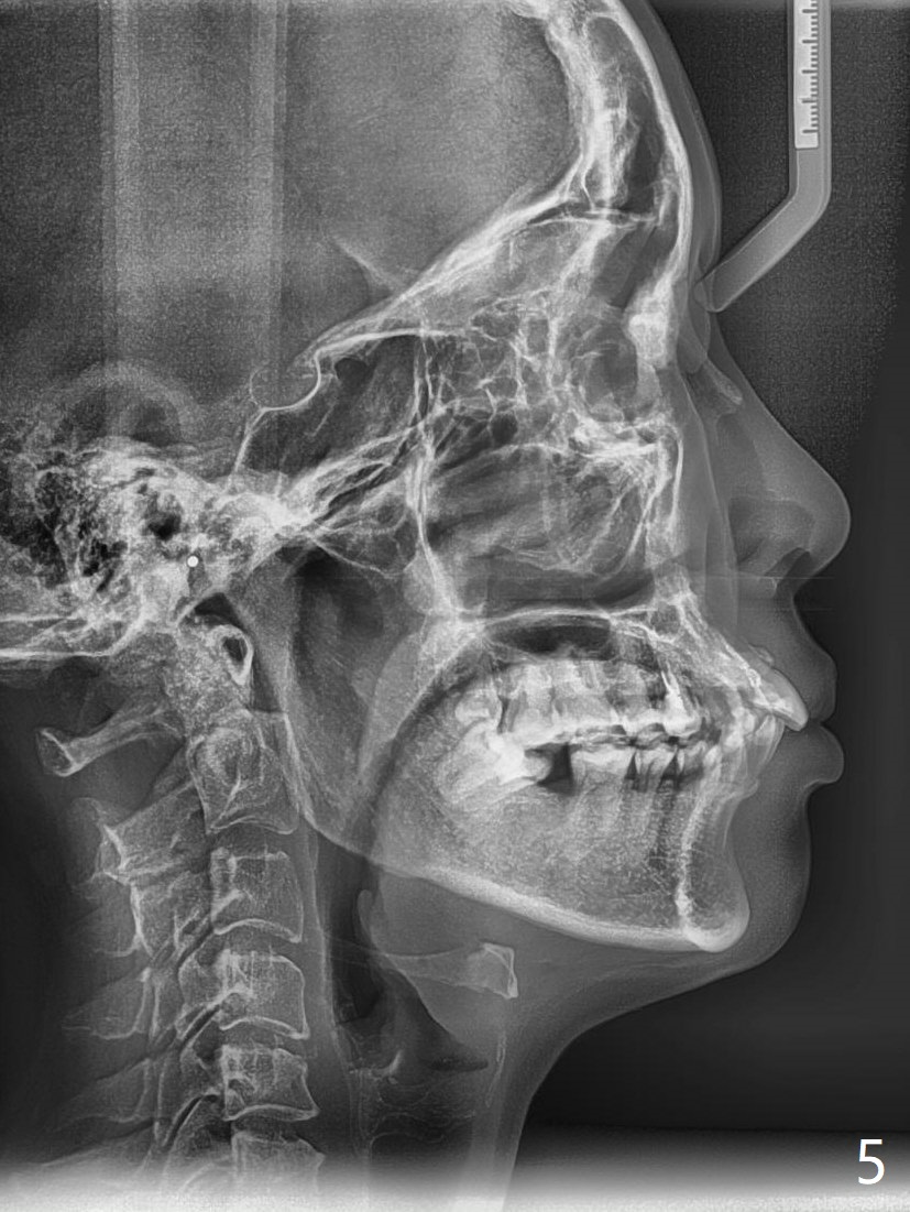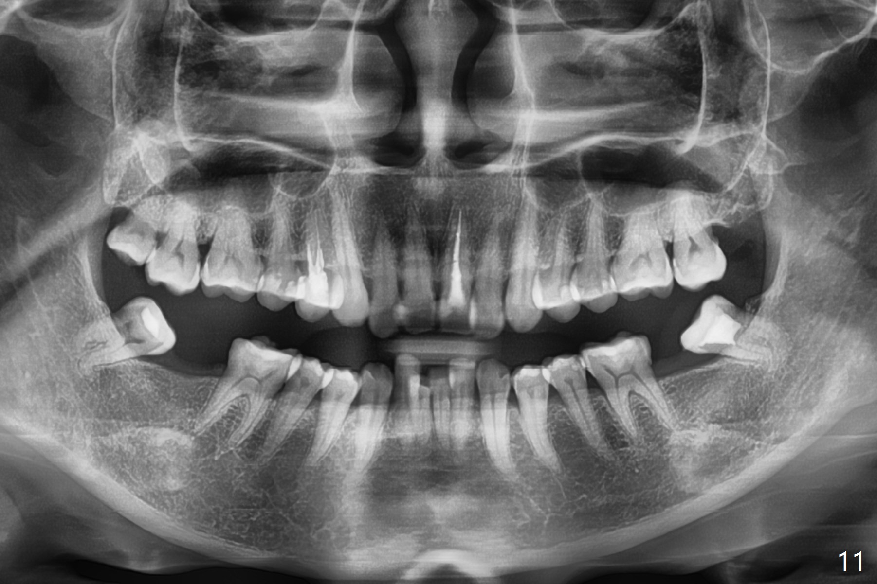 A 41-year-old woman requests ortho, bleach and replacement of 2 lower molars (L7s). The lips are protrusive (Fig.1,3), which is seemingly due to the underlying protrusive anterior teeth (Fig.4,5). Cephalometric tracing shows that SNA and SNB are both 87º (Fig.12), suggesting extraction. When the protrusive teeth are distalized, pay attention to move the upper dental midline to the right (Fig.2). BWs show subgingival calculus. SRP is required. Internal bleaching will be conducted for UL1 (Fig.7,11). Distalization is accomplished with extraction of 2 upper 1st bicuspids and using L8s as anchors so that no implants will be necessary for L7s. But the patient would rather have 2 of the lower 2nd molars for mastication. It appears that extraction of 4 bicuspids is pending (Fig.6-11). Supraeruption of U7s (Fig.6,8 arrows) will be corrected with banding.