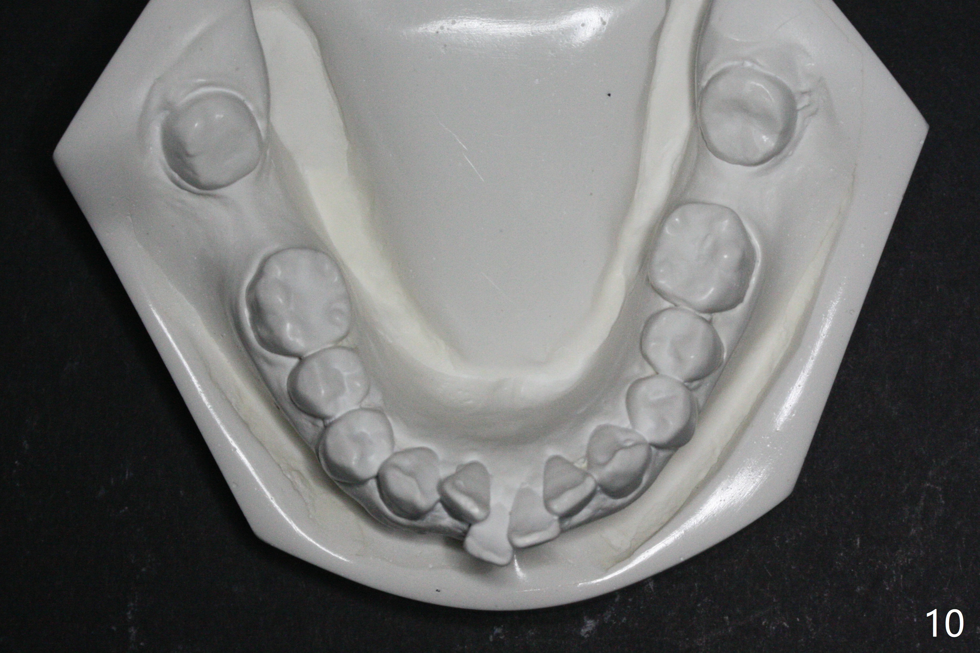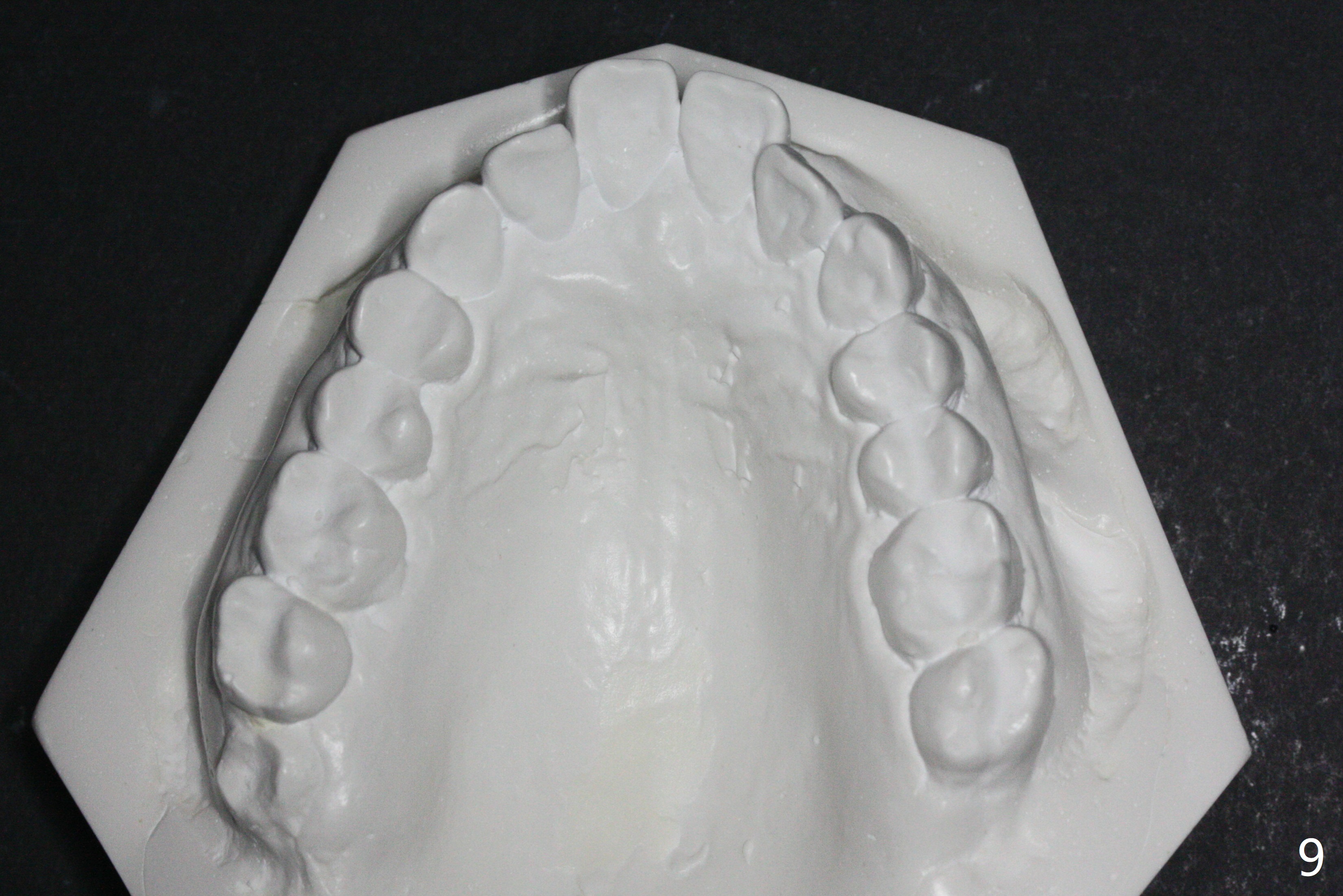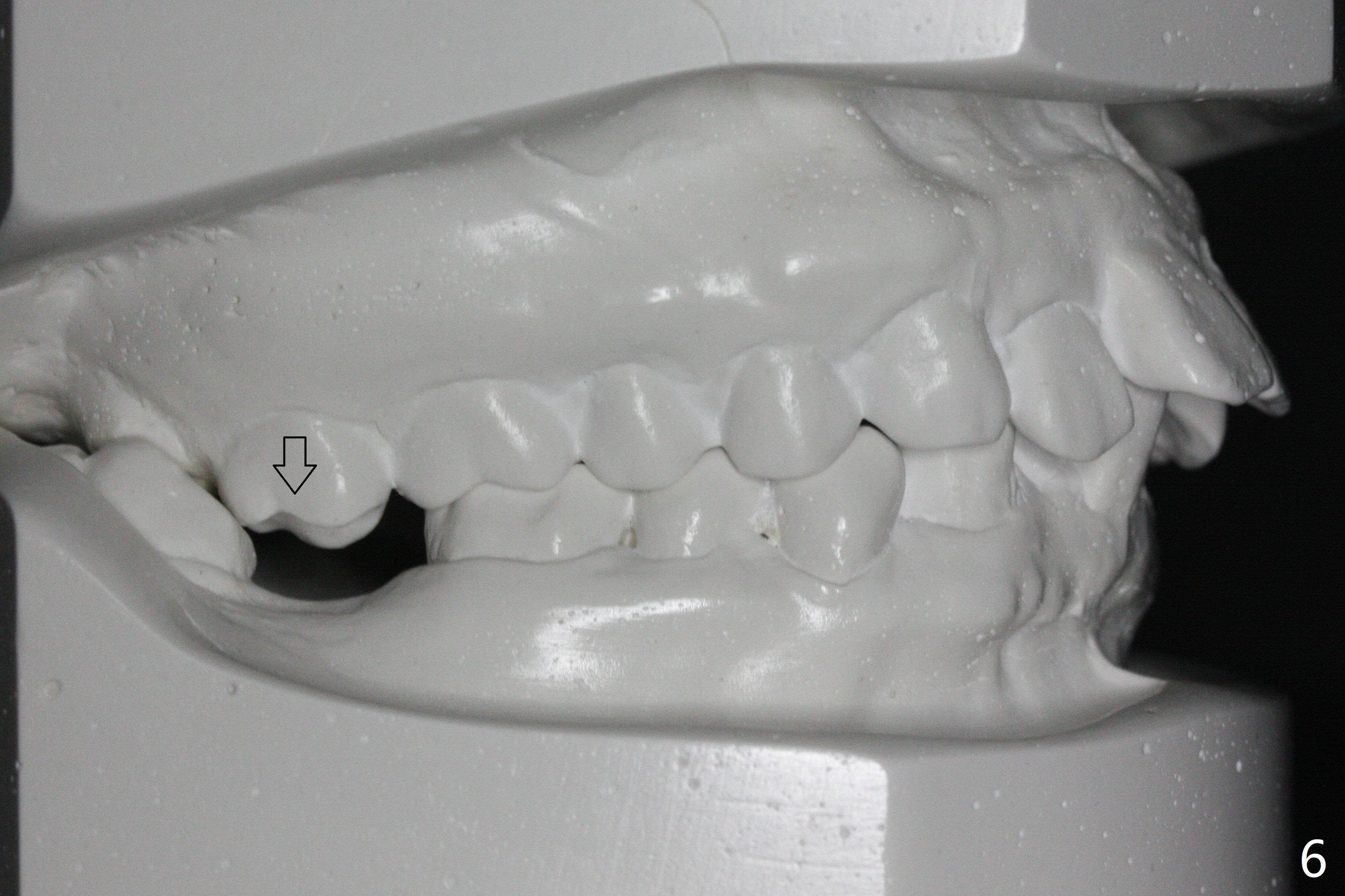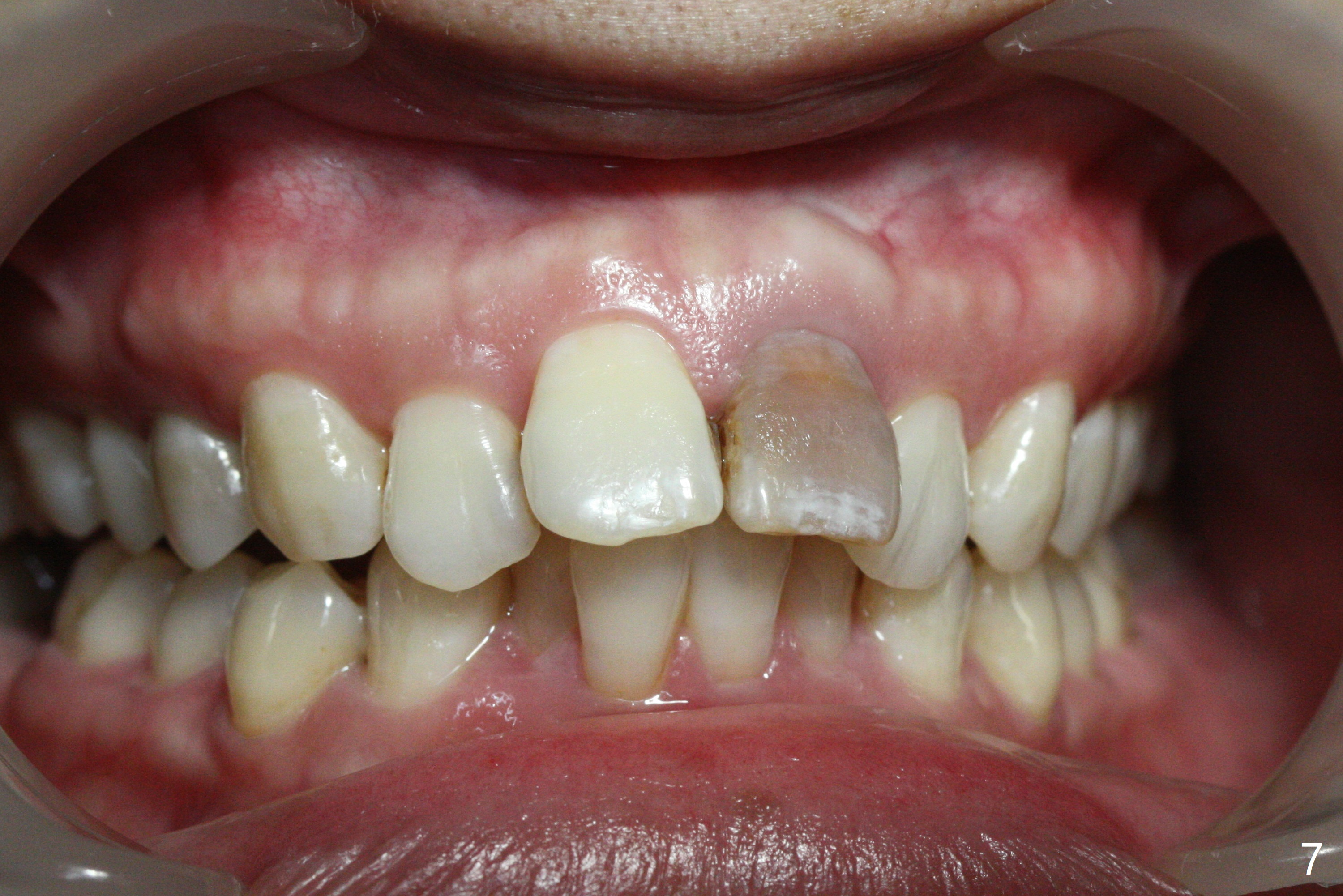 A 41-year-old woman requests ortho, bleach and replacement of 2 lower molars (L7s). The lips are protrusive (Fig.1,3), which is seemingly due to the underlying protrusive anterior teeth (Fig.4,5). Cephalometric tracing shows that SNA and SNB are both 87º (Fig.12), suggesting extraction. When the protrusive teeth are distalized, pay attention to move the upper dental midline to the right (Fig.2). BWs show subgingival calculus. SRP is required. Internal bleaching will be conducted for UL1 (Fig.7,11). Distalization is accomplished with extraction of 2 upper 1st bicuspids and using L8s as anchors so that no implants will be necessary for L7s. But the patient would rather have 2 of the lower 2nd molars for mastication. It appears that extraction of 4 bicuspids is pending (Fig.6-11). Supraeruption of U7s (Fig.6,8 arrows) will be corrected with banding.