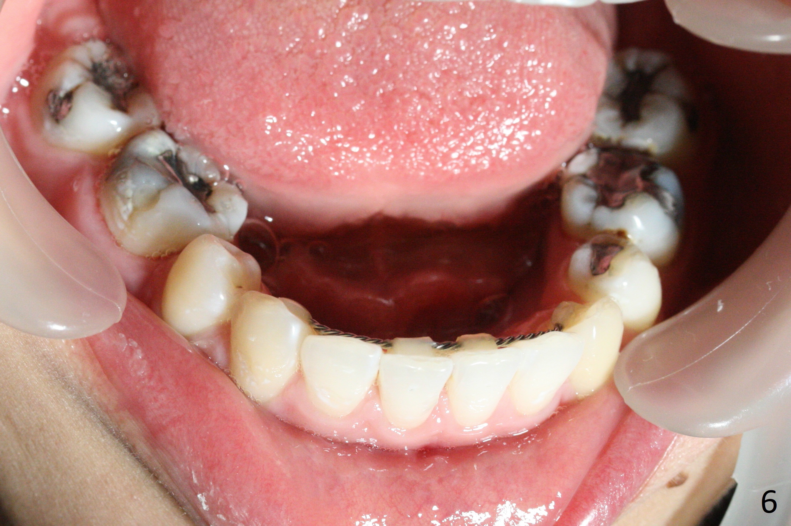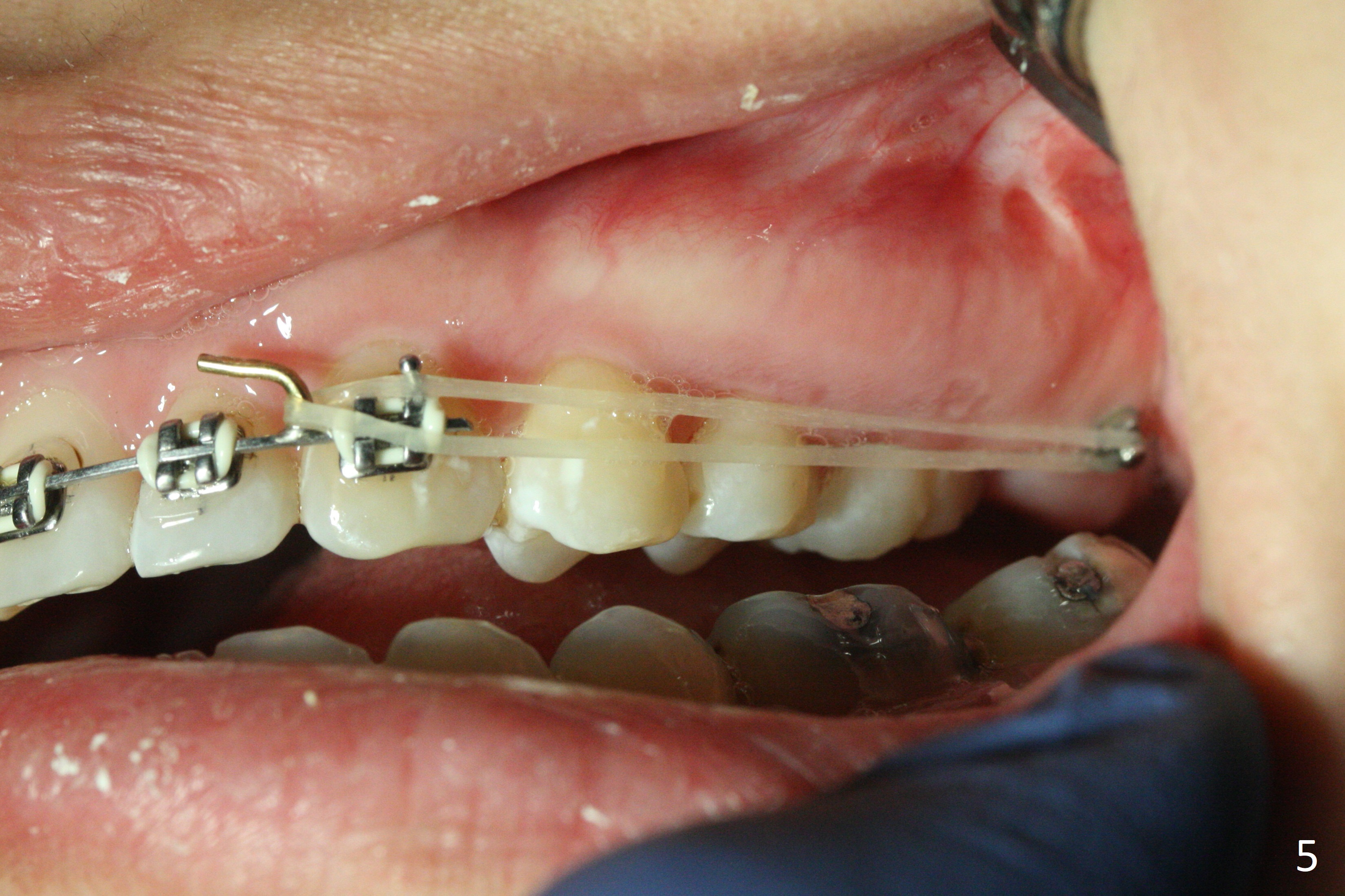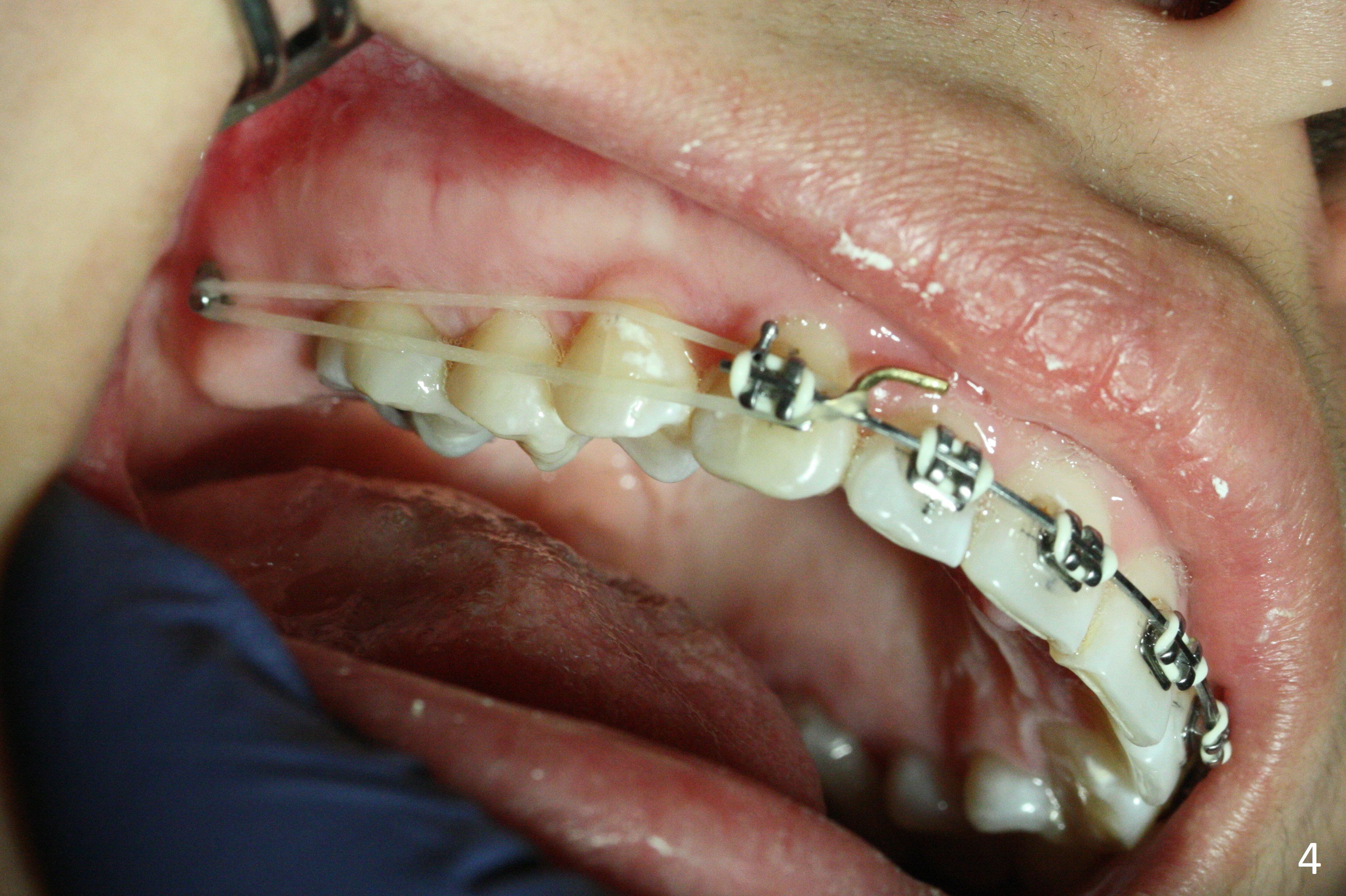 Anterior overjet and overbite remain stable 3 months after sectioning the posted wires and posterior interdigitation (Fig.1-3). After placement of lower lingual retainer (Fig.6), brackets and bands are removed except U3-3, Alginate impression taken for upper Hawley appliance and elastics placed between the upper posts and posterior mini-implants (Fig.4,5) while the model is being sent to lab for the Hawley appliance. Five months later, UR3 becomes symptomatic.