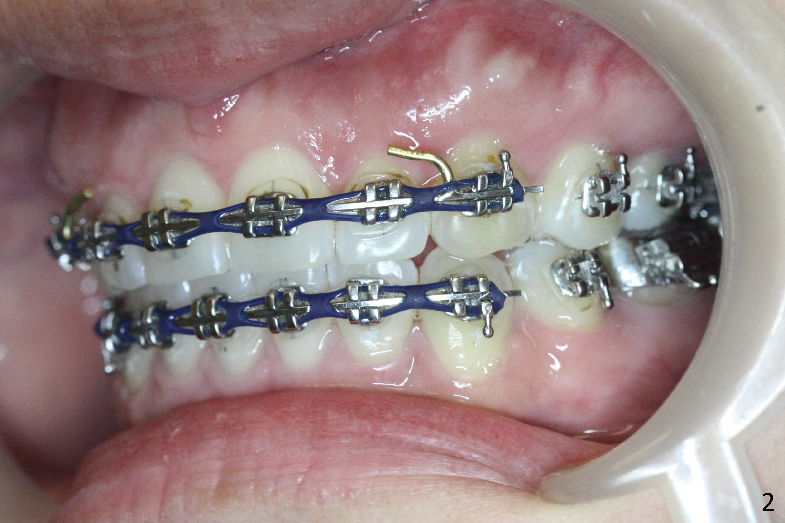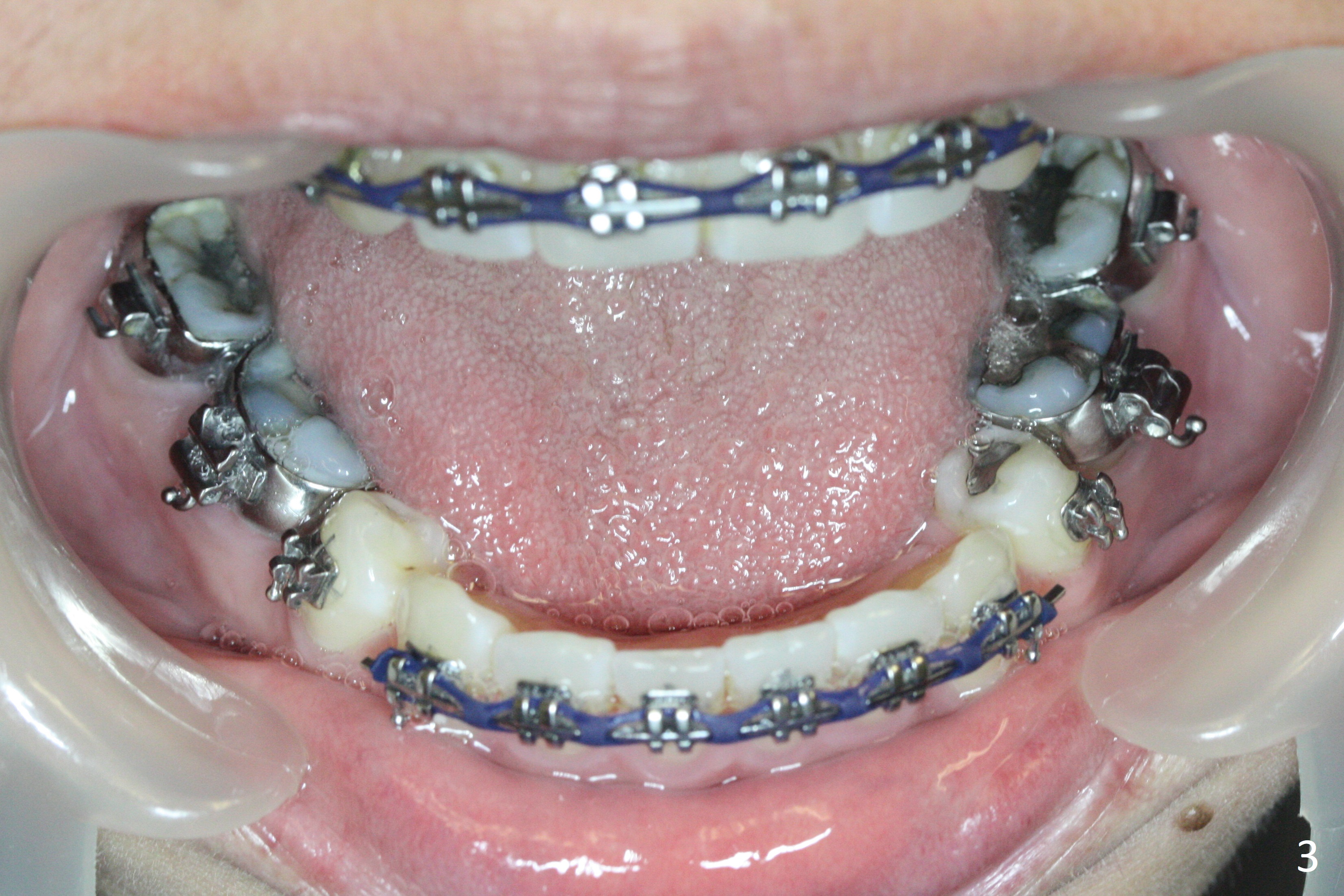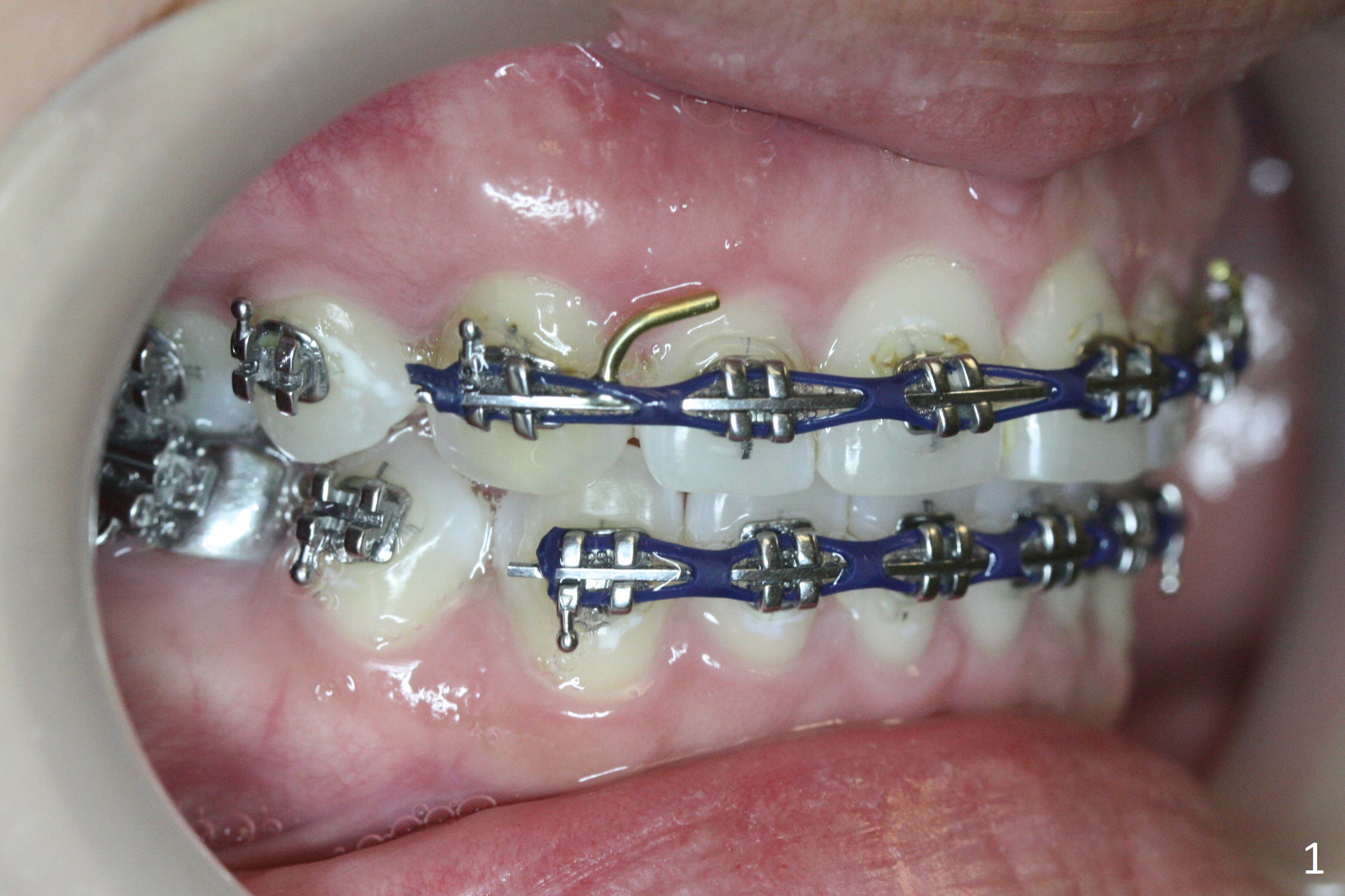 Anterior overjet and overbite remain stable 3 months after sectioning the posted wires and posterior interdigitation (Fig.1-3). After placement of lower lingual retainer (Fig.6), brackets and bands are removed except U3-3, Alginate impression taken for upper Hawley appliance and elastics placed between the upper posts and posterior mini-implants (Fig.4,5) while the model is being sent to lab for the Hawley appliance. Five months later, UR3 becomes symptomatic.