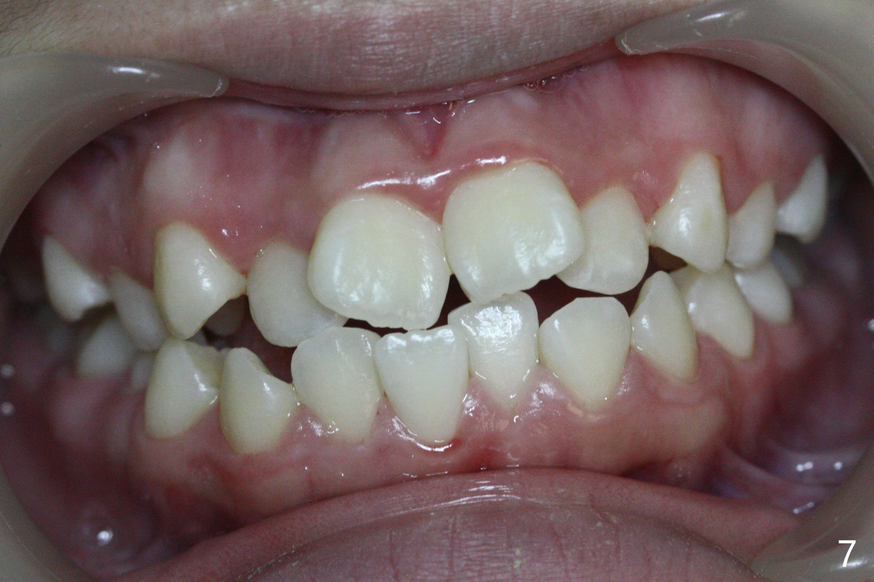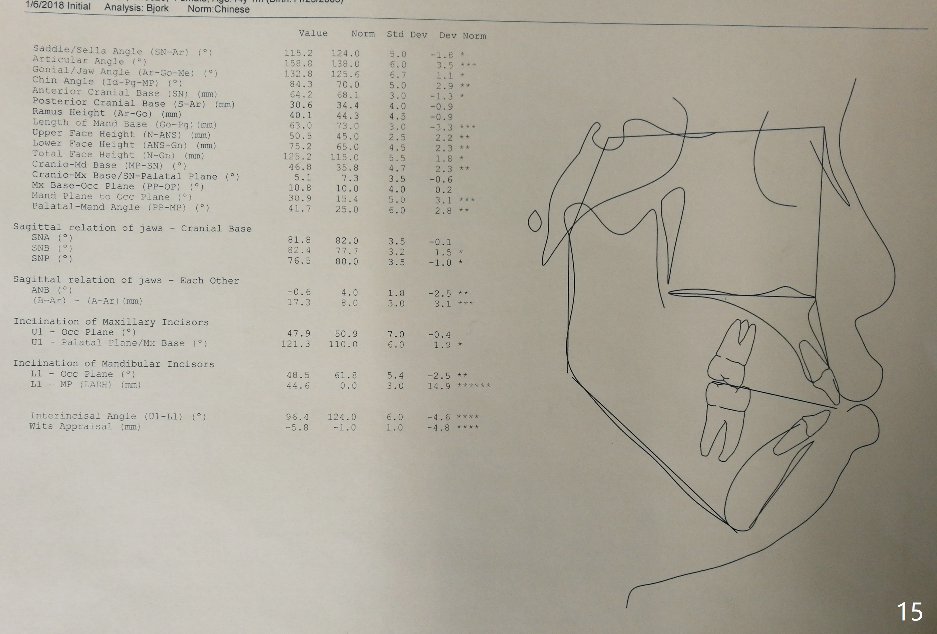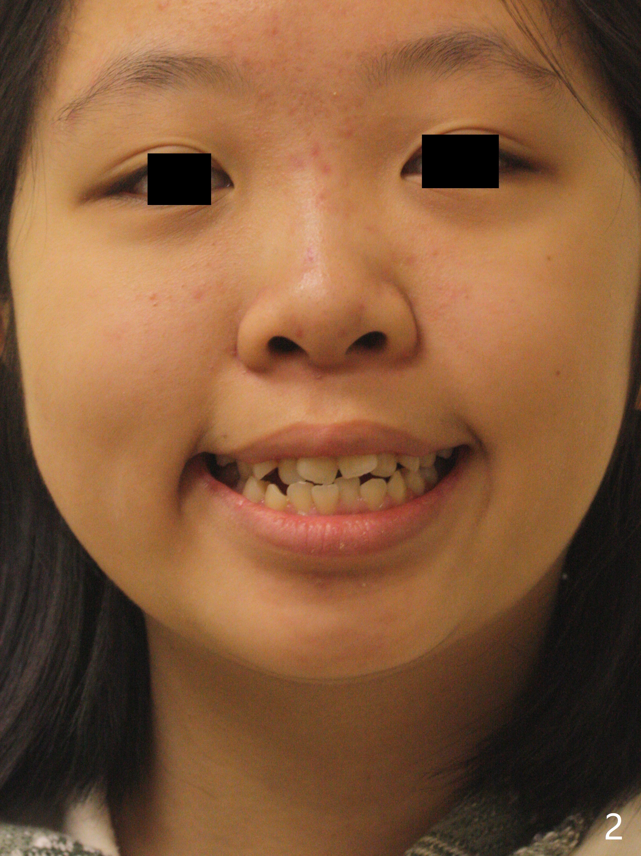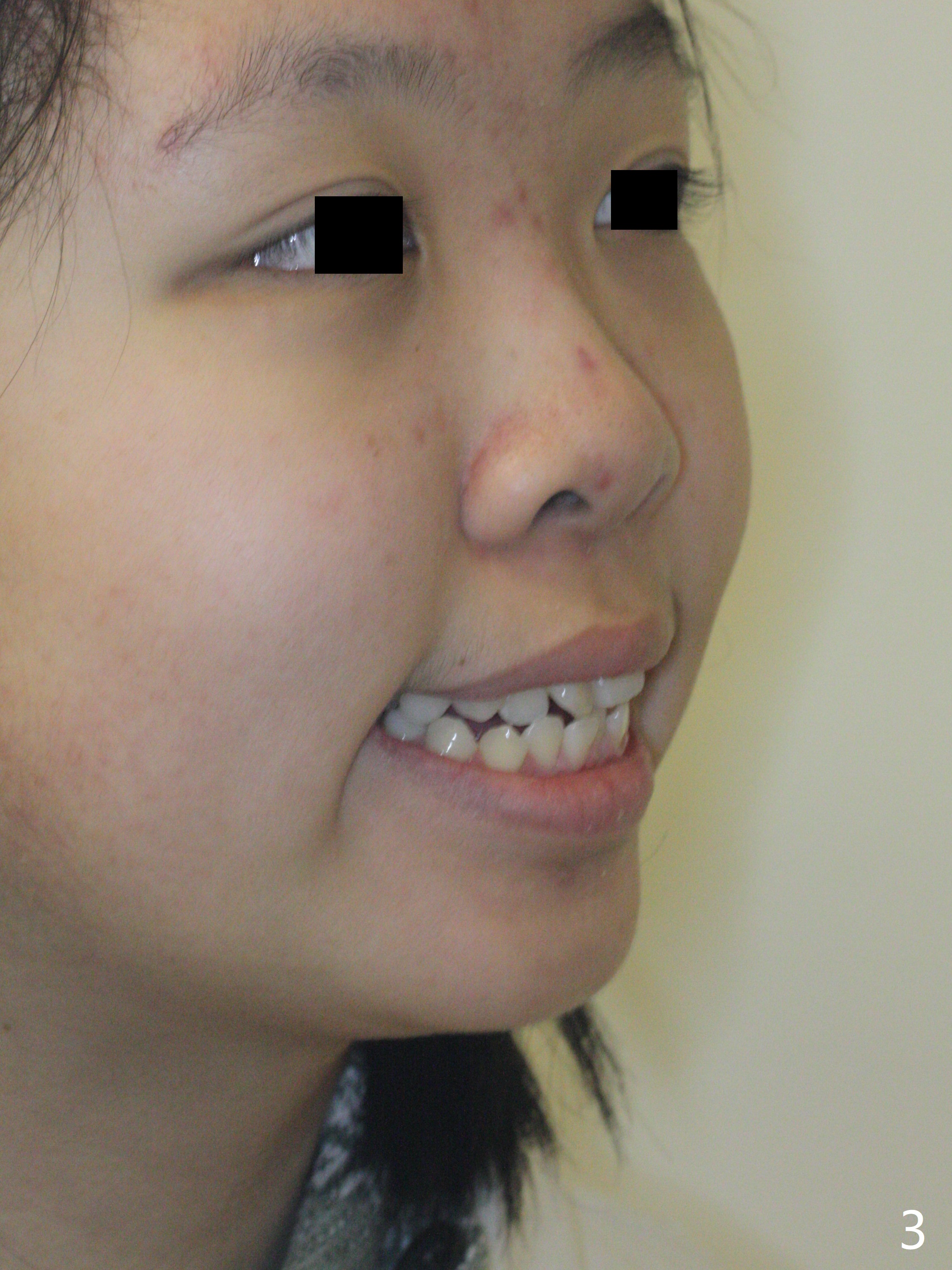A 14-year-old woman has convex facial profile (Fig.1-4) with the upper midline shifted to the left (Fig.2). Since the roots of the 1st bicuspids are short (Fig.5), extraction should be easy. U3 will be retracted distal early with intention to correct the upper midline. With Class I occlusion at the canines and the 1st molars and good initial interdigitation (Fig.6-11), orthodontic treatment should be rewarding. Because of severe crowding (tight contact, Fig.12,13), place separators after extraction and place bands and brackets a few days later. Cephalometric analysis (Fig.14) shows that SNB is greater than SNA (82.4 vs. 81.8 degree); after extraction, retract the lower anterior teeth prior to the upper ones. It is easy to place separators after extraction (Fig.16,17).