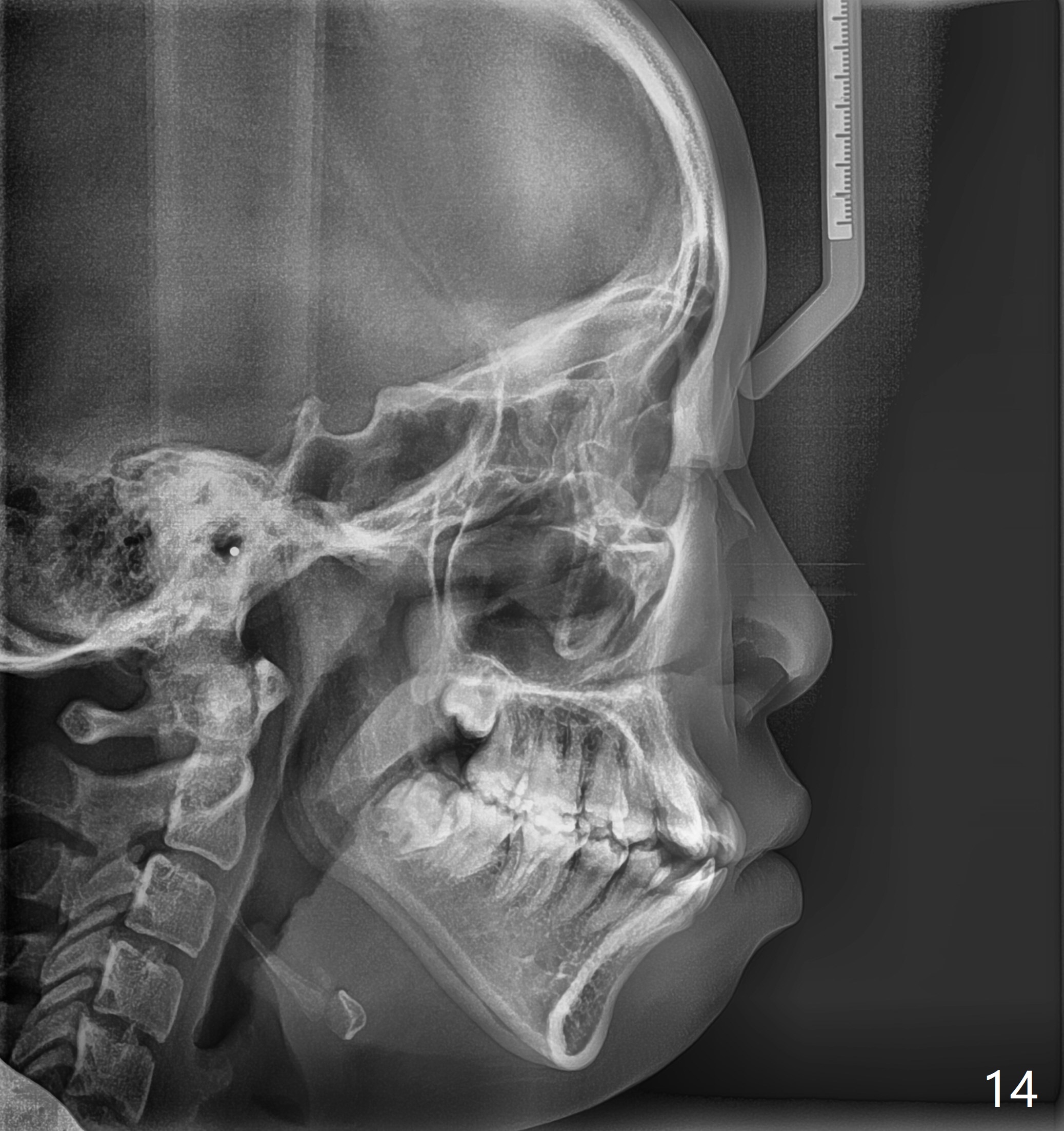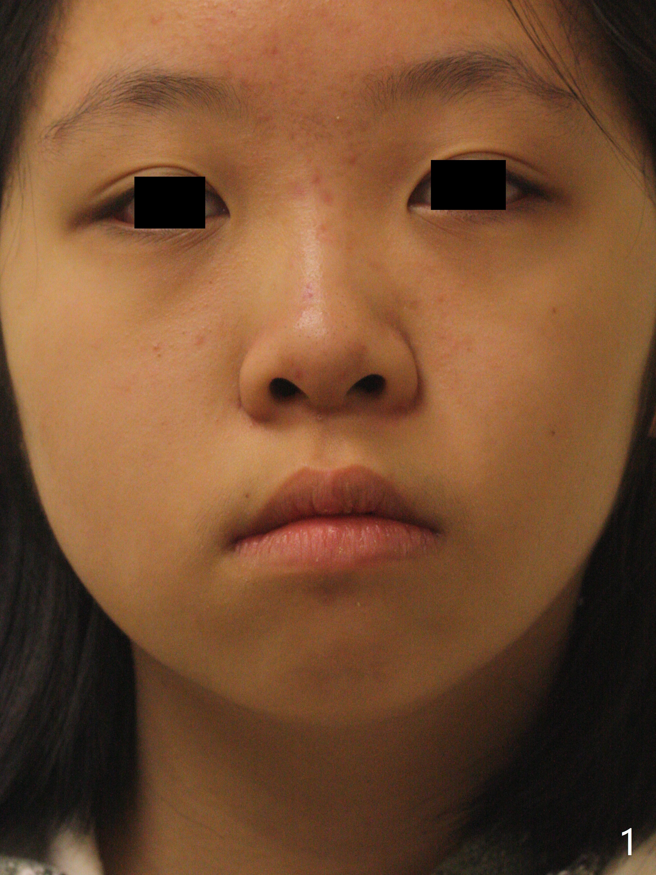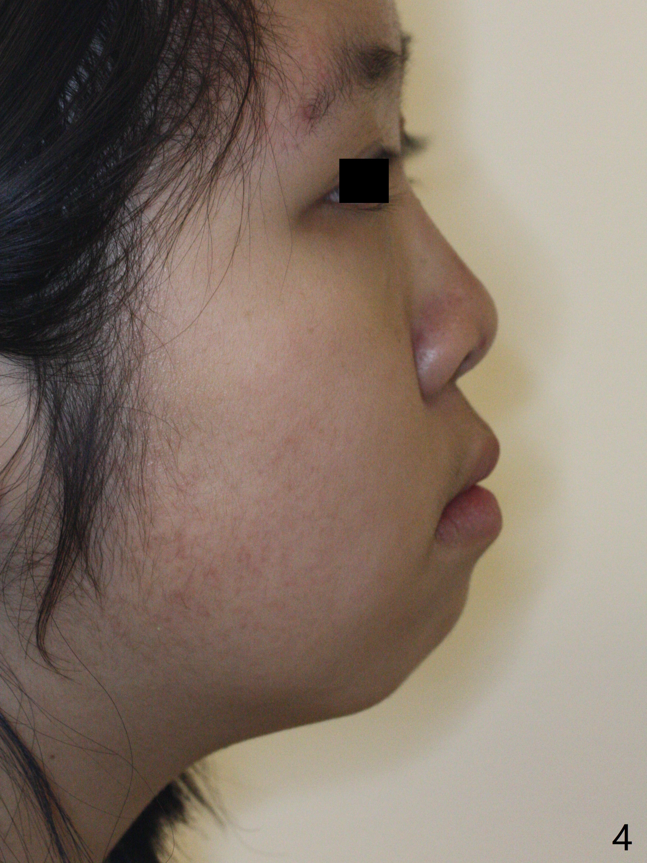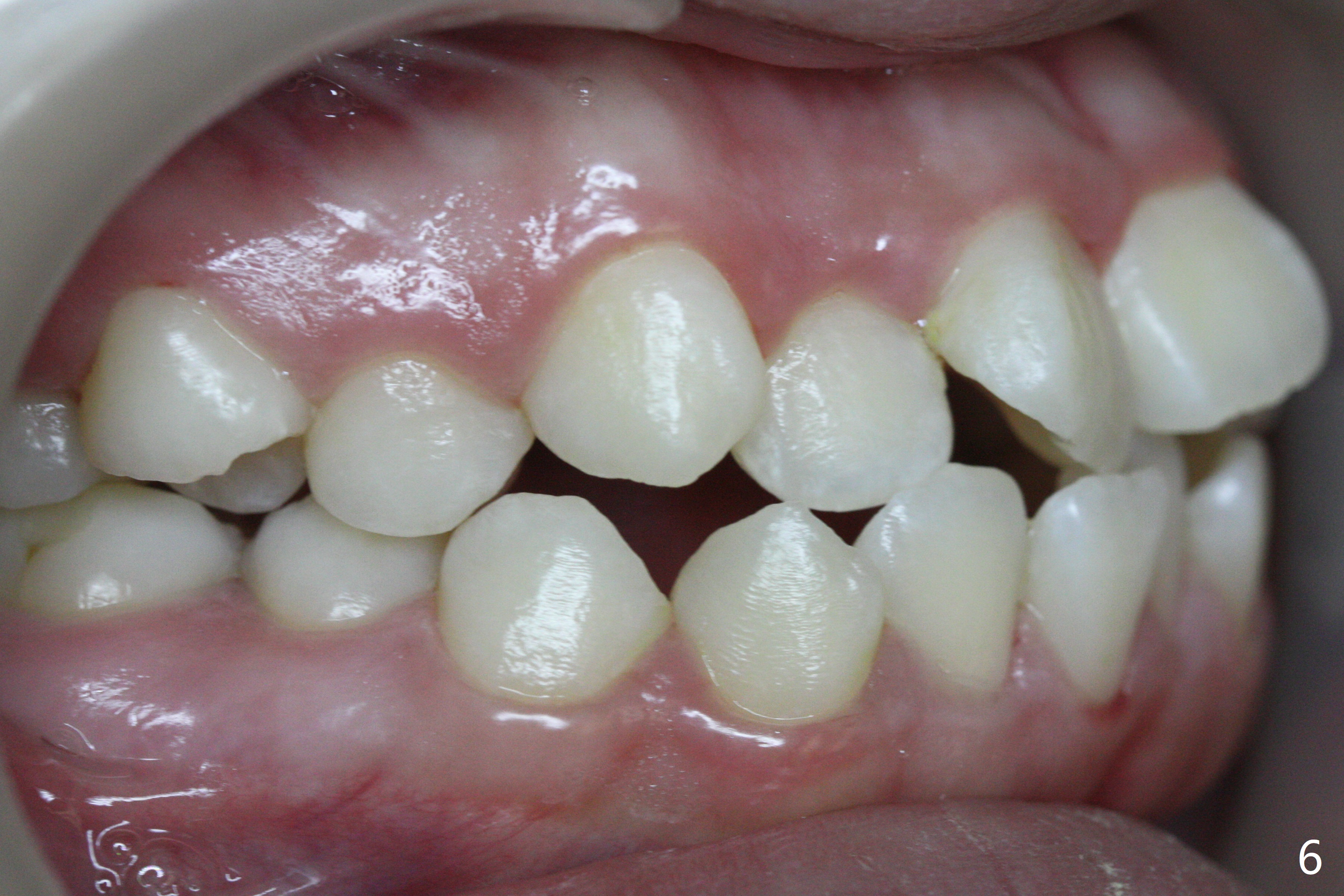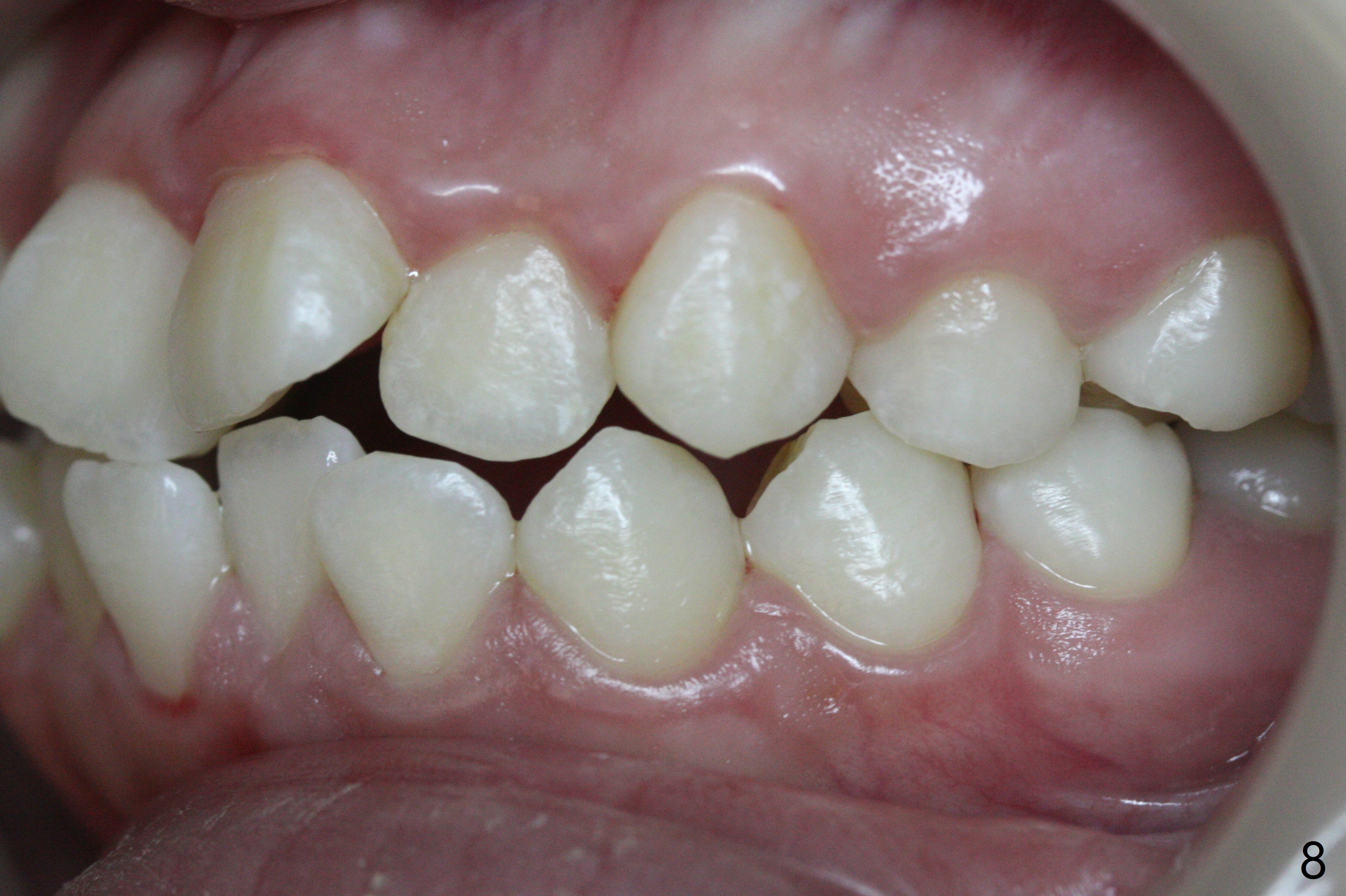 A 14-year-old woman has convex facial profile (Fig.1-4) with the upper midline shifted to the left (Fig.2). Since the roots of the 1st bicuspids are short (Fig.5), extraction should be easy. U3 will be retracted distal early with intention to correct the upper midline. With Class I occlusion at the canines and the 1st molars and good initial interdigitation (Fig.6-11), orthodontic treatment should be rewarding. Because of severe crowding (tight contact, Fig.12,13), place separators after extraction and place bands and brackets a few days later. Cephalometric analysis (Fig.14) shows that SNB is greater than SNA (82.4 vs. 81.8 degree); after extraction, retract the lower anterior teeth prior to the upper ones. It is easy to place separators after extraction (Fig.16,17).