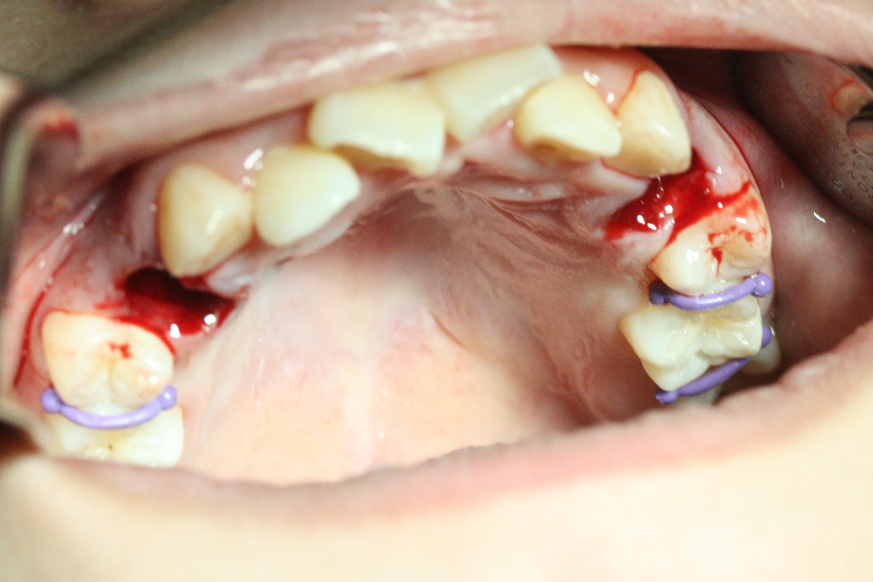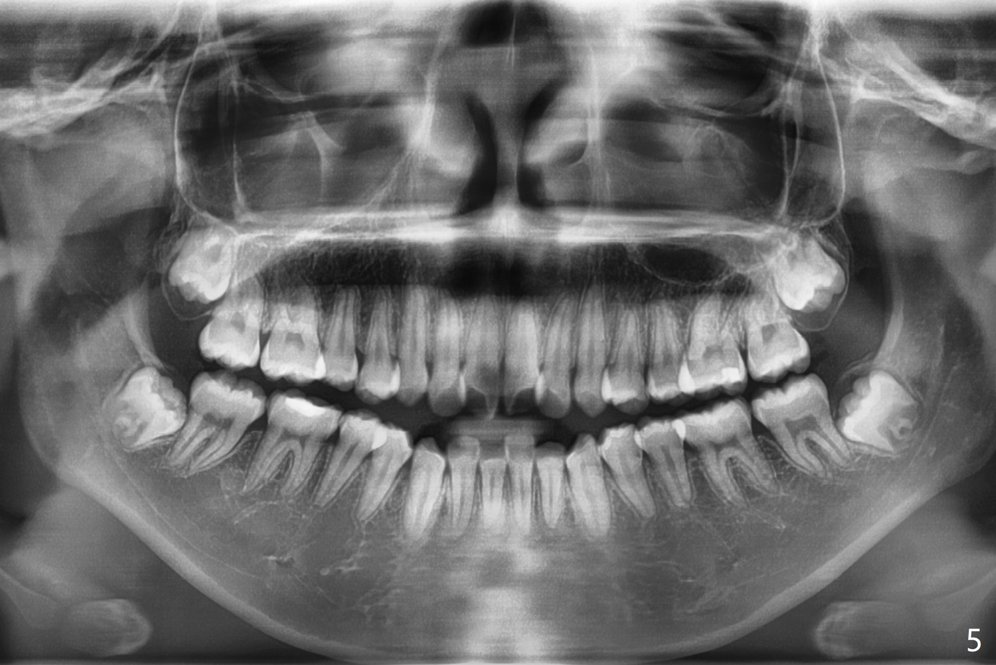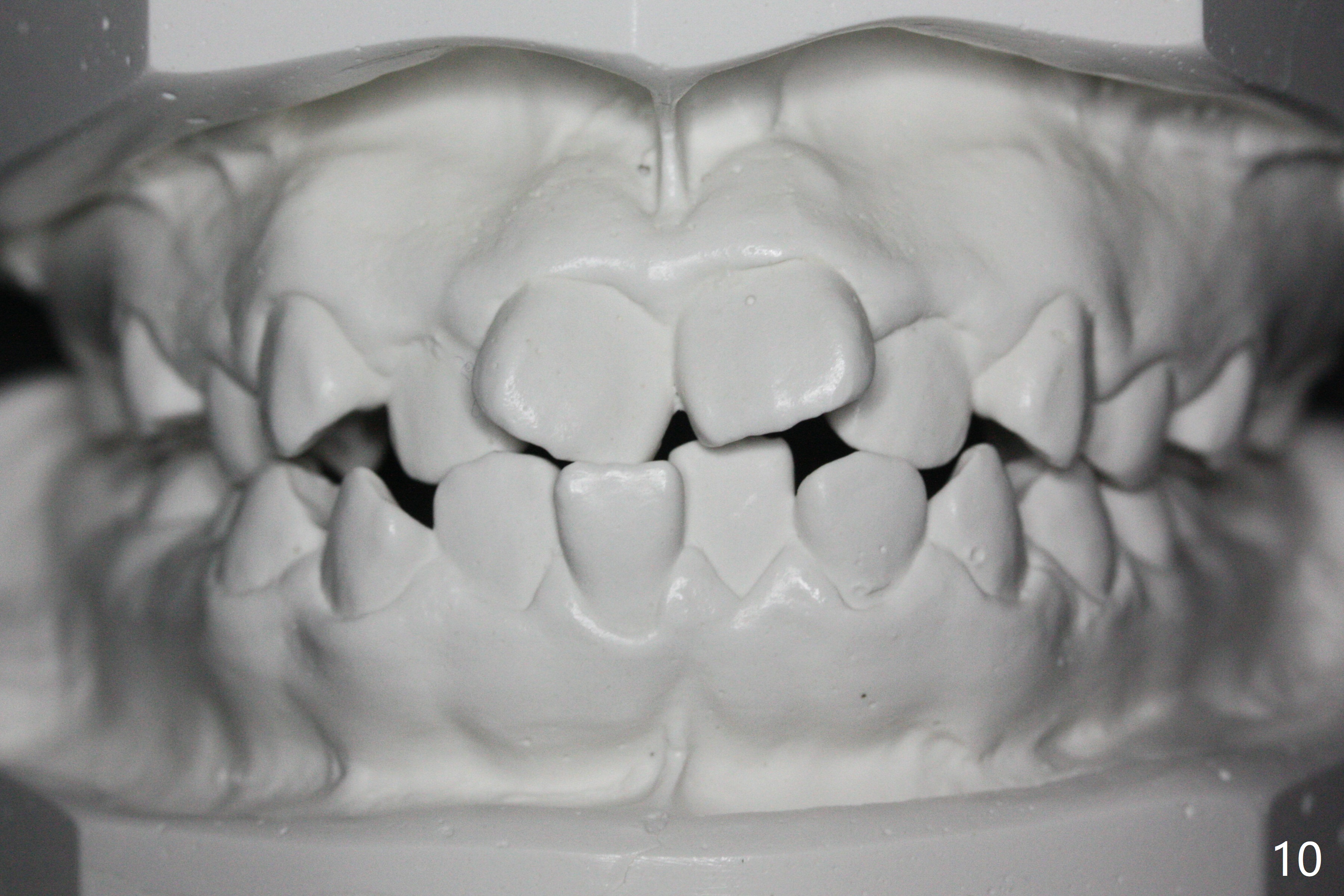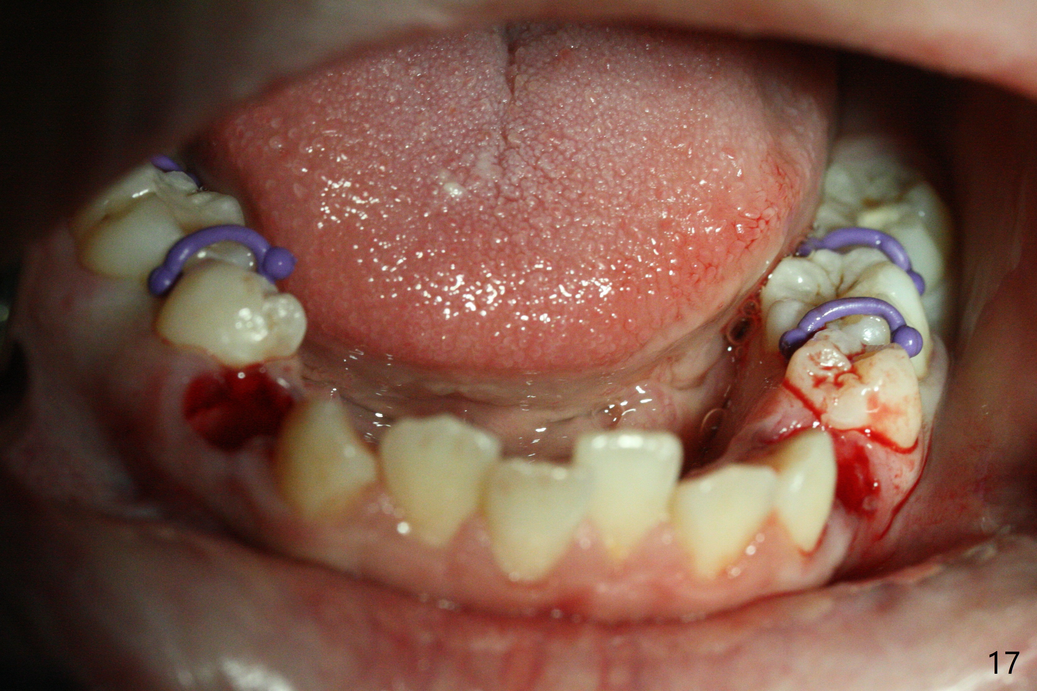 A 14-year-old woman has convex facial profile (Fig.1-4) with the upper midline shifted to the left (Fig.2). Since the roots of the 1st bicuspids are short (Fig.5), extraction should be easy. U3 will be retracted distal early with intention to correct the upper midline. With Class I occlusion at the canines and the 1st molars and good initial interdigitation (Fig.6-11), orthodontic treatment should be rewarding. Because of severe crowding (tight contact, Fig.12,13), place separators after extraction and place bands and brackets a few days later. Cephalometric analysis (Fig.14) shows that SNB is greater than SNA (82.4 vs. 81.8 degree); after extraction, retract the lower anterior teeth prior to the upper ones. It is easy to place separators after extraction (Fig.16,17).