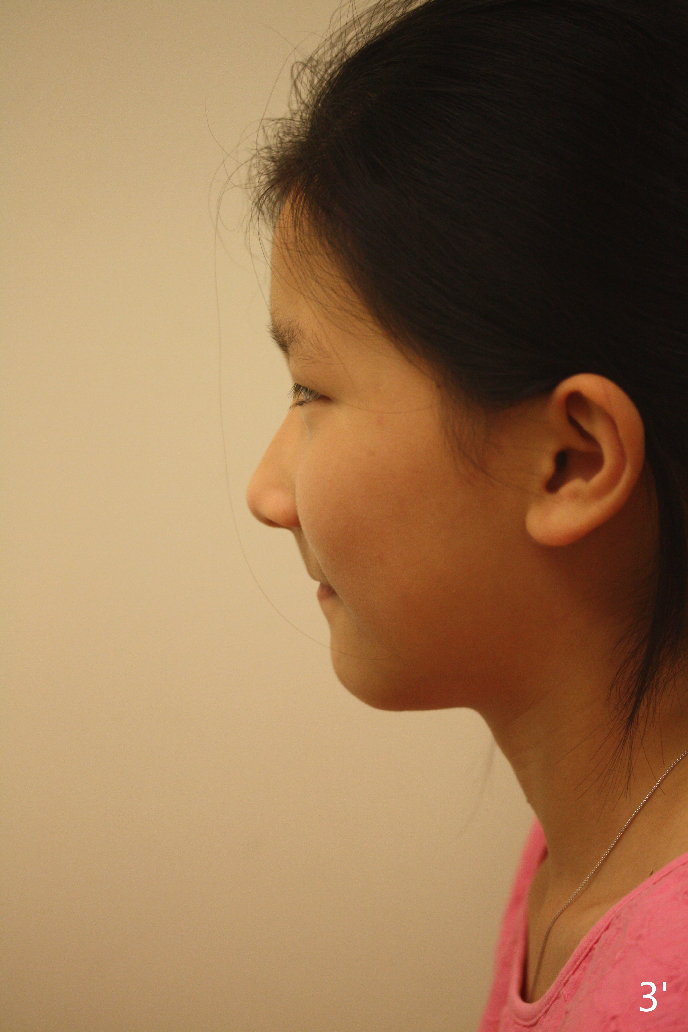 The 3rd photo should be 45 or 90 degree for facial profile (Fig.3). The right, but not left (Fig.3'), face should be the target, consistent with cephalometric X-ray. Turn the face toward you when taking the lateral view so that more of the lips are shown, as it would be more important for the next photo.