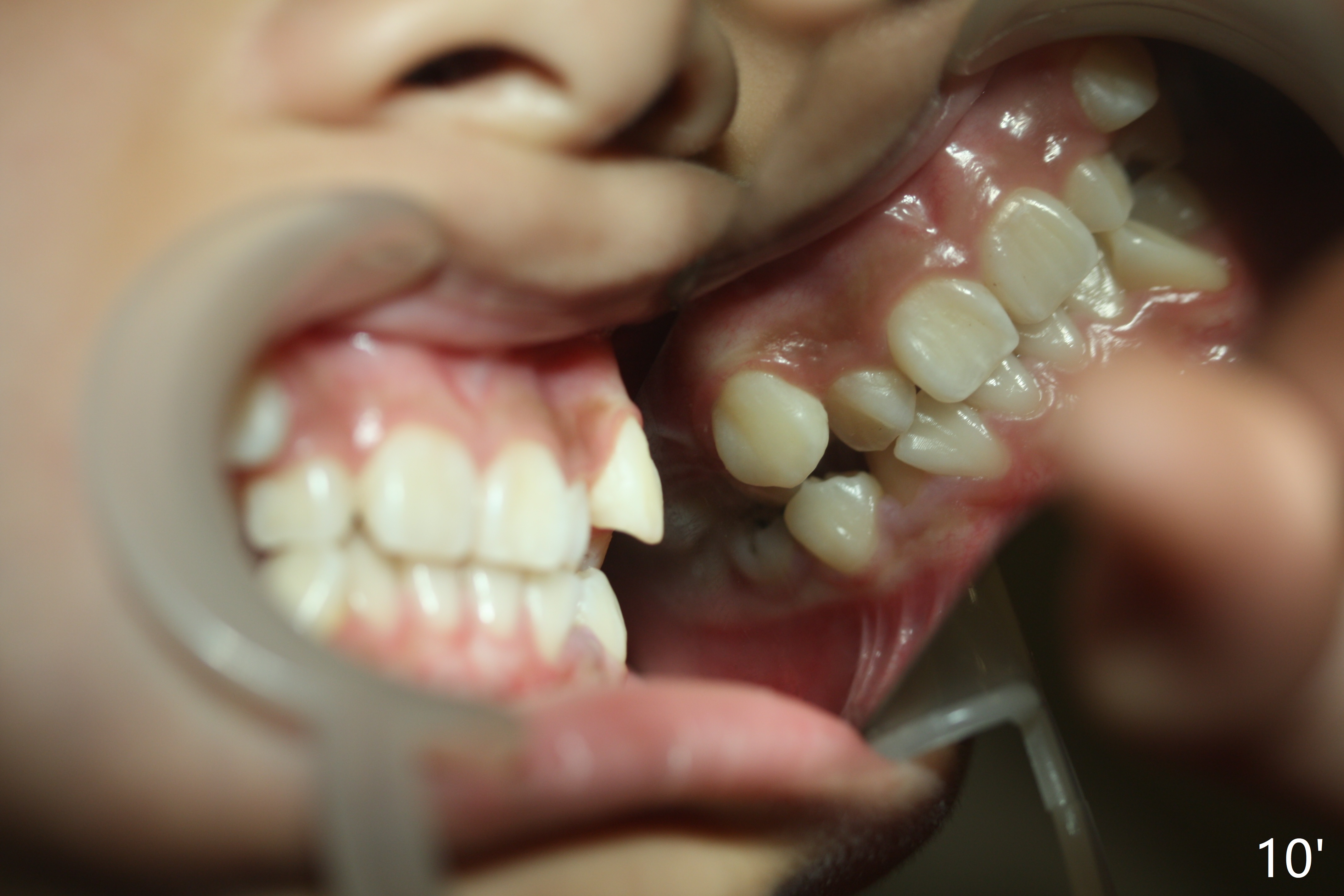 Preop left occlusal mirror view should cover the posterior teeth (Fig.10, vs. 10'). The end of the mirror should be pressed against the cheek.