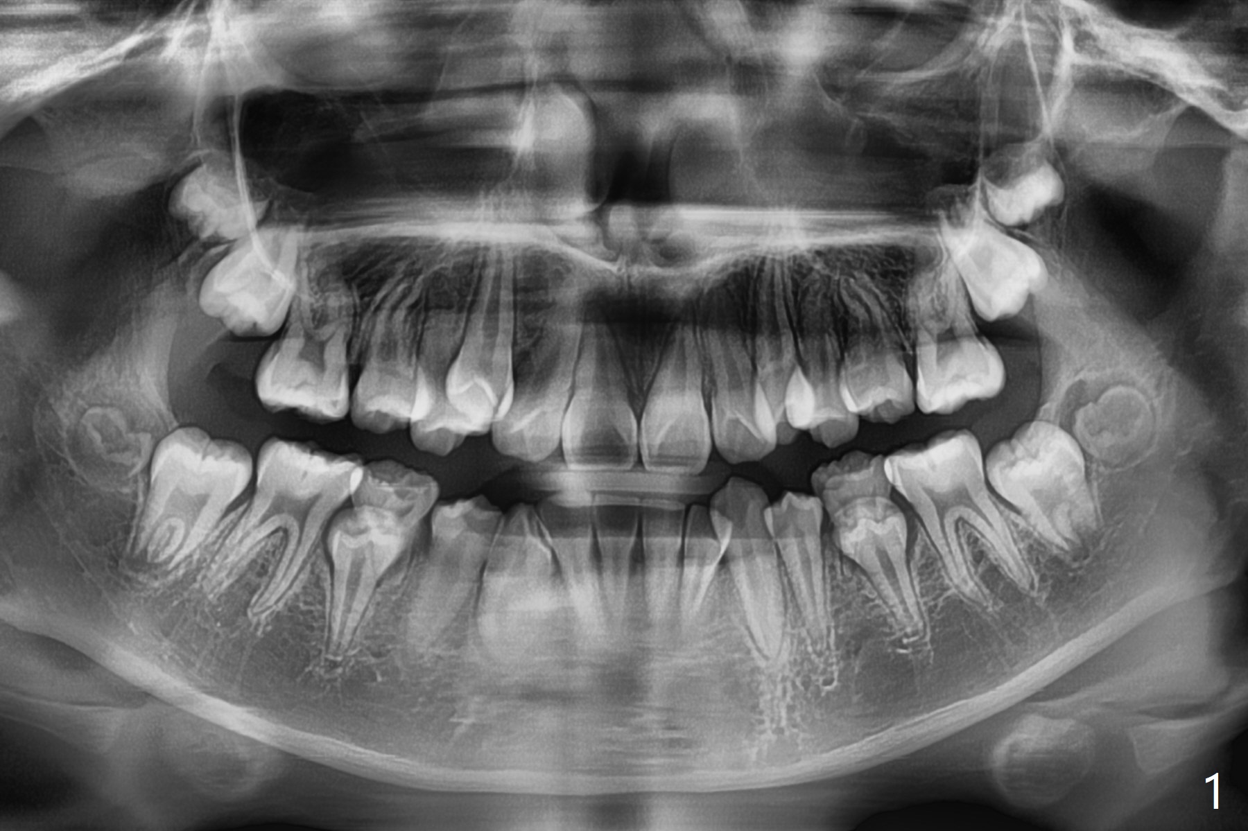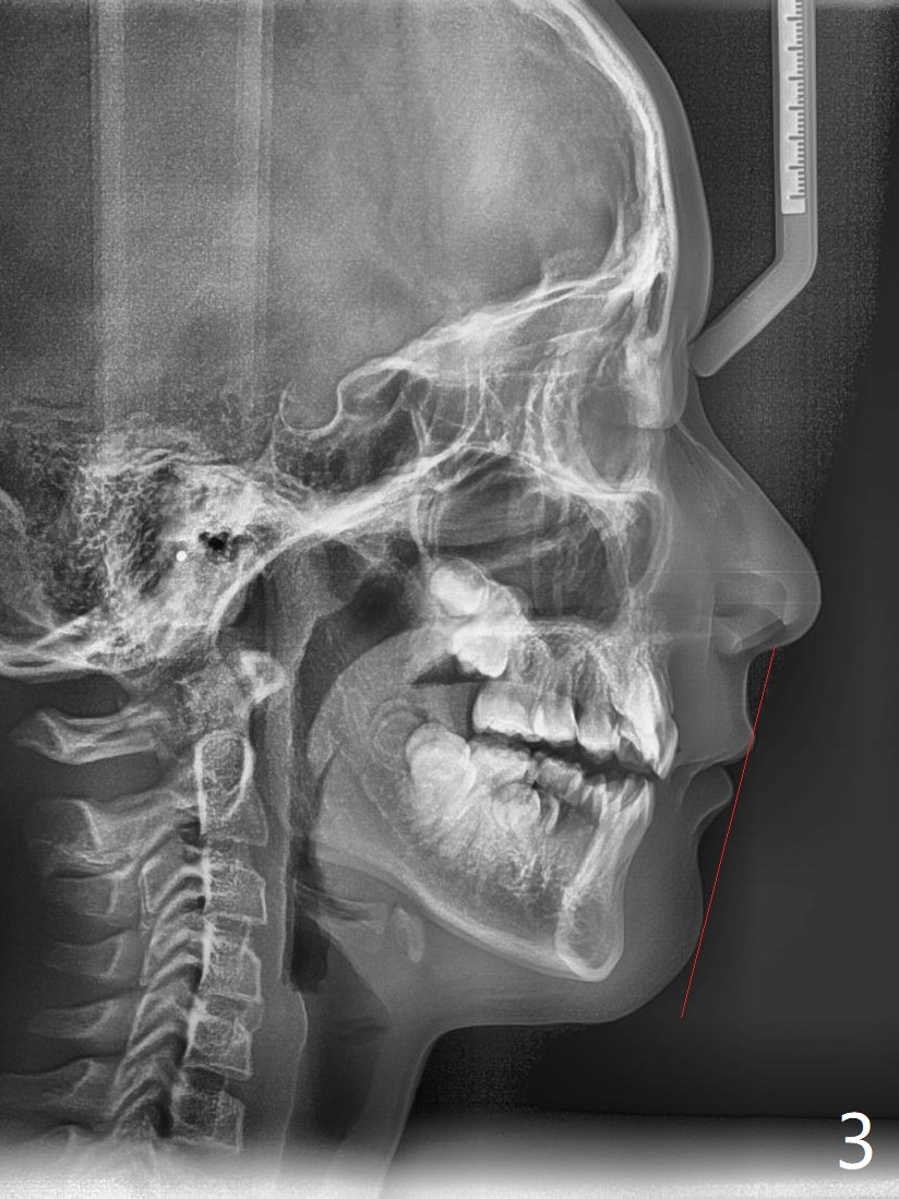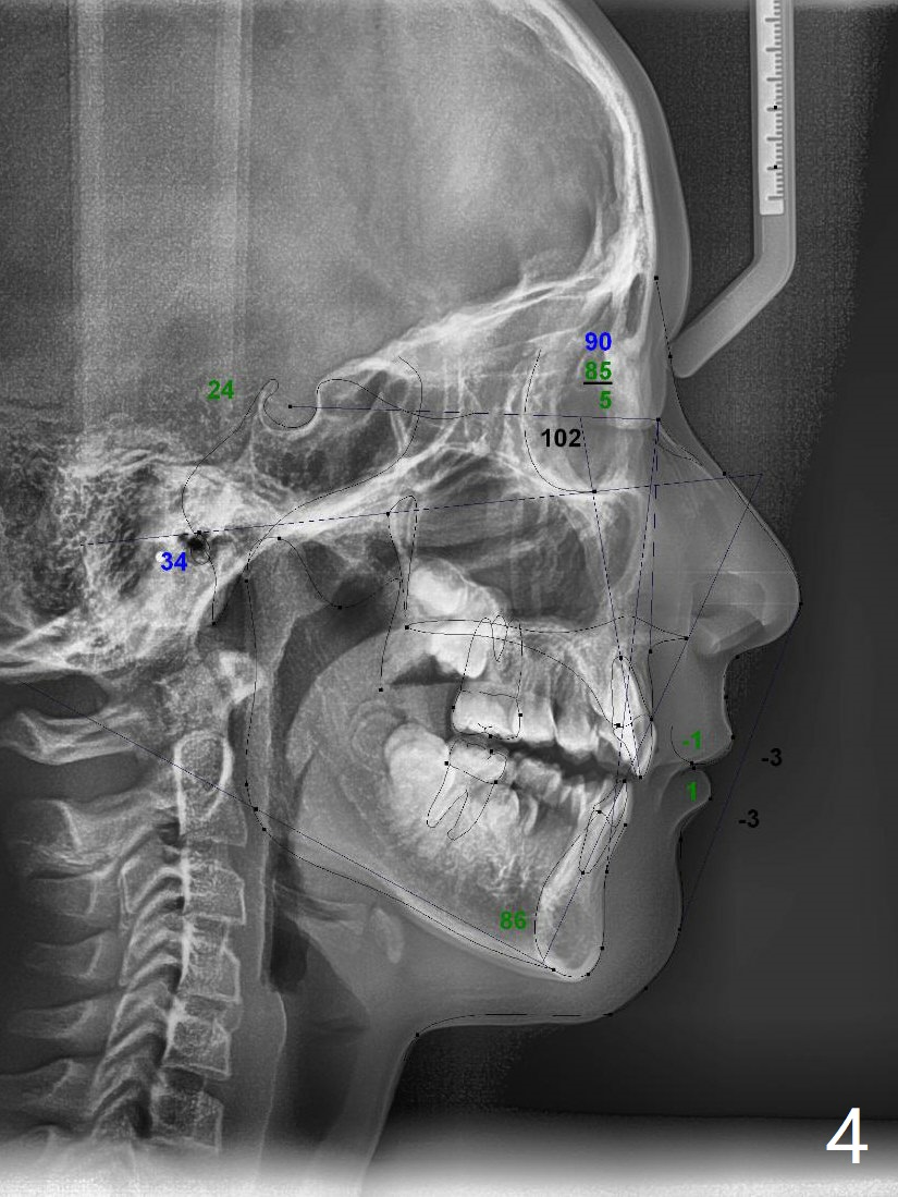 A 10-year-8-month-old woman presents to clinic with severe crowding (especially at the canines, Fig.1), but her facial profile is within normal limit (Fig.2,3) in spite of the fact that cephalometric tracing shows bimaxillary protrusion (Fig.4). Will 4 bicuspids' extraction affect her profile? Her mom requests immediate treatment, although the patient's oral hygiene is questionable.