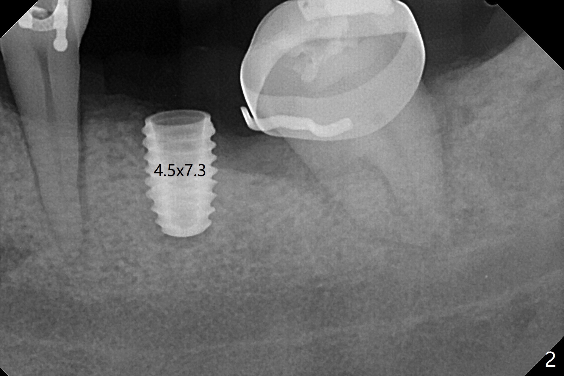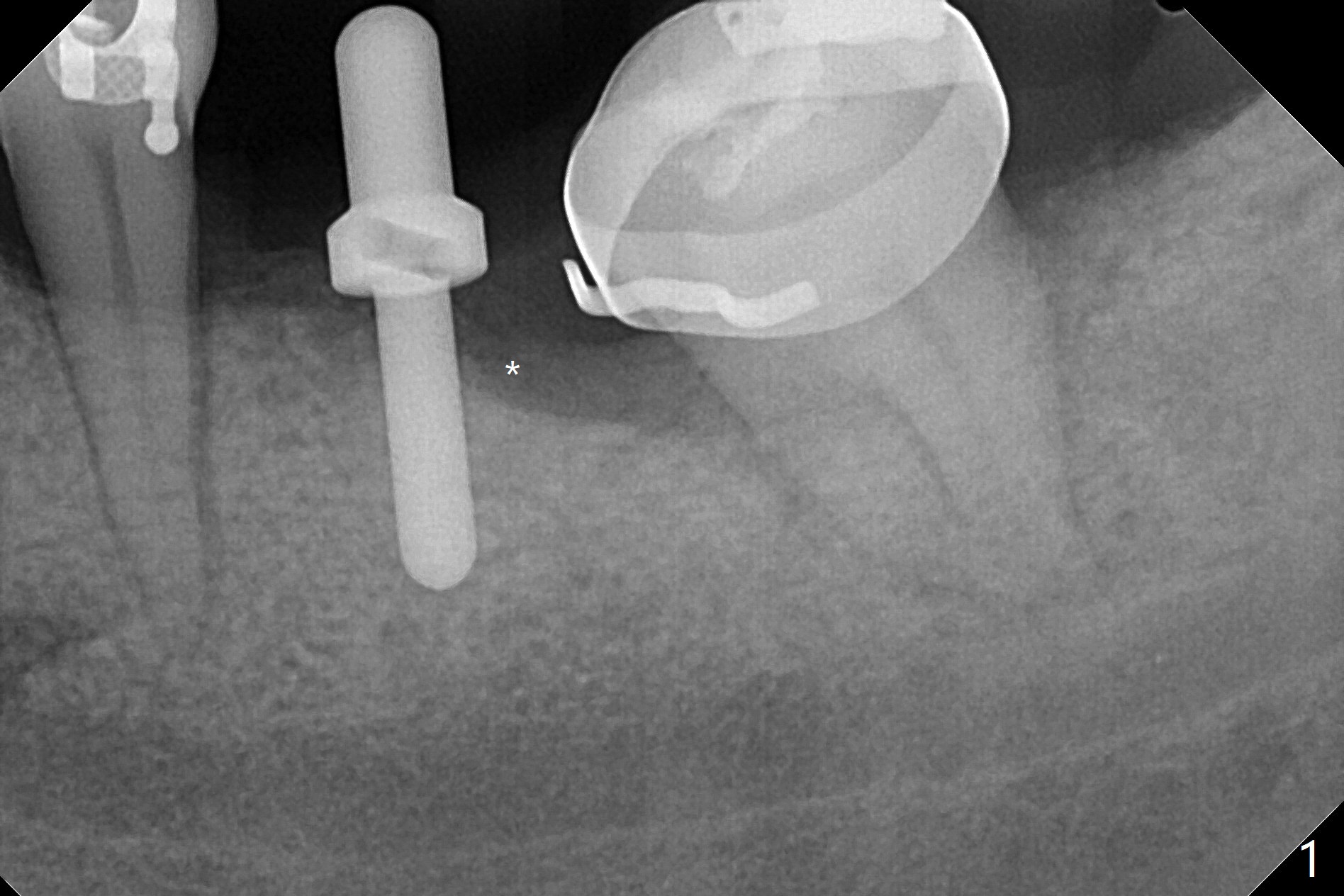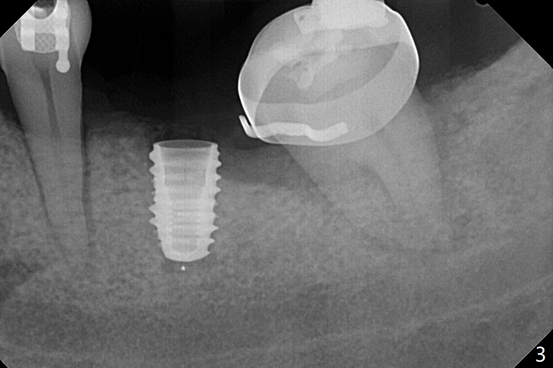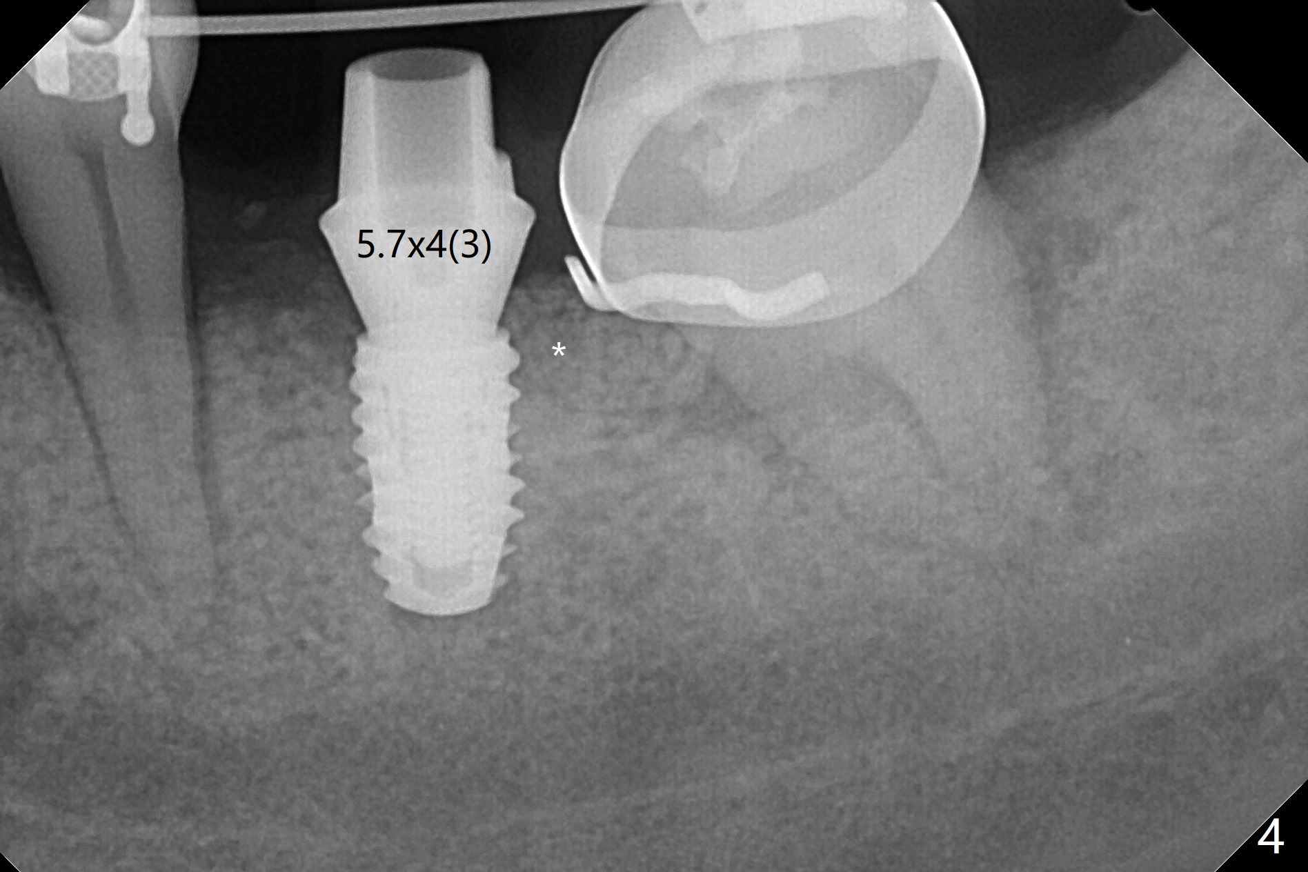 31岁女19号牙残根拔除,没有植骨,牙齿矫正创造了大约近远中10.5毫米空间,先锋钻深度8毫米(图一),远中舌侧骨质缺损(*)。使用4x7.3毫米钻头(实际长度8.5毫米)后,植入4.5x7.3毫米植体,远中大约3个螺纹暴露(图二)。使用4x8.5毫米钻头后,植体种深些(图三),但是根尖仍有空间(*)。再种深后(只有一个螺纹暴露),放置基台和粘性骨粉(图四:*),覆盖PRF,缝合,放置矫正钢丝和牙周敷料。