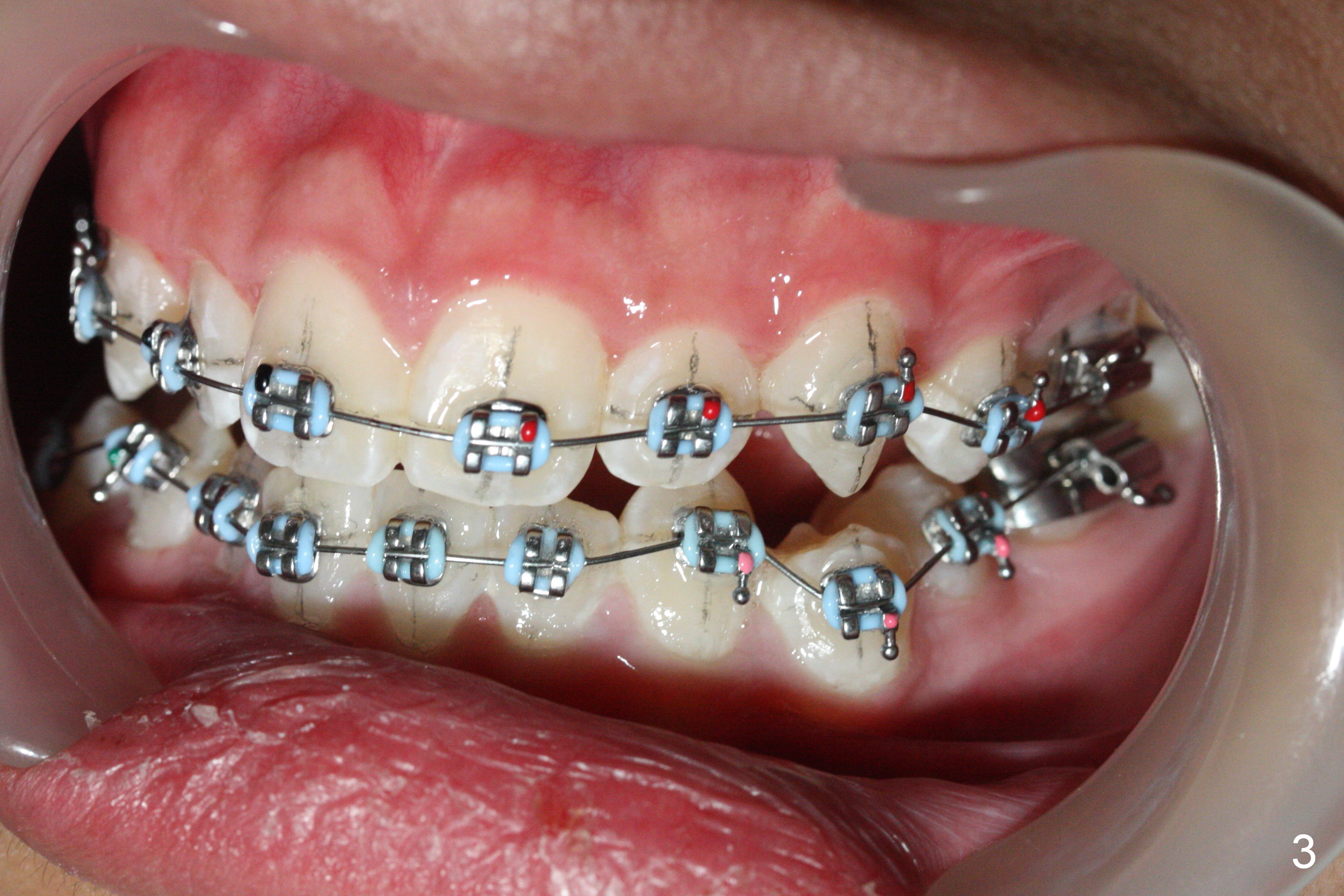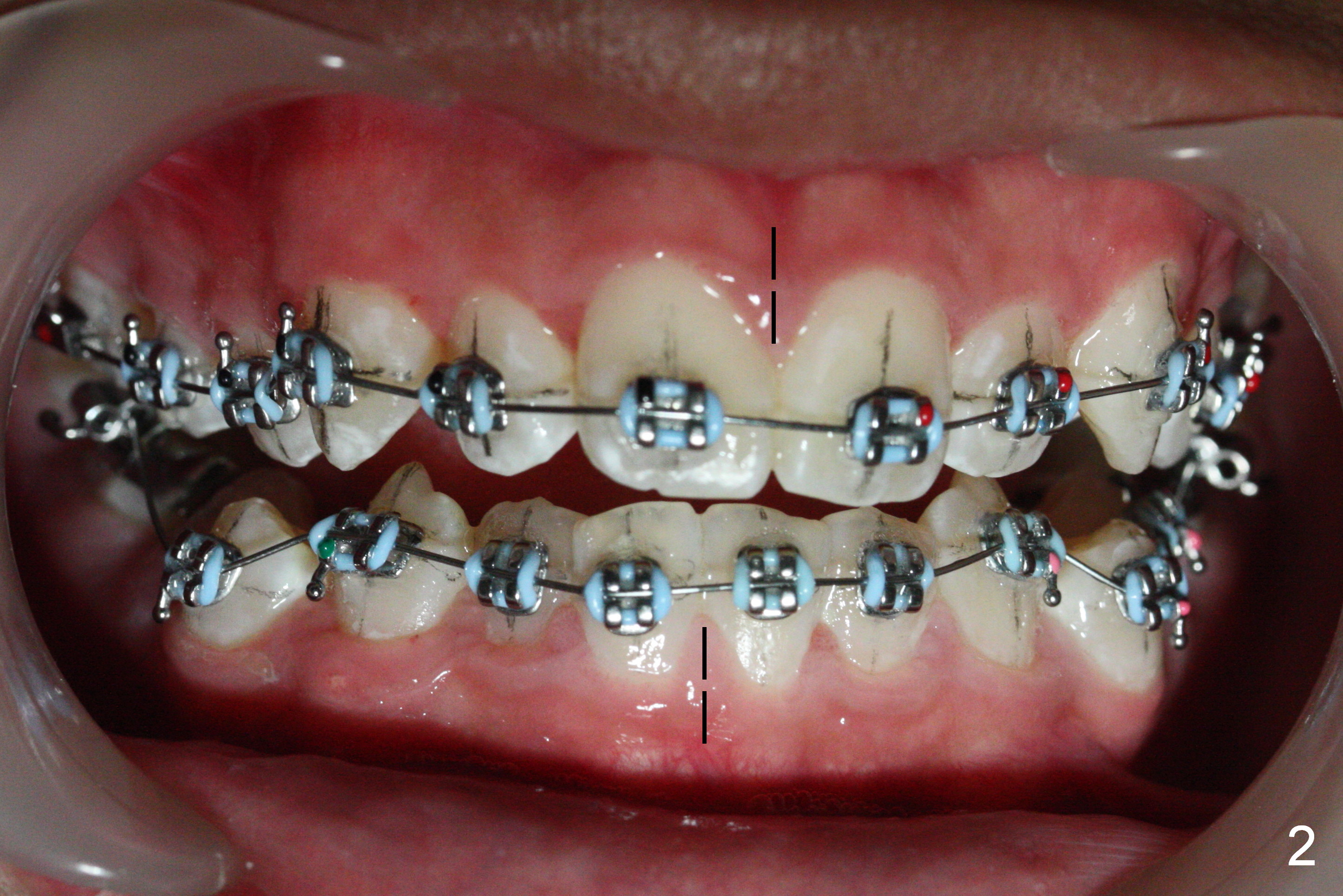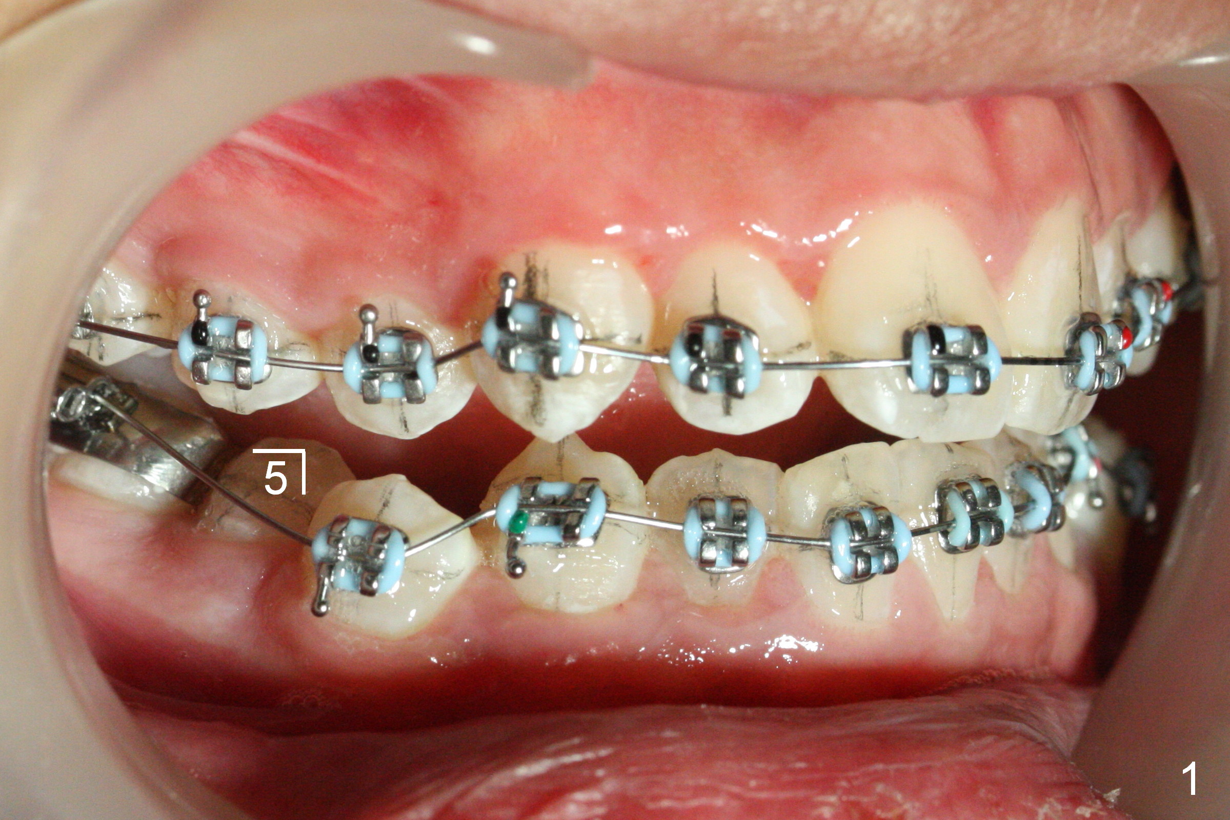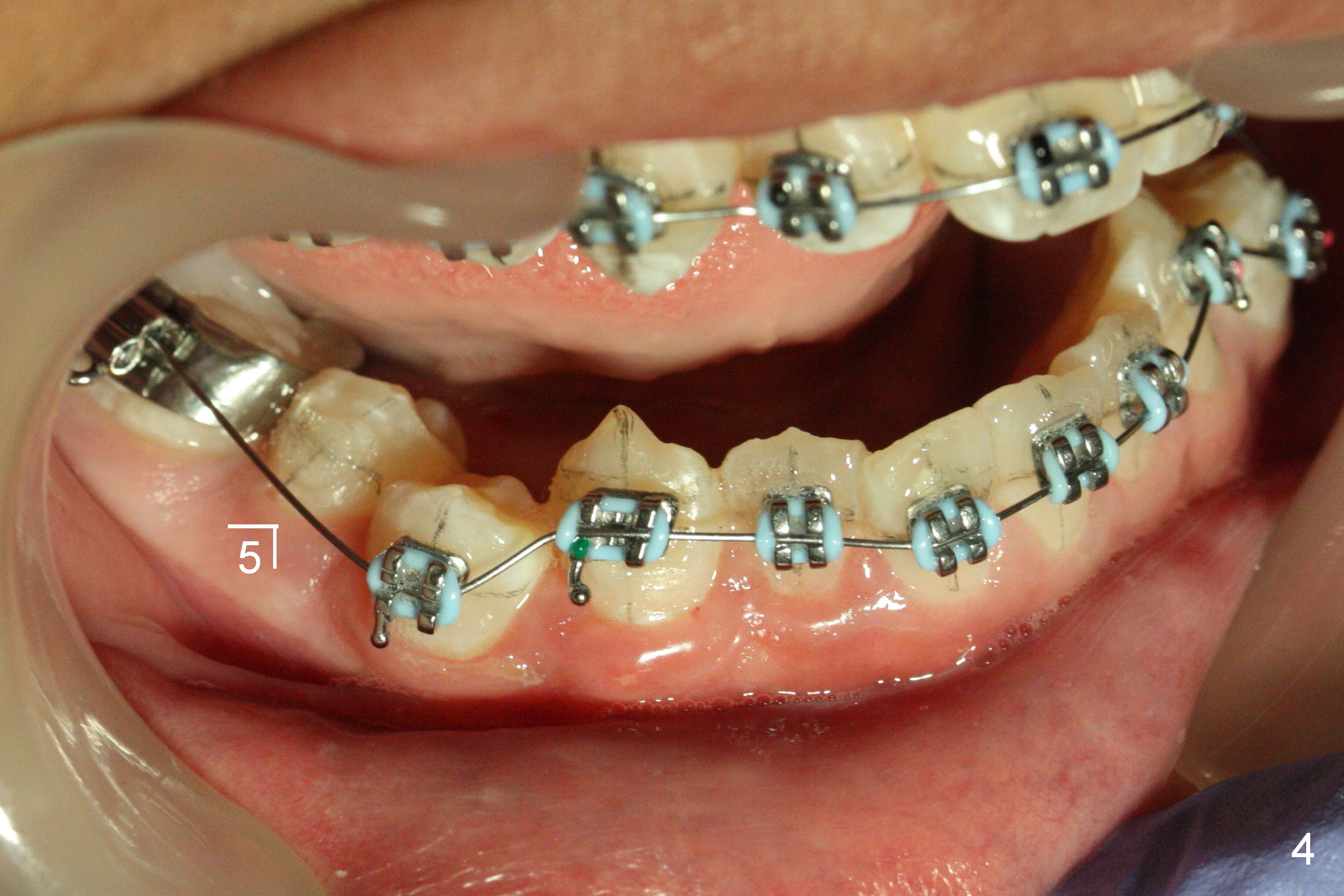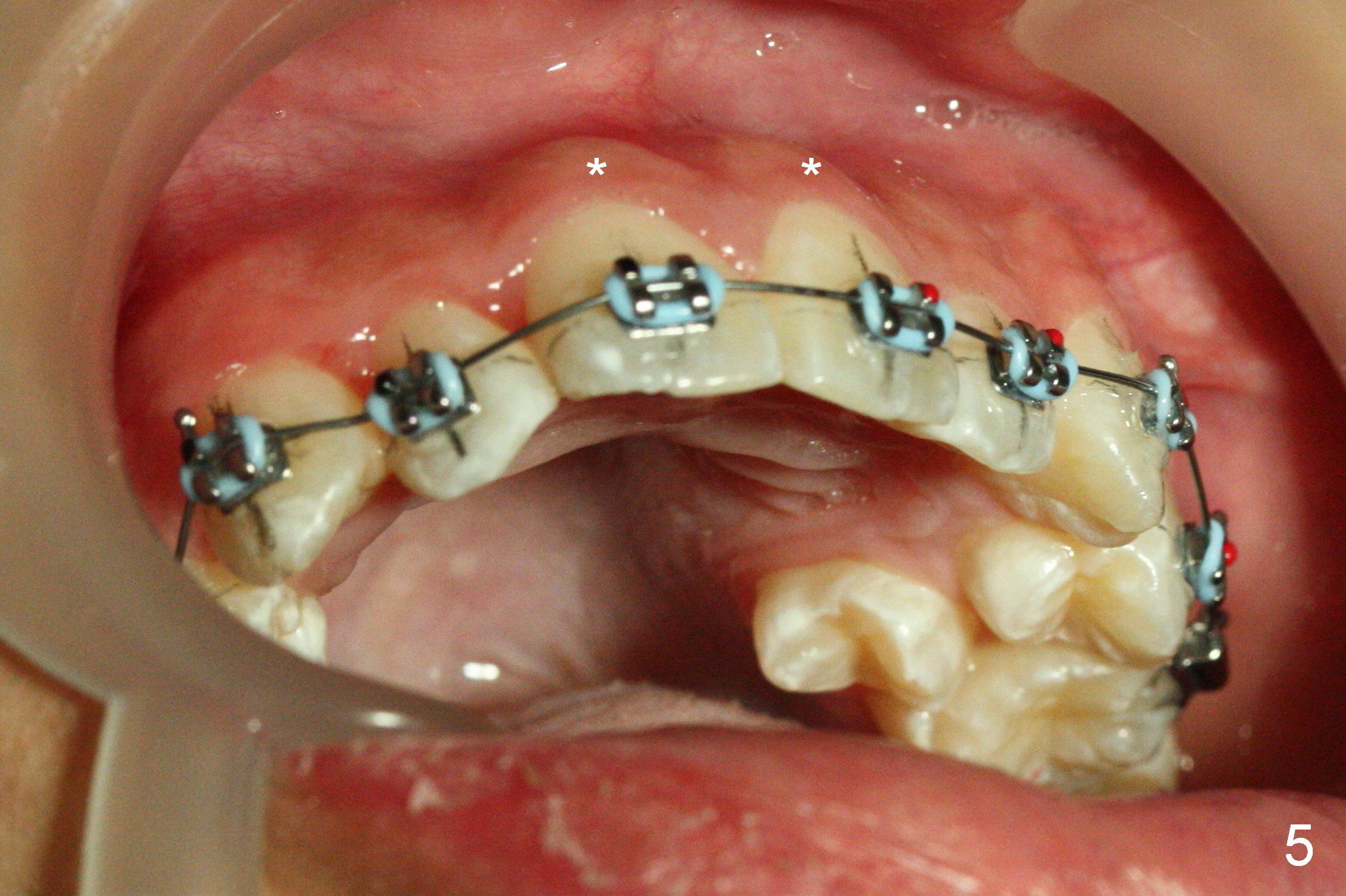The patient's oral hygiene improves prior to banding. Initially we decide to not place bracket at LR4 (because of being severely buccally displaced). When .014' niti wire is being loaded, the bracket at LR5 is debonded (Fig.1,4). Dental midline mismatch (Fig.2 black lines) and severe crowding (roller coaster of the arch wires, Fig.1-5) are evident. Composite is placed at L6s, because of lingual inclination of these molars (the opposing teeth biting the buccal tube of L6 bands). It is hoped that arch expansion will not exacerbate root prominence (Fig.5 *).