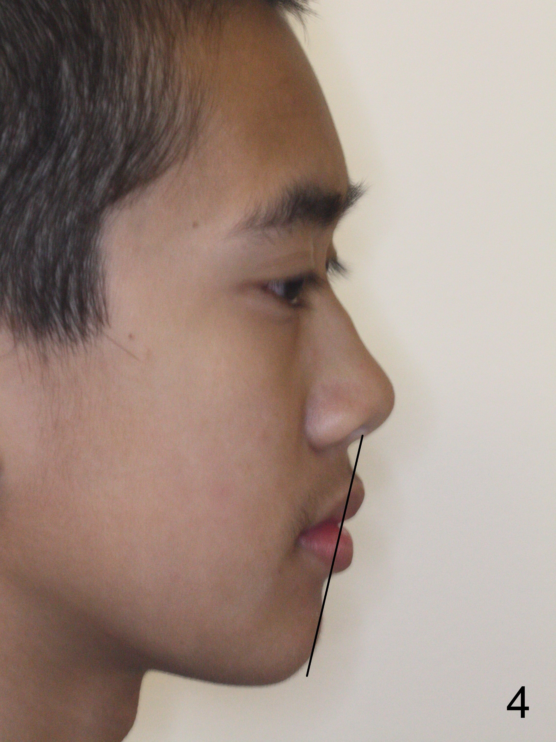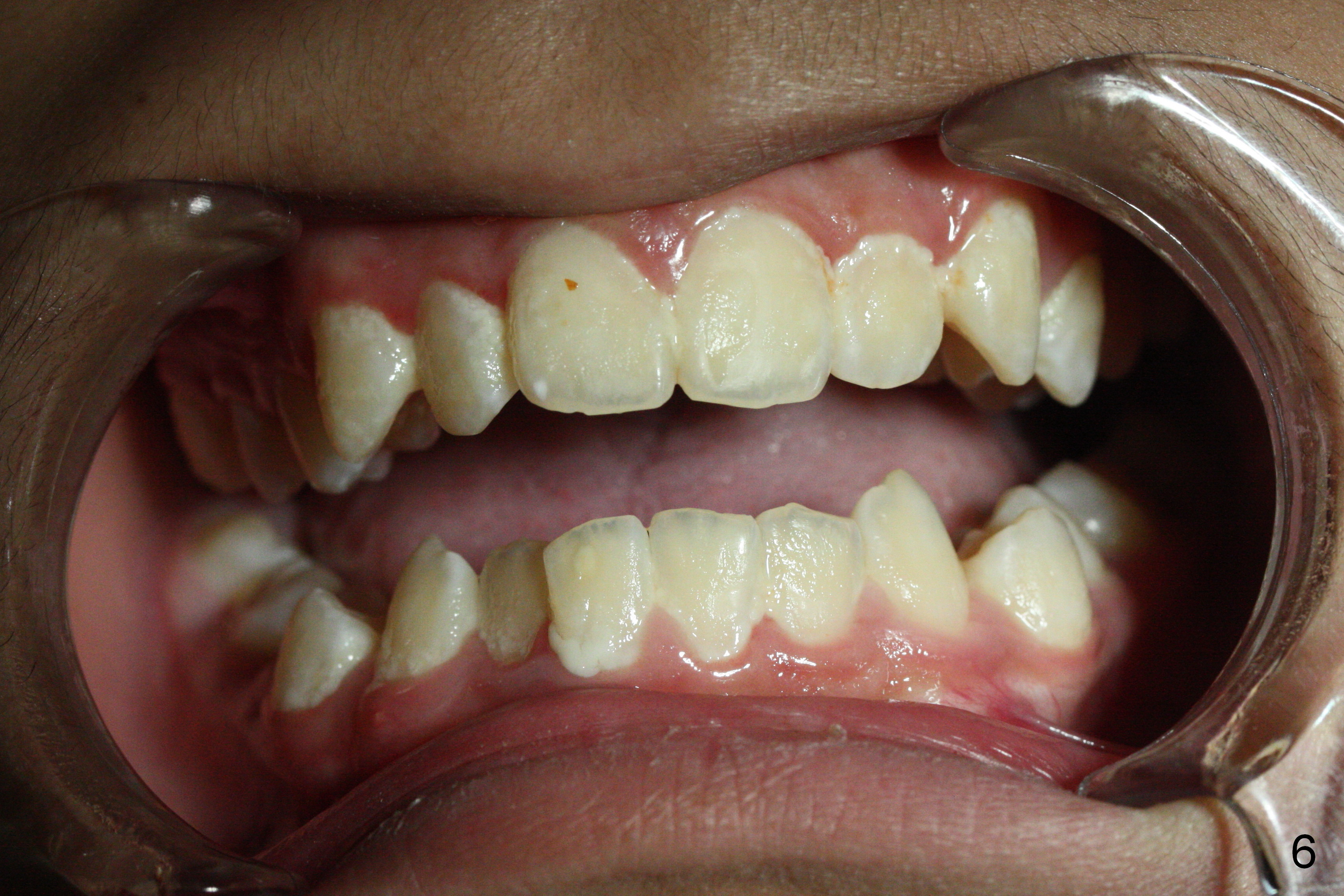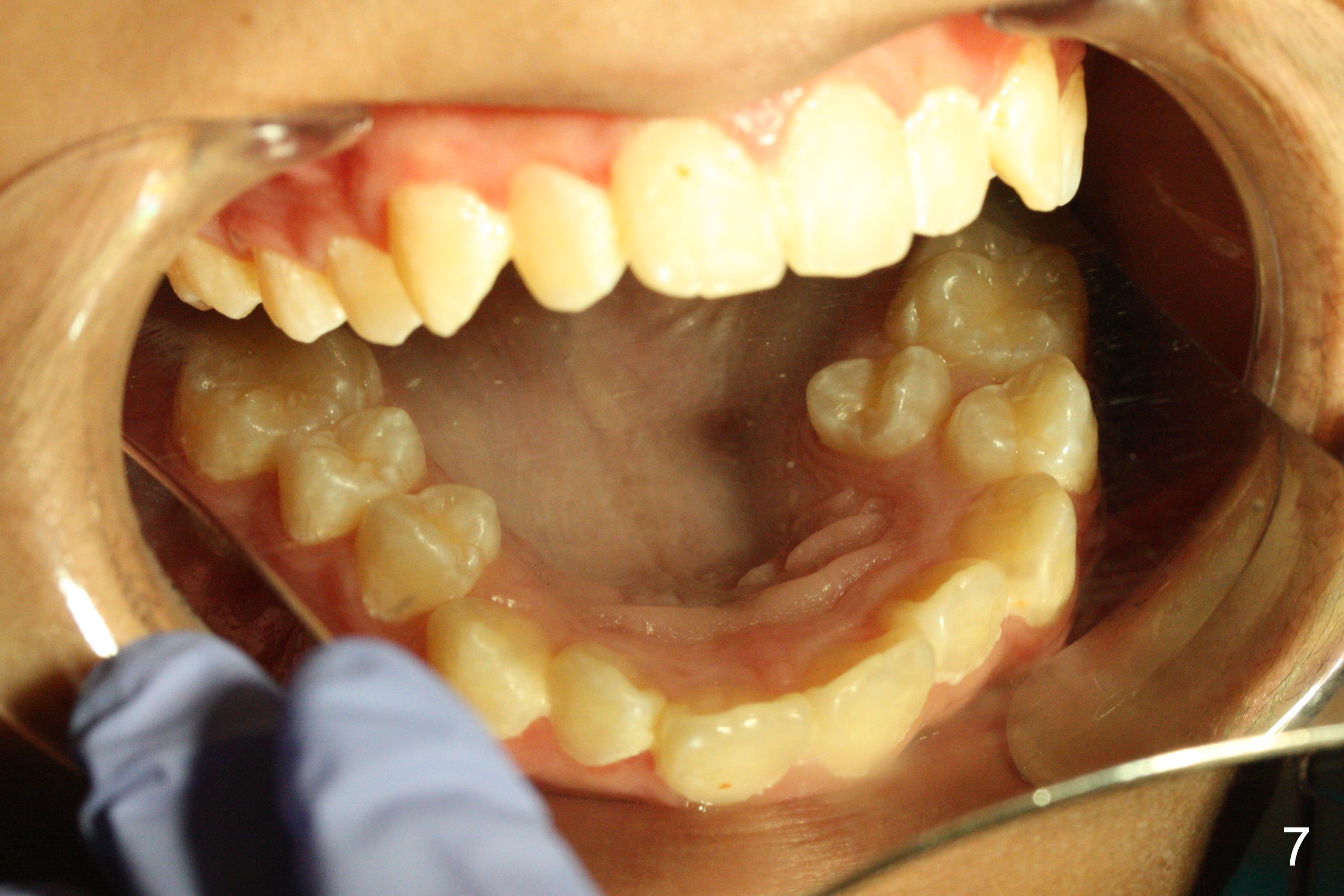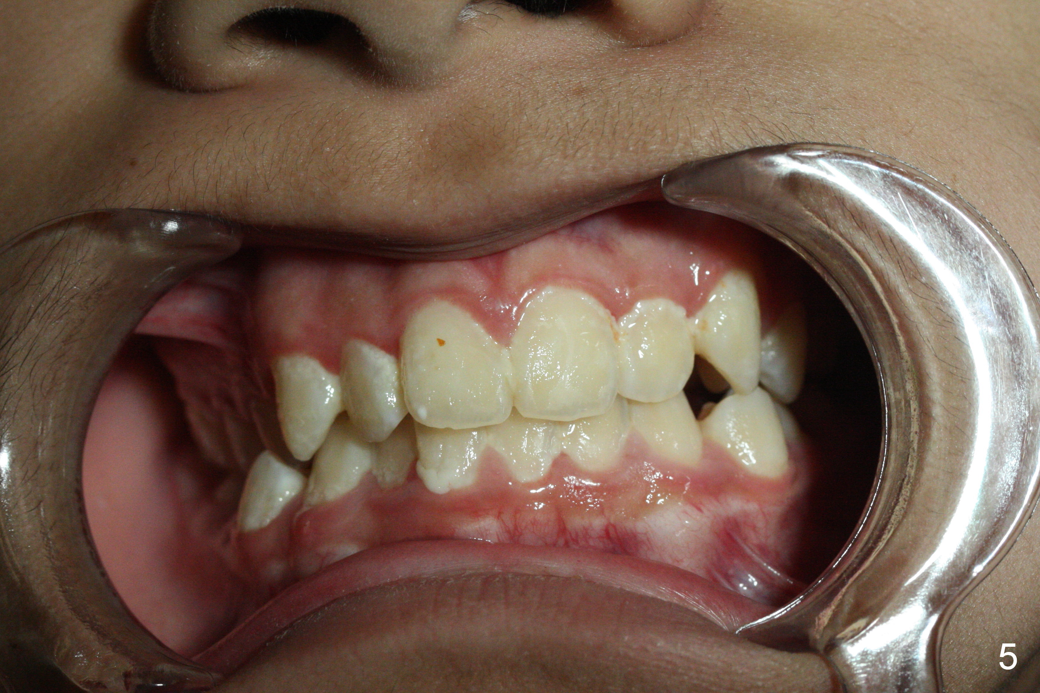 A 13-year-old man's malocclusion has two major components: upper midline deviation (Fig.2,5) and severe crowding (Fig.2,5-7). His mother resists extraction, in spite of facial profile analysis (Fig.4,4'). A second obstacle to orthodontic treatment is his poor oral hygiene (Fig.5-7). Before prophylaxis on Monday, can we decide together whether his oral hygiene has been improved drastically over the weekend? If not, banding and bracketing will be canceled on Tuesday.