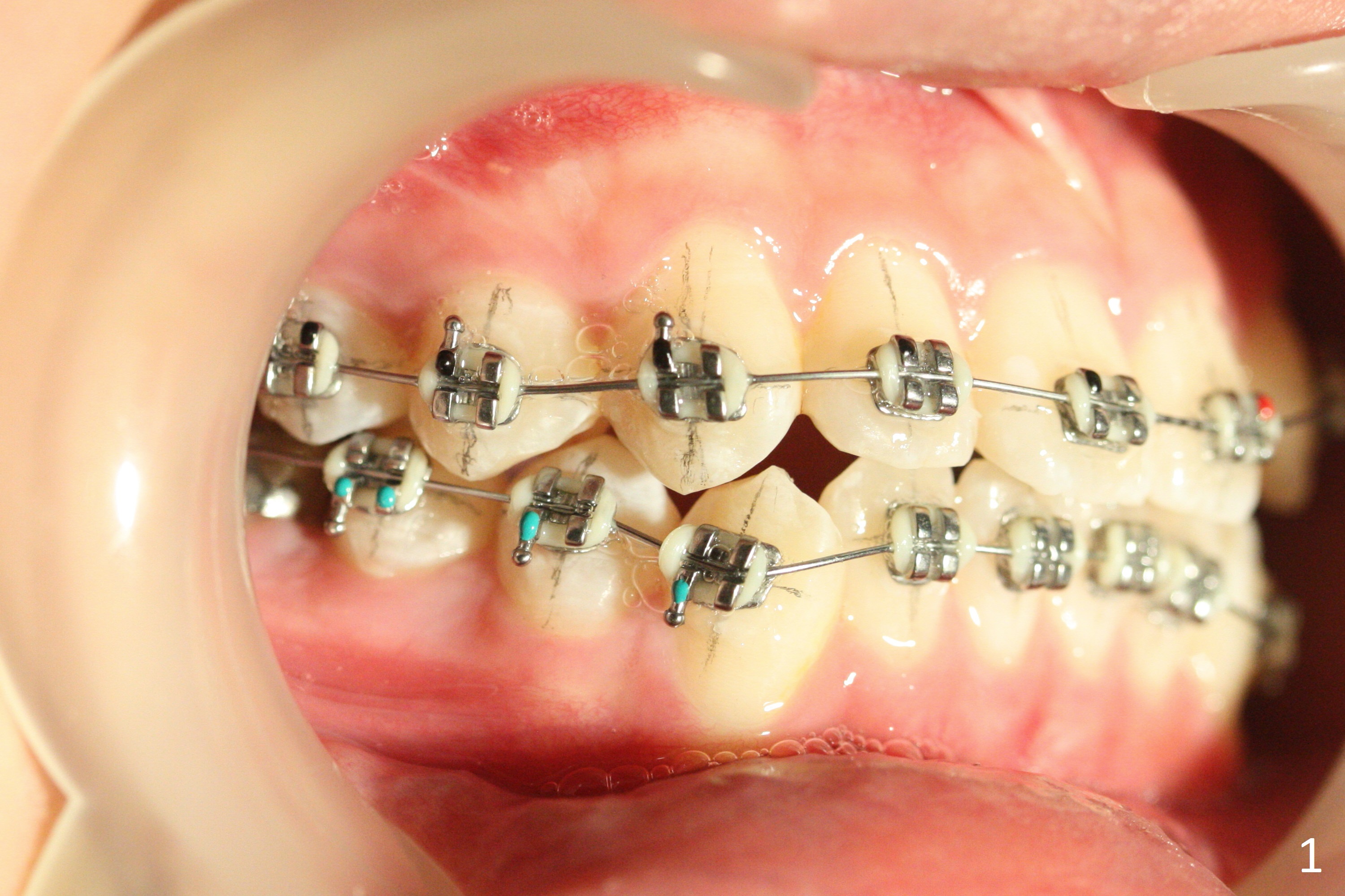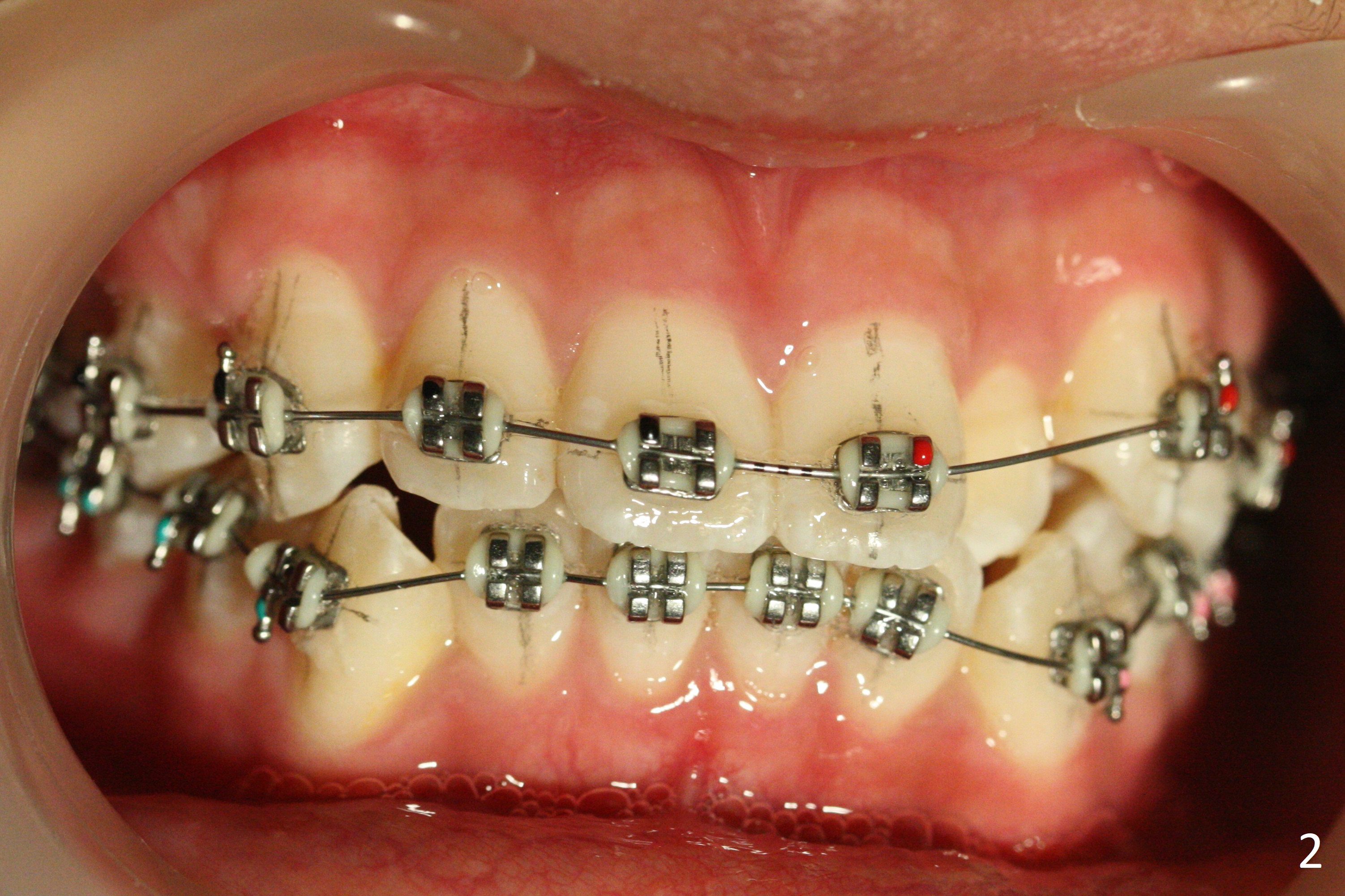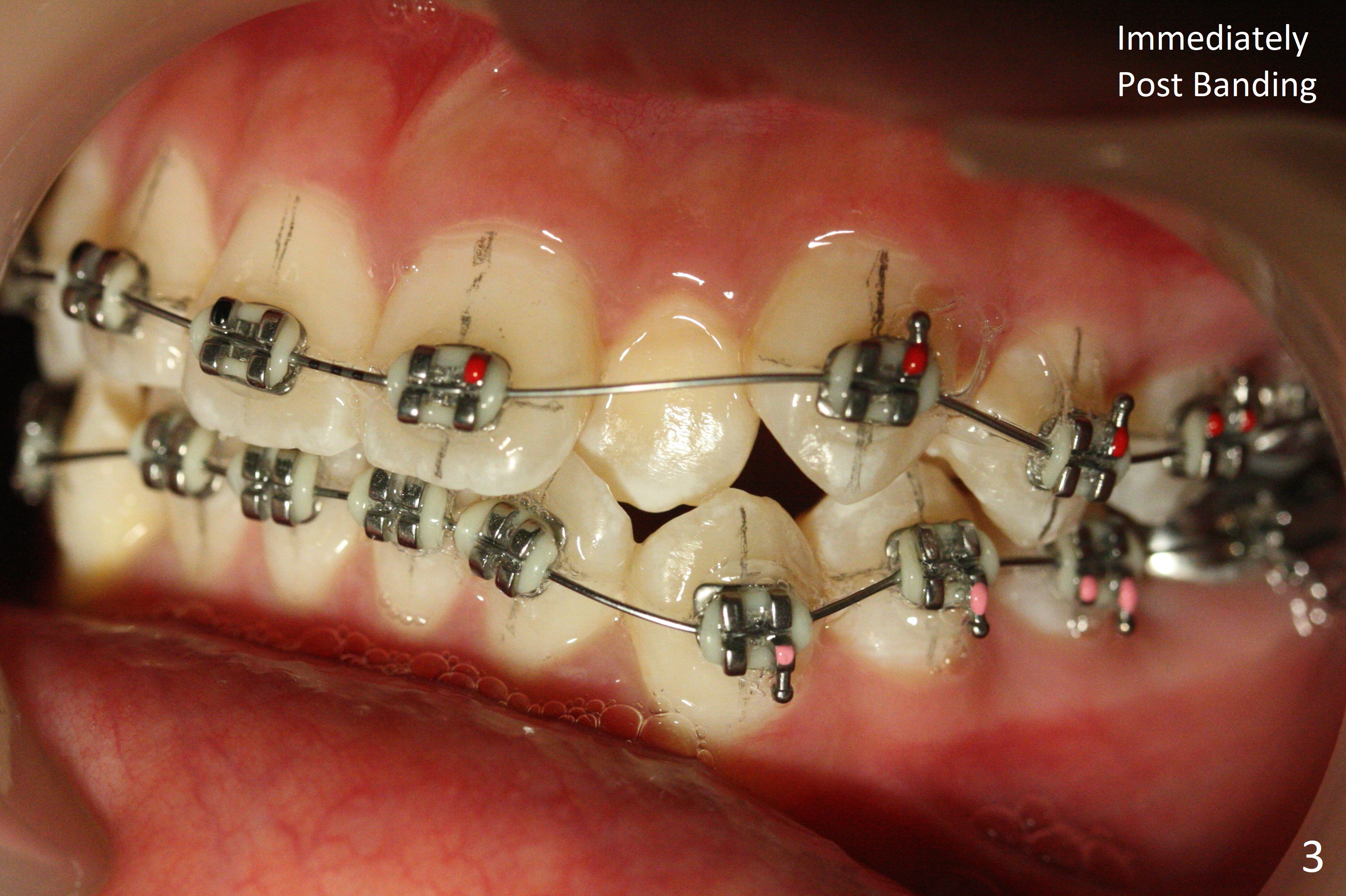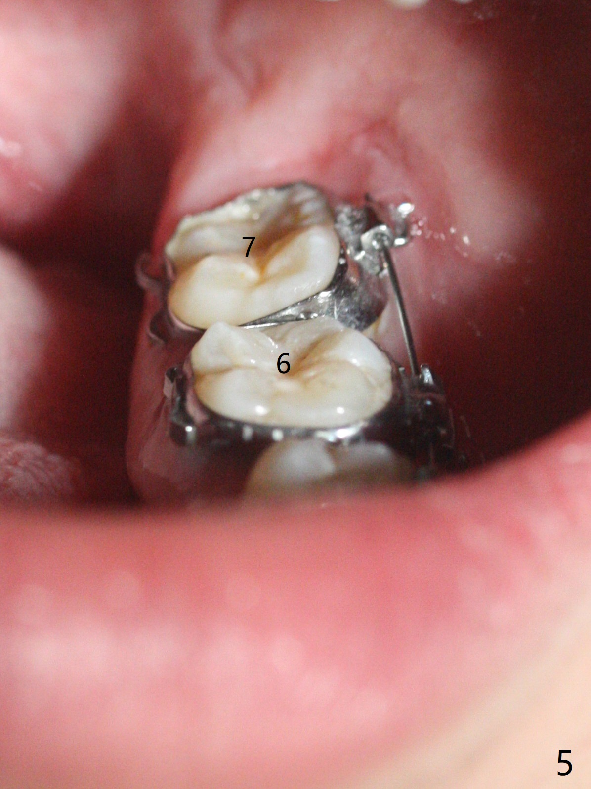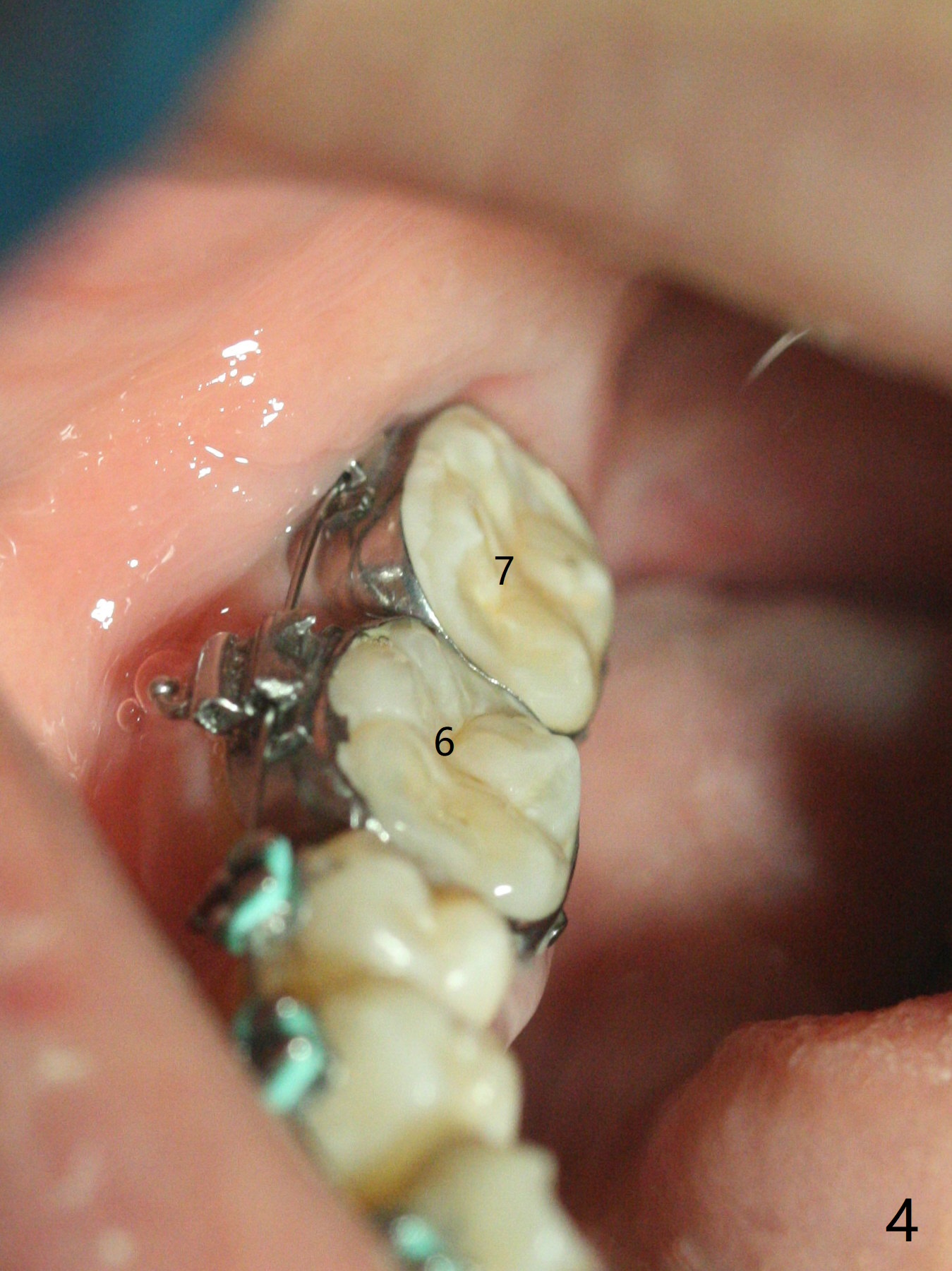 Immediate post banding, 14 niti wires bend abrupt at 3s (Fig.1-3). With arch wire sequence, will the canines extrude or the incisors intrude? L7s erupt ~7 months post banding. Bands are placed. It is difficult to insert 18 ss wire (from 18 niti for 2 appointments (coronavirus pandemic in between)) into the buccal tube of LL7 ~ 4 months later, which may be related to the linguoversion of the tooth (Fig.5 vs. 4). Interarch retraction is added.