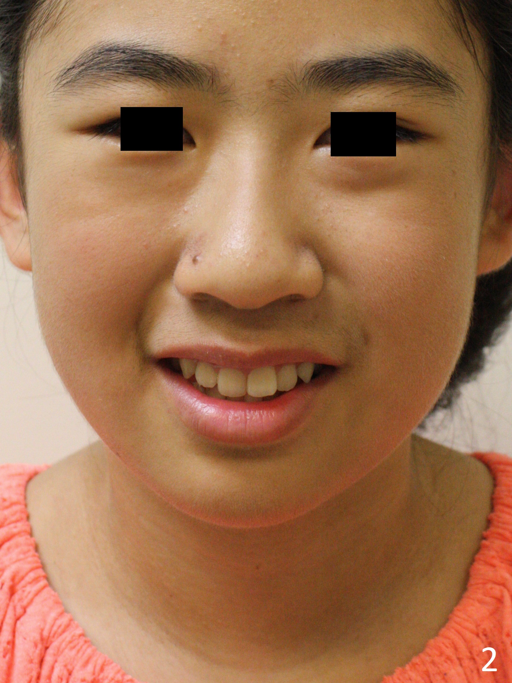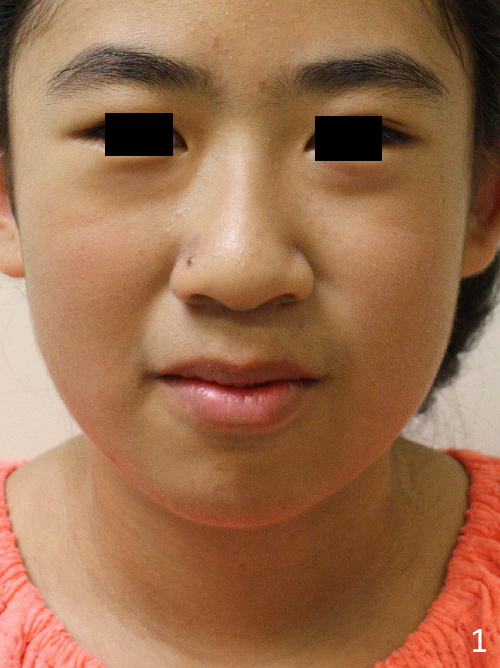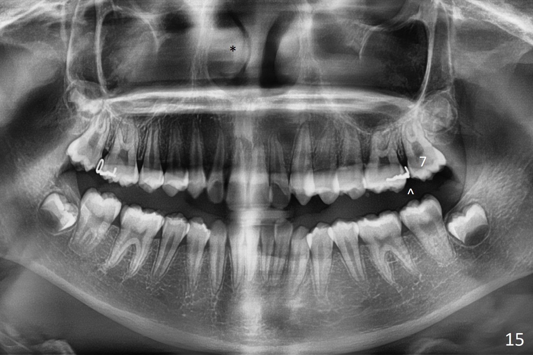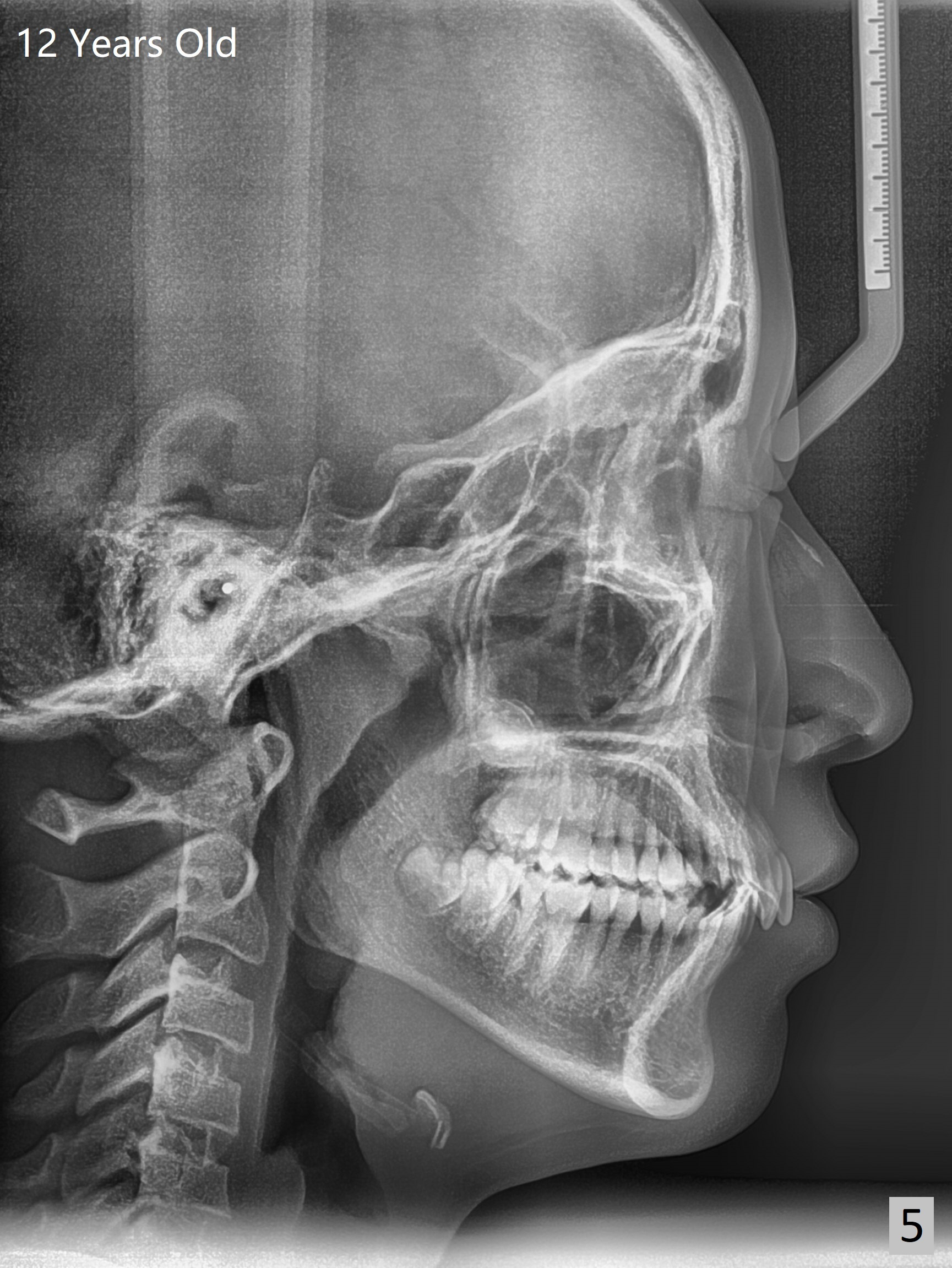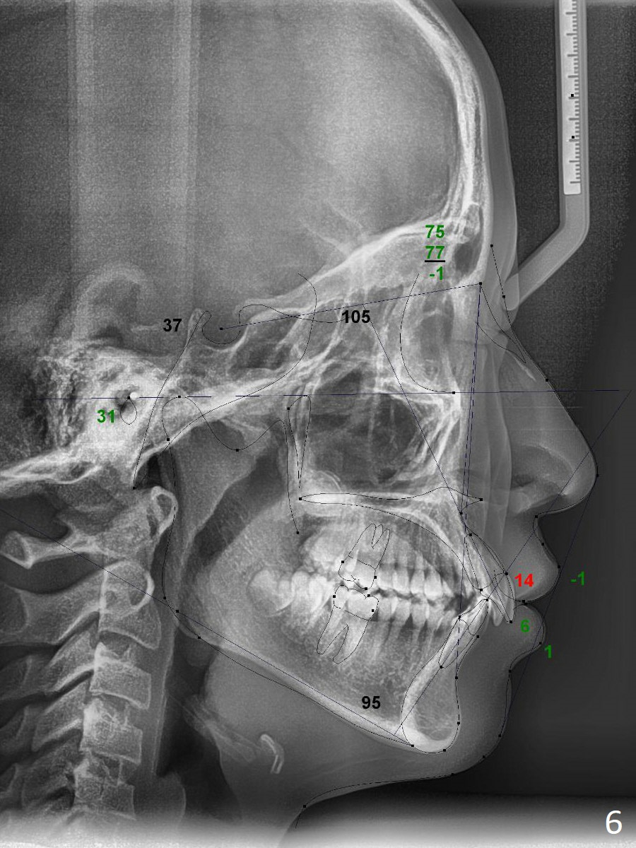 A 12-year-old woman has normal facial profile (Fig.1-6,12) and crowded dentition (7-11). Because of erupting 2nd molars (Fig.10,15), it is difficult to place rubber separators between U6/7. Copper ones are used instead (Fig.15 ^). Crowding and narrow arches (Fig.13,14) may be associated with the enlarged right Inferior Nasal Concha (Fig.15 *).