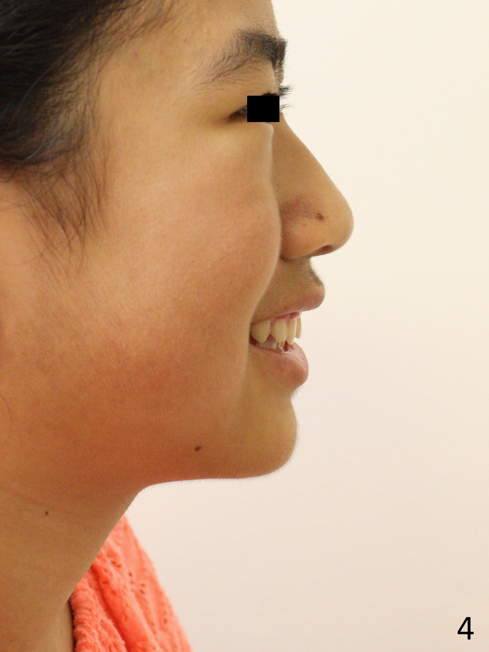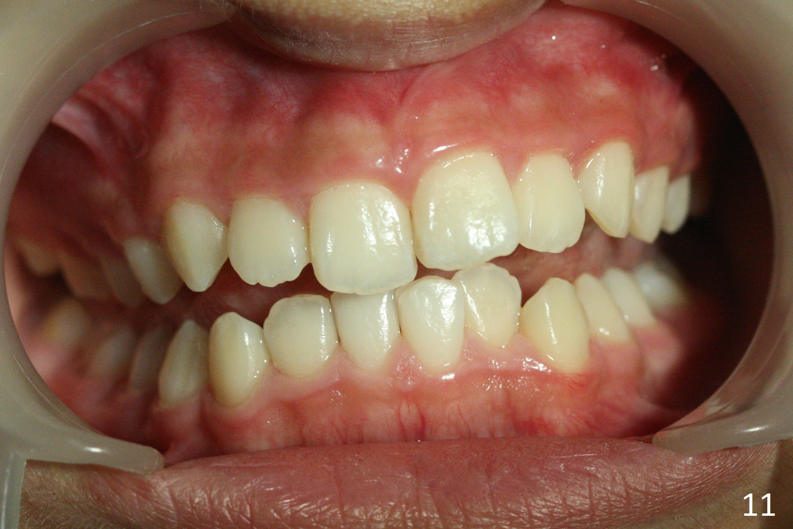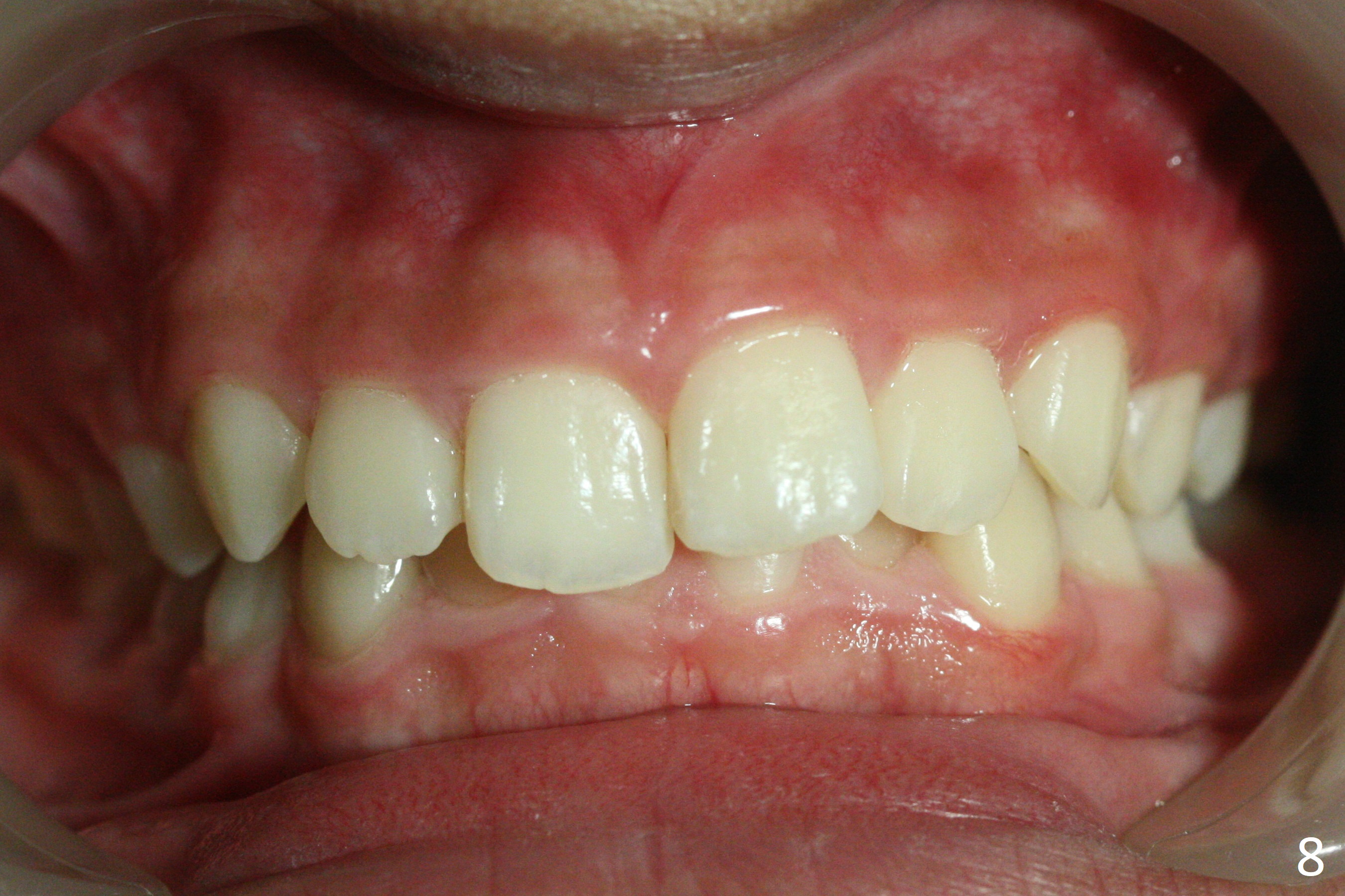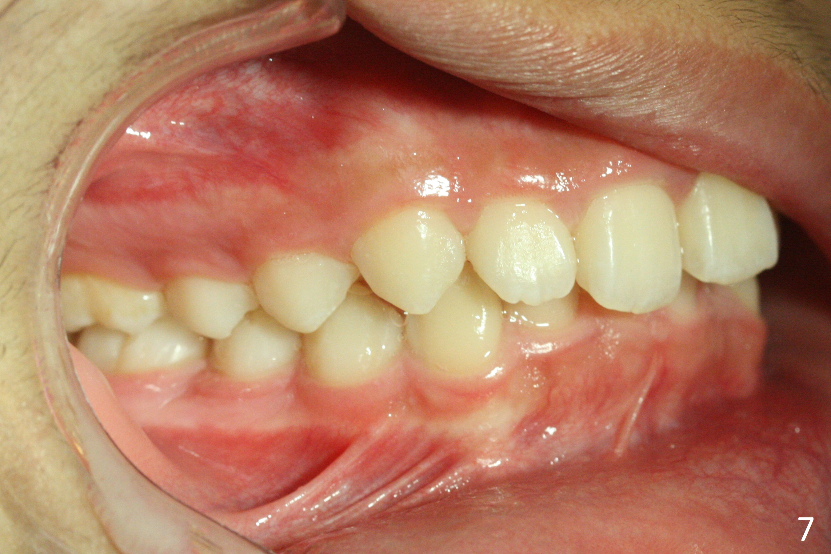 A 12-year-old woman has normal facial profile (Fig.1-6,12) and crowded dentition (7-11). Because of erupting 2nd molars (Fig.10,15), it is difficult to place rubber separators between U6/7. Copper ones are used instead (Fig.15 ^). Crowding and narrow arches (Fig.13,14) may be associated with the enlarged right Inferior Nasal Concha (Fig.15 *).