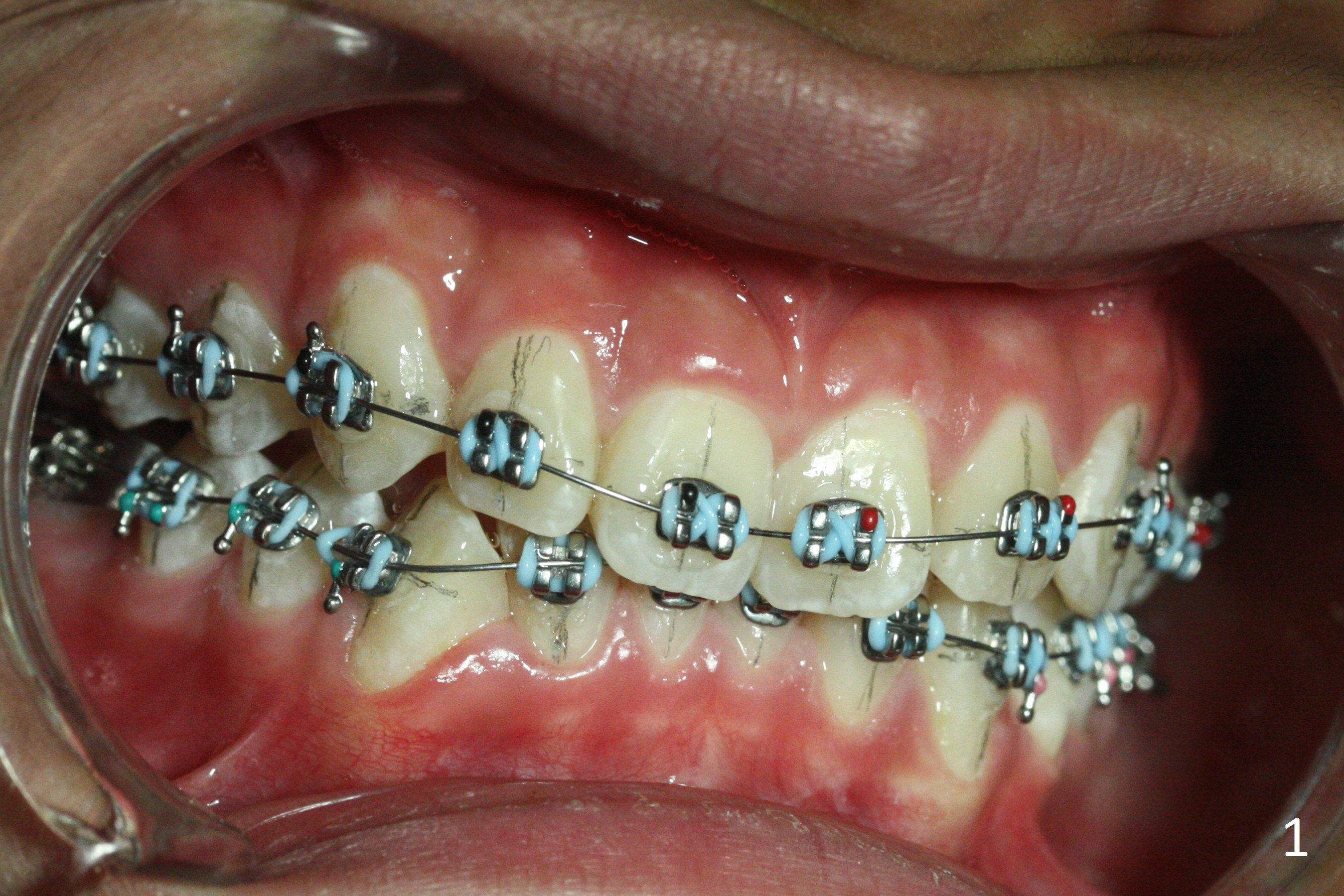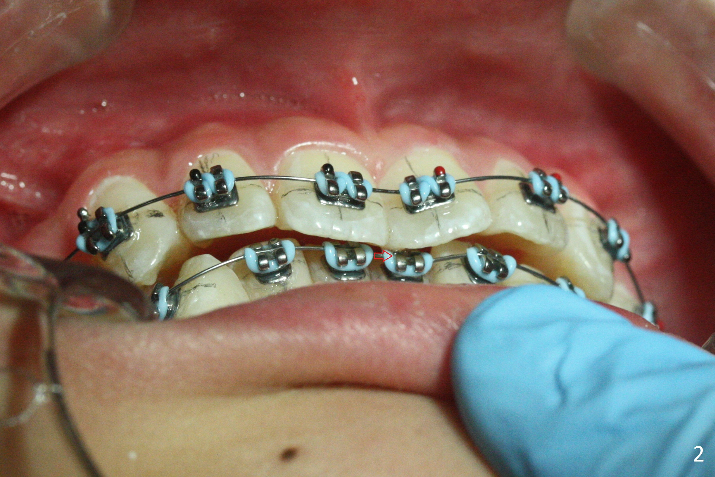 When banding and bracketing is finished, extrusion of the upper central incisors is noted (Fig.1). The bracket in the LL1 is contacted by the opposing tooth. After occlusal adjustment, the patient is able to close (Fig.2 arrow). If the deep bite and the rotation of the U1s were found preop (Fig4), bracketing were done for the upper arch first.