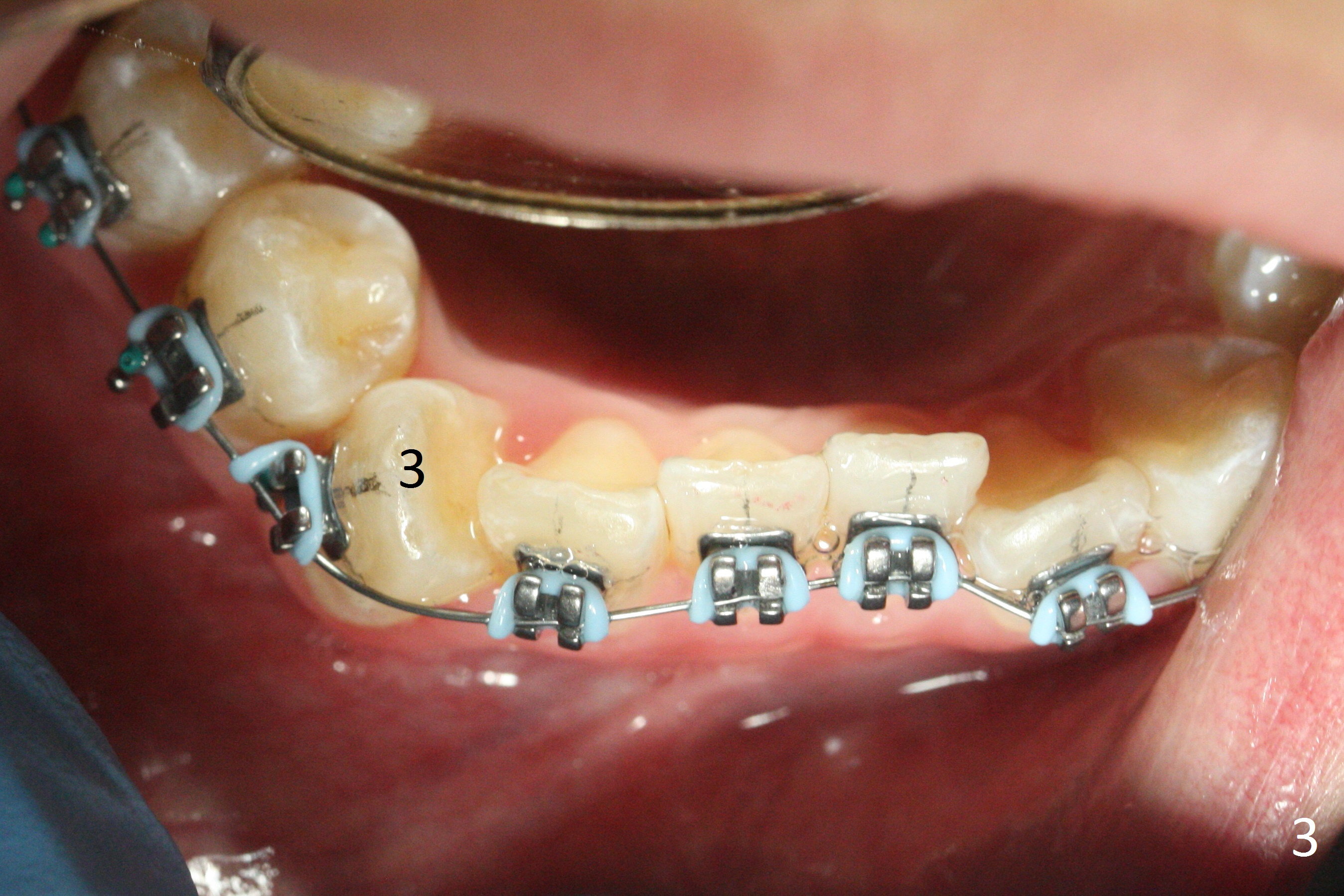 Rotation of LR3 is severe (Fig.3). Before changing to the next wire each time, check the tension and adaptation of the wire. Since LL7 is incompletely erupted, banding is done initially. Place a bracket before changing to 14 niti wire.