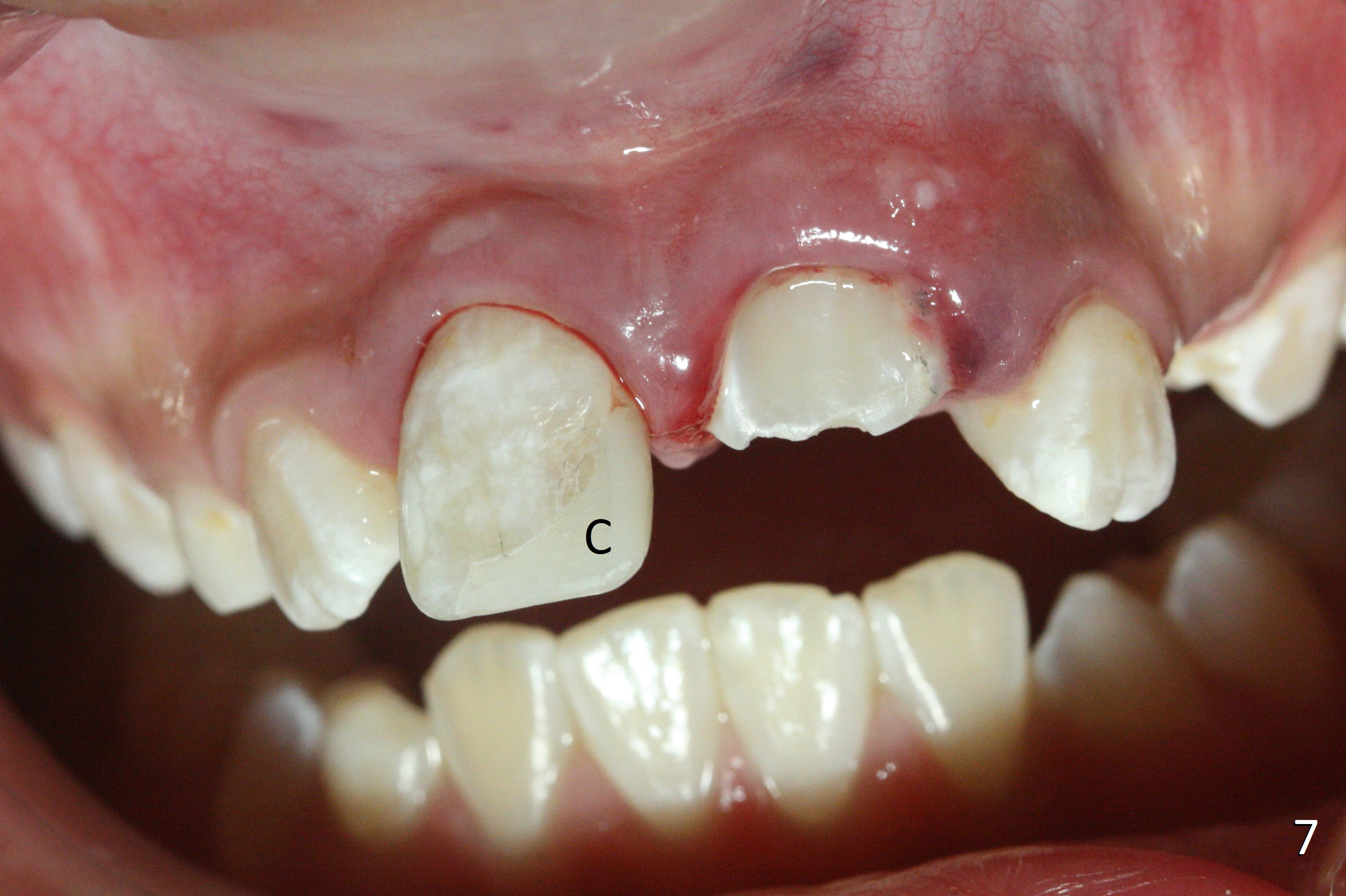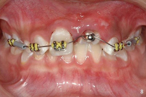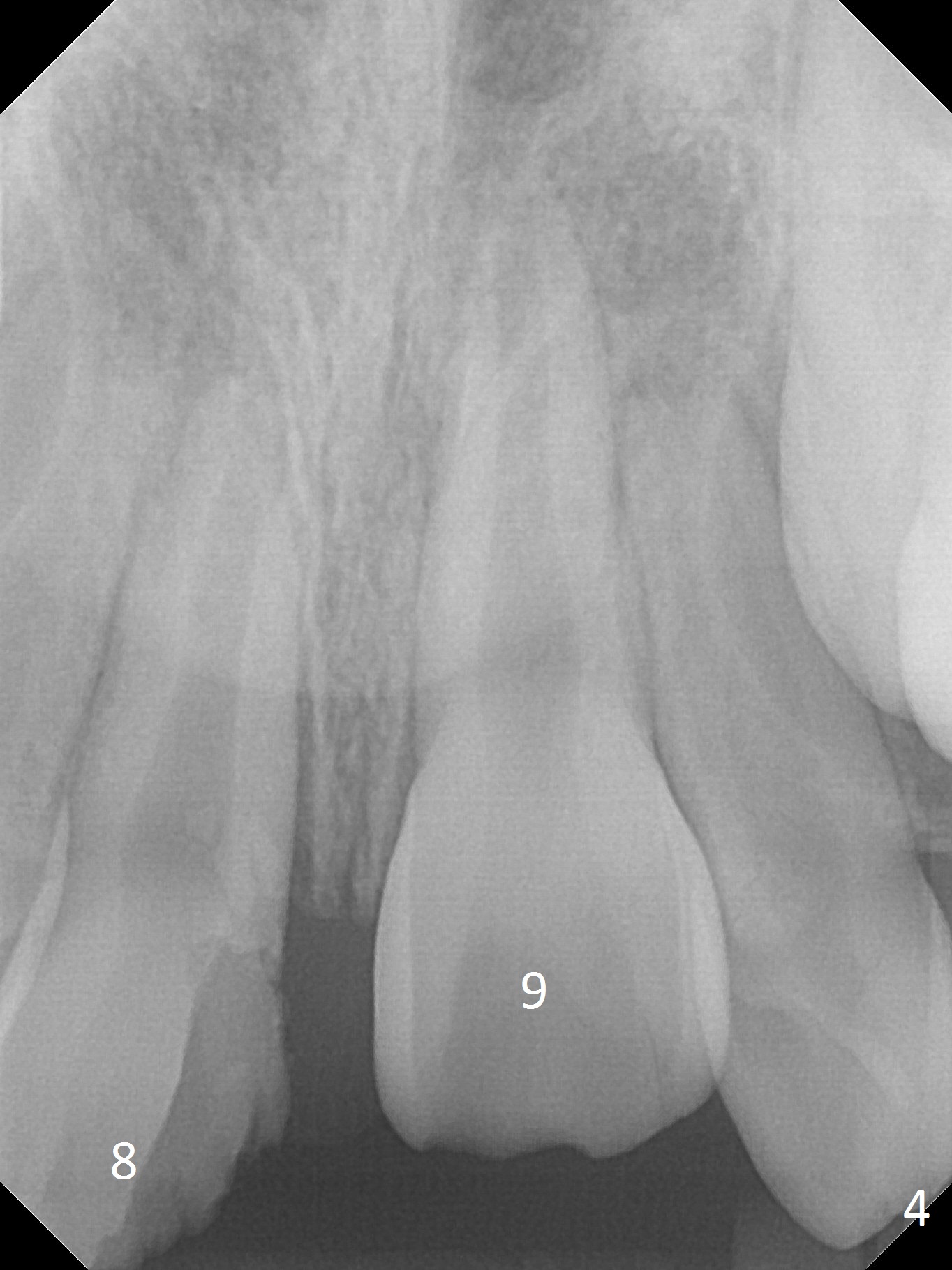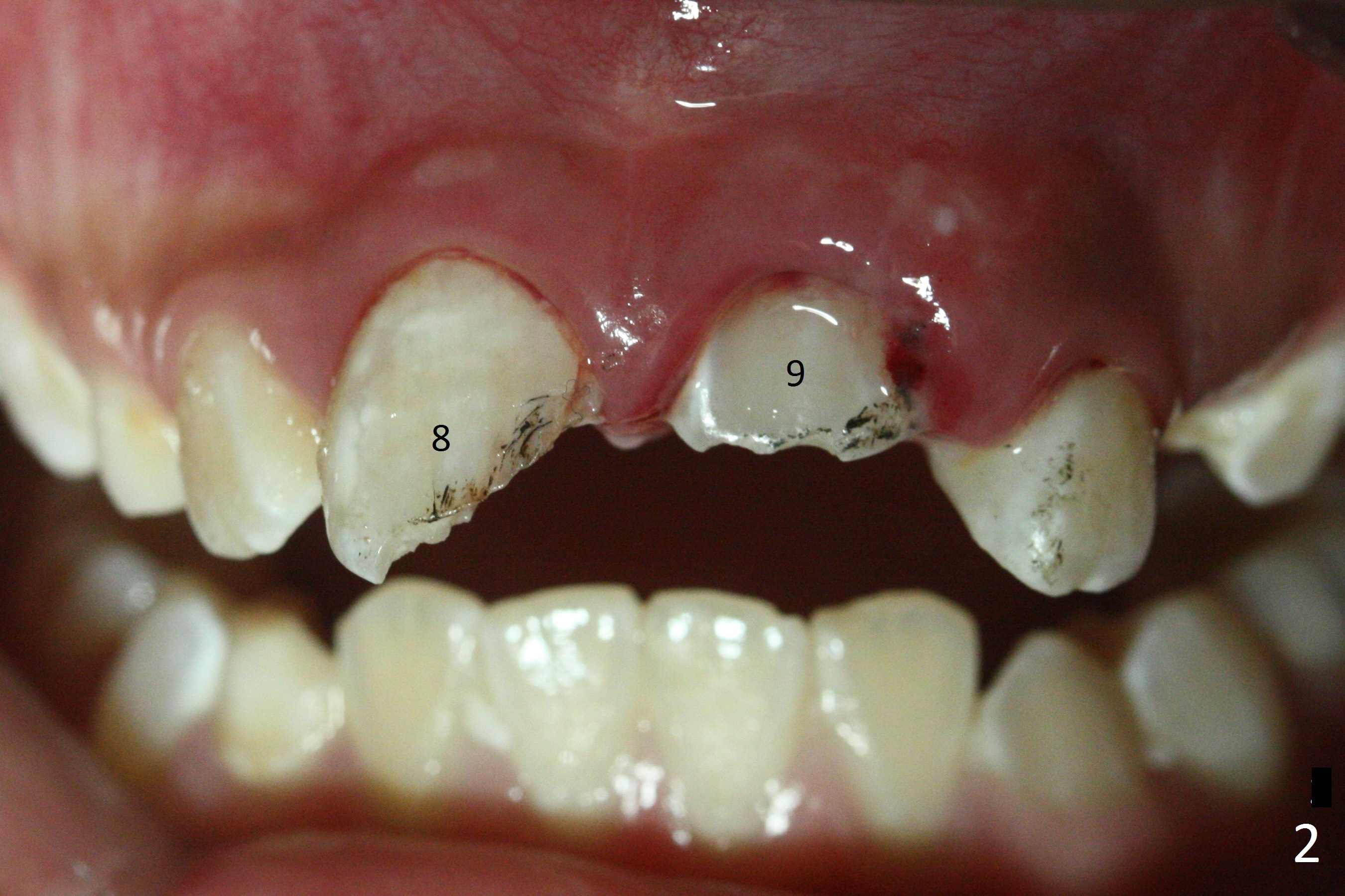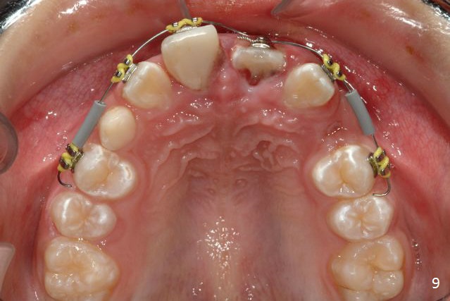 A 10-year-old boy has had Class II Division II malocclusion (Fig.1 impression taken 1 year earlier). He is brought to clinic the 2nd day after a bike accident. The tooth #8 fractures (Fig.2-4) with mesial pulpal horn exposure (Fig.3 *, while #9 intrudes. After debridement of the affected teeth (Fig.5), the exposed pulpal tissue is resected (partial pulpotomy to keep the tooth vital to finish root and apex development) and the pulpal horn is filled by MTA at #8 (Fig.6 *). The tooth #8 is restored with composite (Fig.7 C). Forceps fail to extrude the tooth #9. His parents are reluctant to accept orthodontic extrusion, which is accomplished by Dr. Shaughnessy 2 days later (Fig.8,9). The patient will leave for China in 2 days and will return in a month.