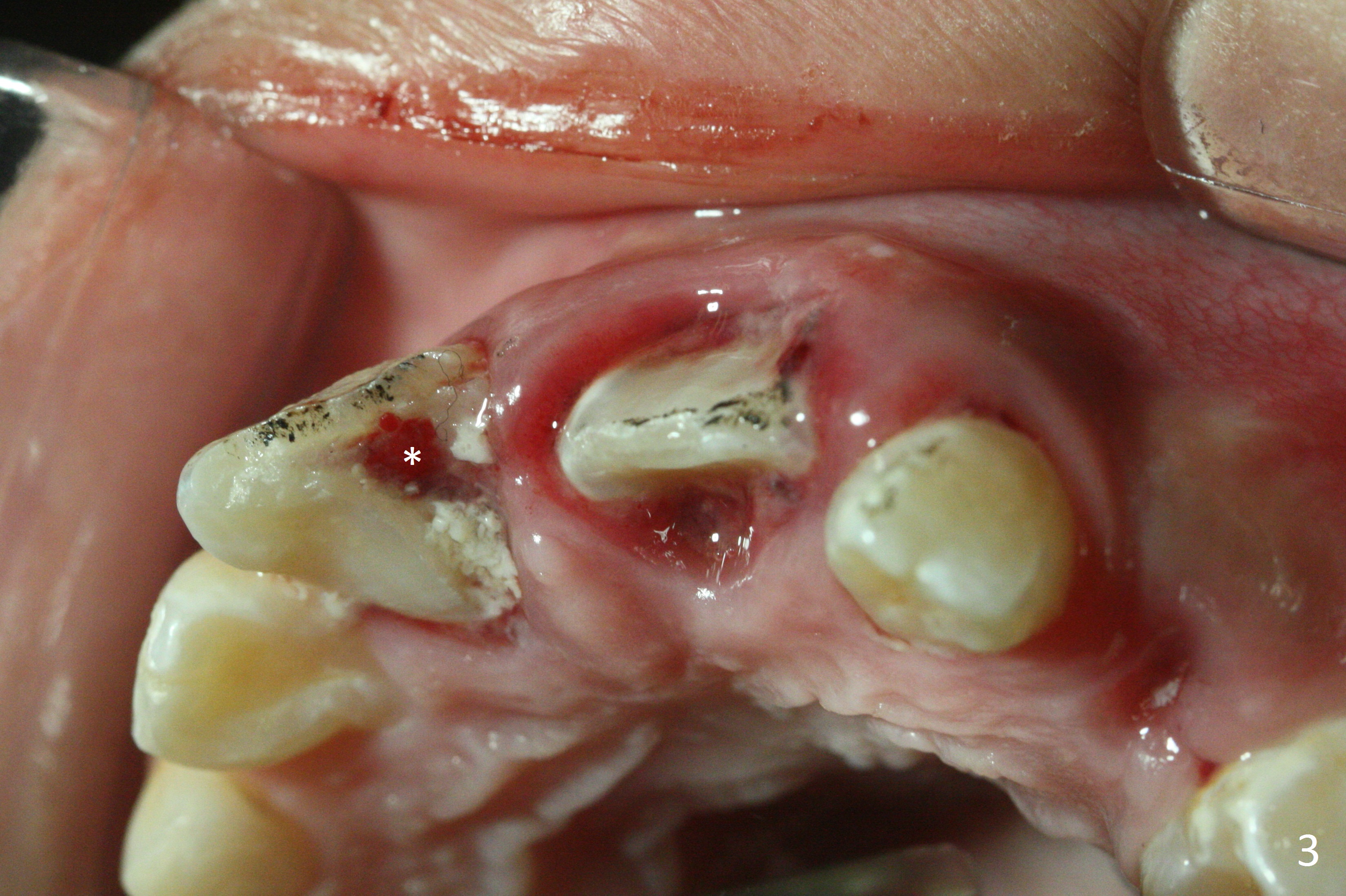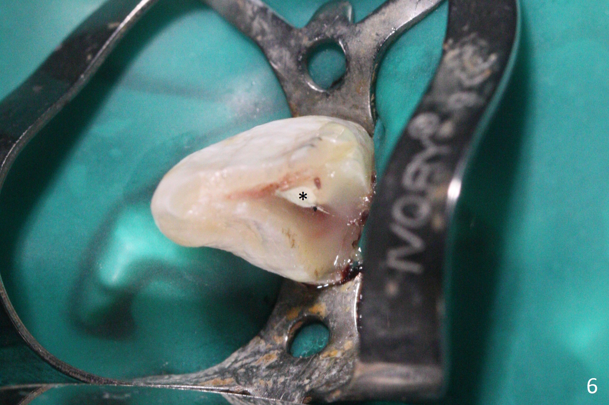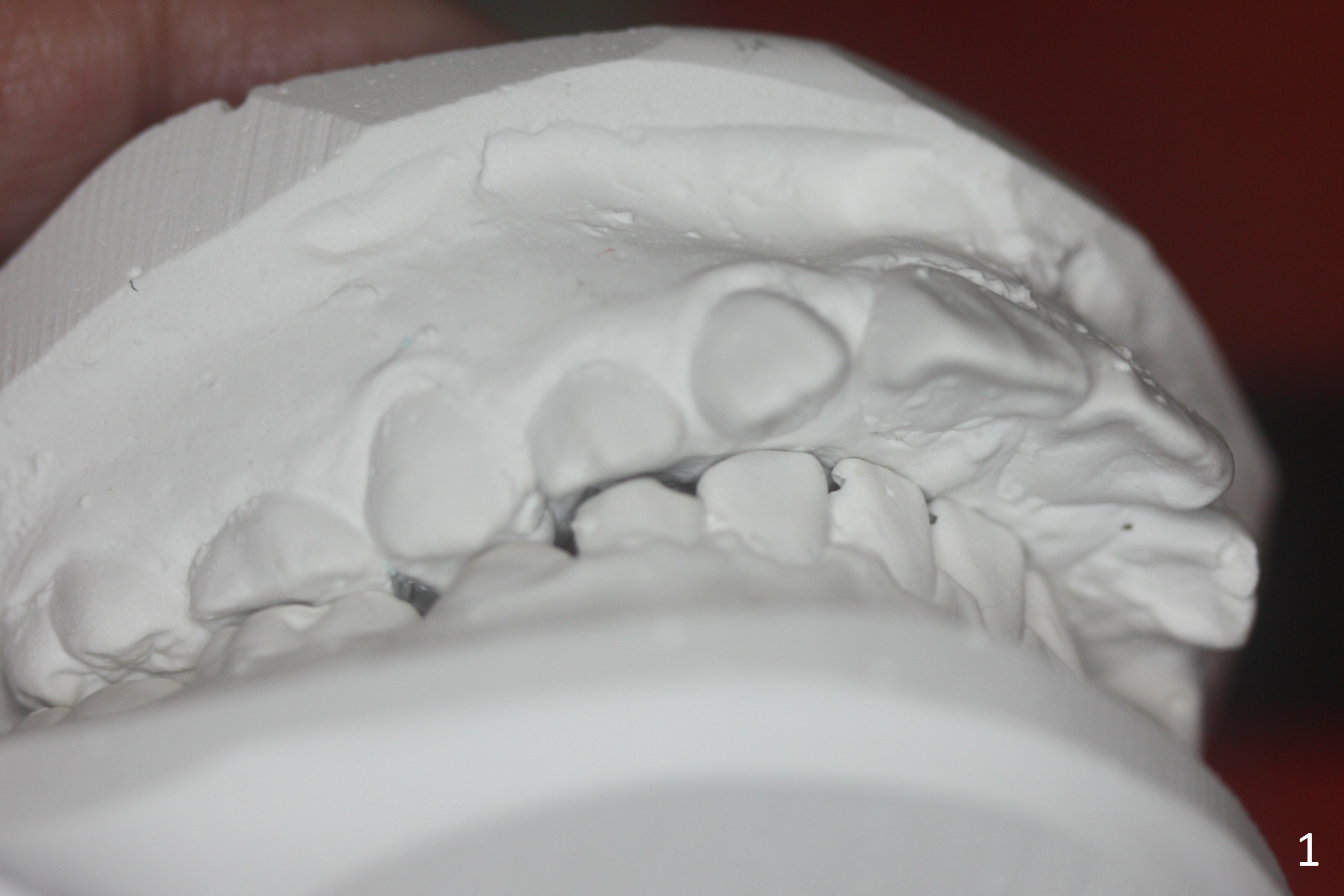 A 10-year-old boy has had Class II Division II malocclusion (Fig.1 impression taken 1 year earlier). He is brought to clinic the 2nd day after a bike accident. The tooth #8 fractures (Fig.2-4) with mesial pulpal horn exposure (Fig.3 *, while #9 intrudes. After debridement of the affected teeth (Fig.5), the exposed pulpal tissue is resected (partial pulpotomy to keep the tooth vital to finish root and apex development) and the pulpal horn is filled by MTA at #8 (Fig.6 *). The tooth #8 is restored with composite (Fig.7 C). Forceps fail to extrude the tooth #9. His parents are reluctant to accept orthodontic extrusion, which is accomplished by Dr. Shaughnessy 2 days later (Fig.8,9). The patient will leave for China in 2 days and will return in a month.
