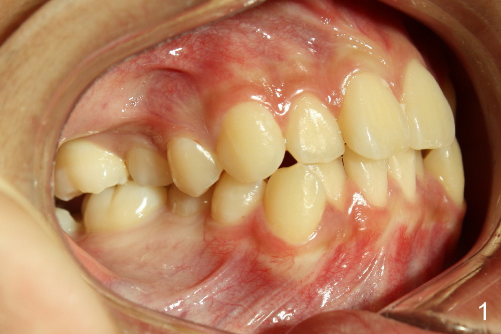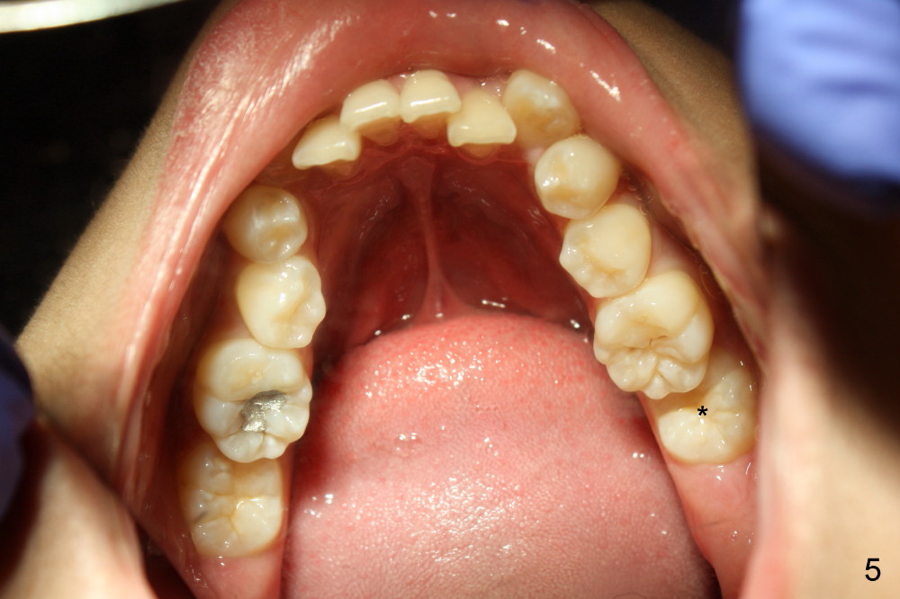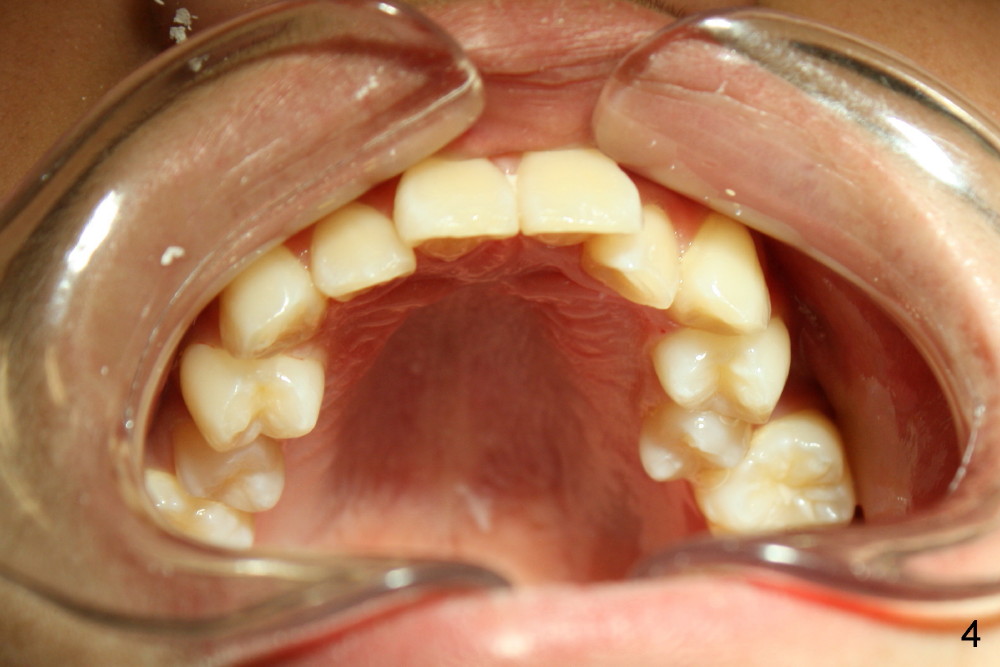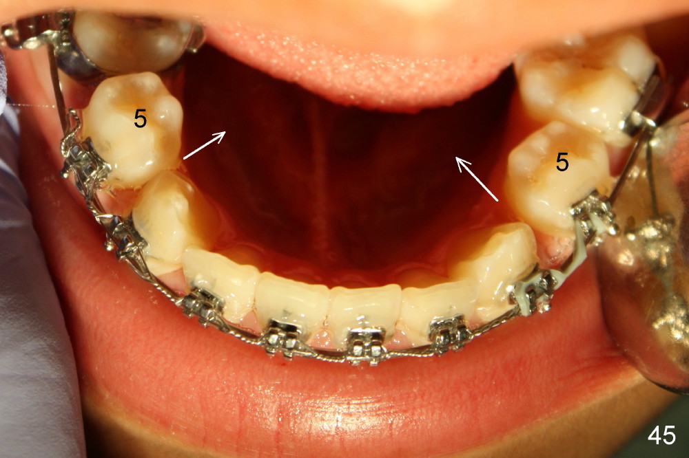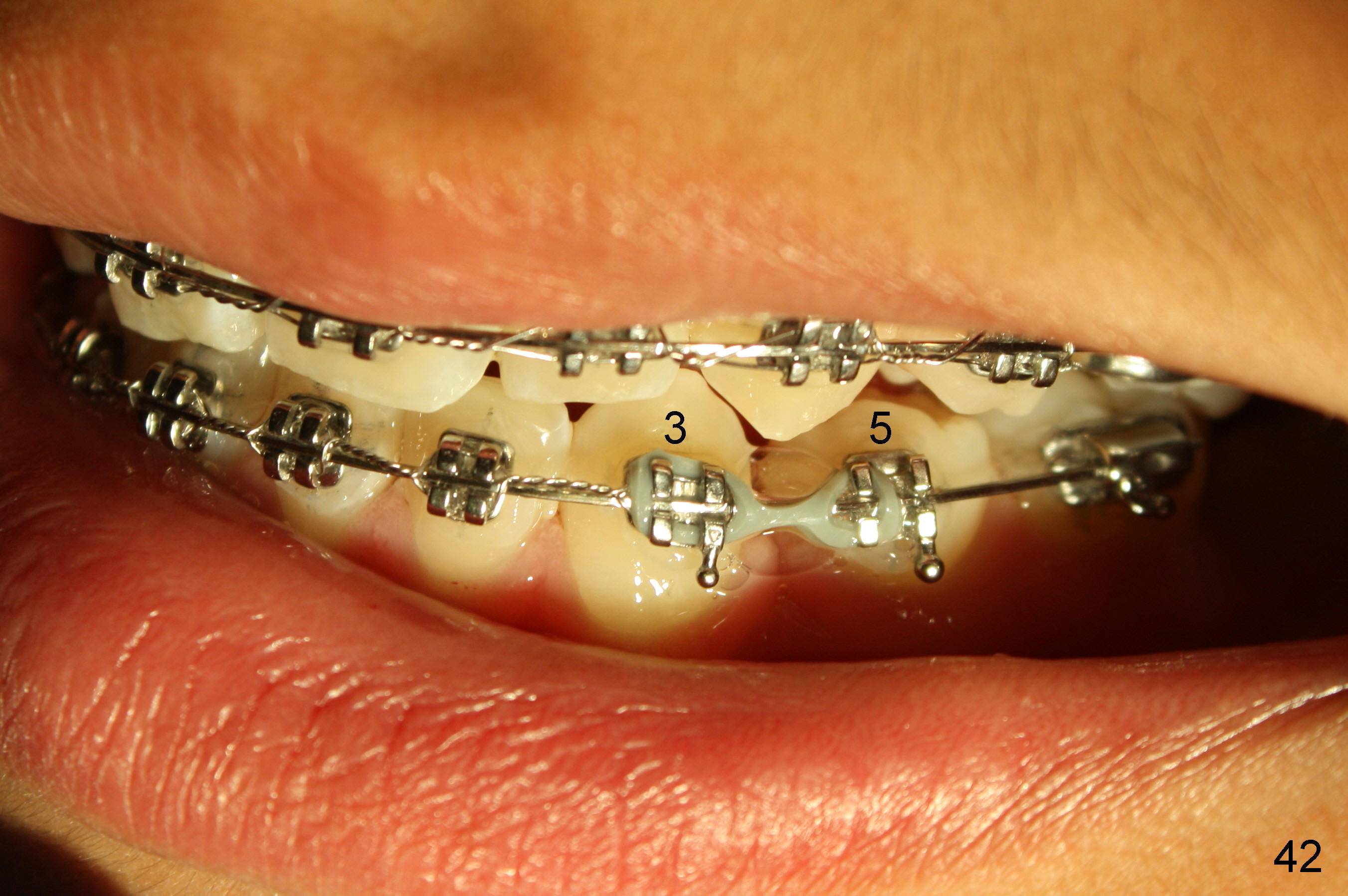 The kid returns 1 month 10 days after last visit. Wires change to 16x22 ss with figure-8 wires placed between UR3 and UL4 and between LL3 and LR 4 (Fig.41-45). A separator is placed between LL6 and 7.