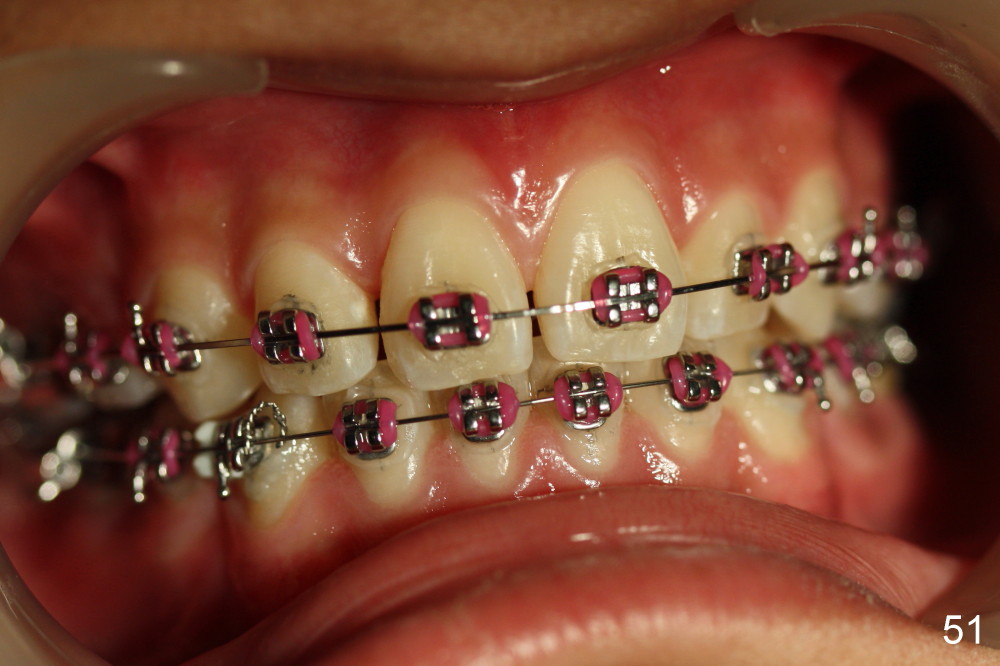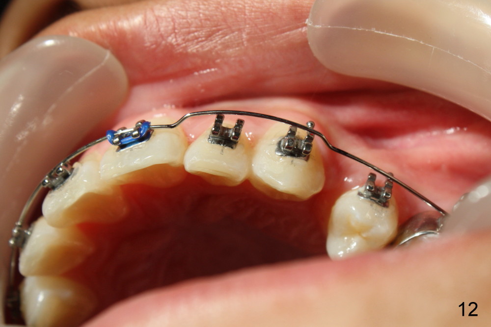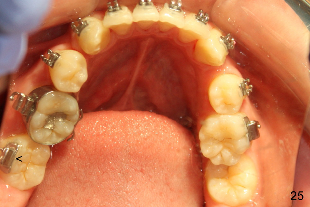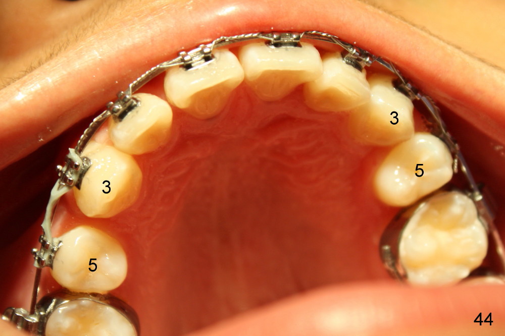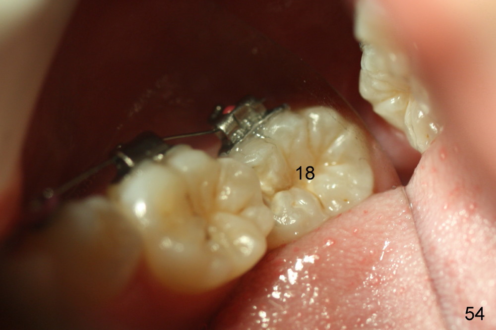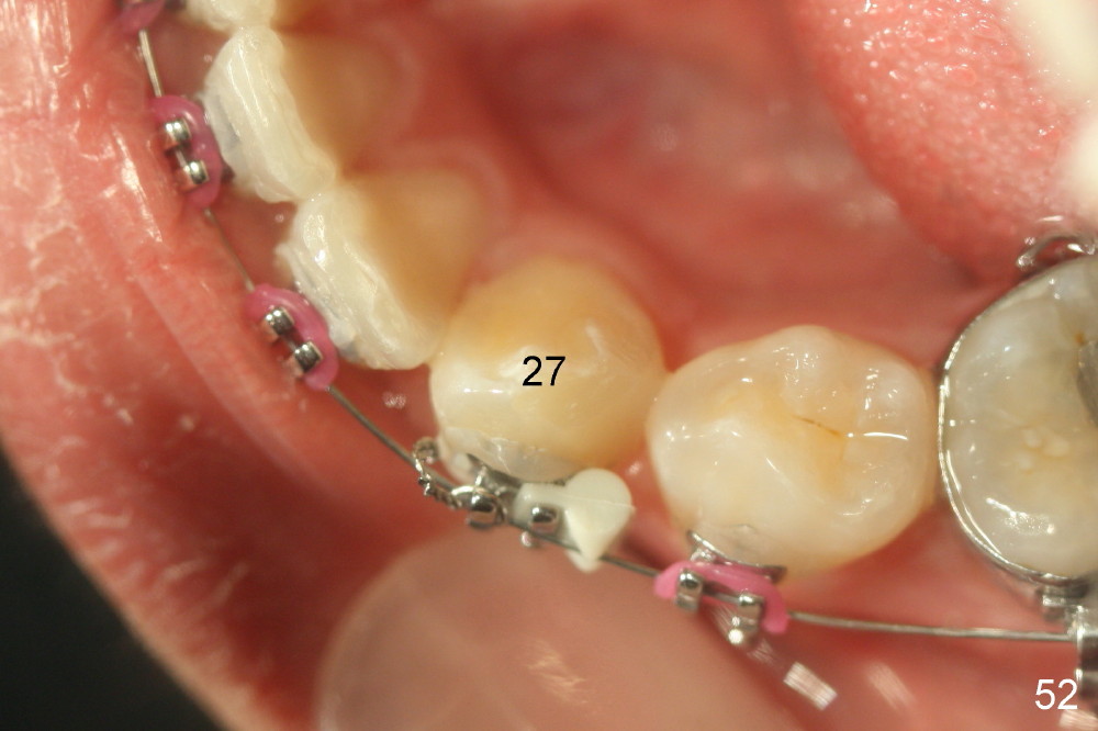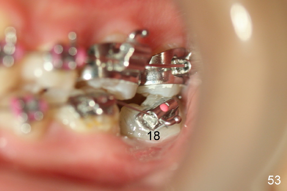 Two months later, LL7 (#18 in Fig.53,54) appears to be uprighted by itself (probably due to mesialization of the teeth mesial to it); a bracket is placed with .012 niti wire. No power chains are used to close the diastemata among the upper teeth, since the anterior overjet is minimal. A rotation wedge is placed in the distal wings of #27 to fix rotation. Is it right?