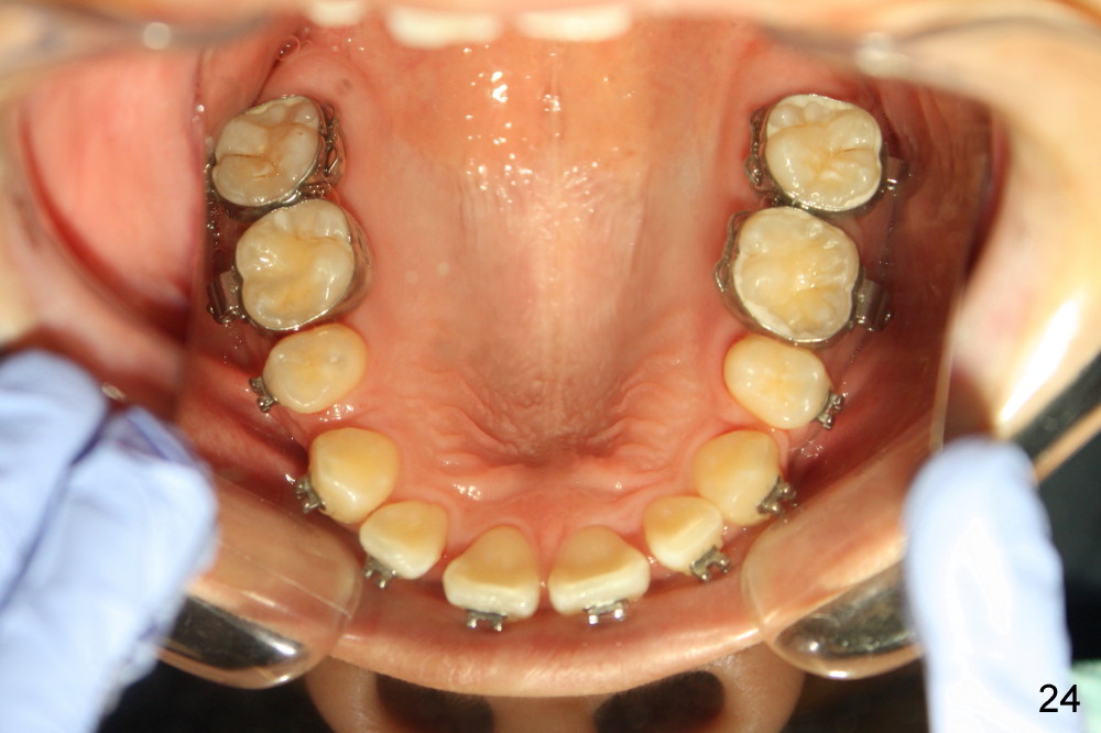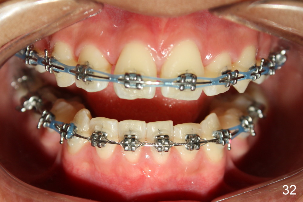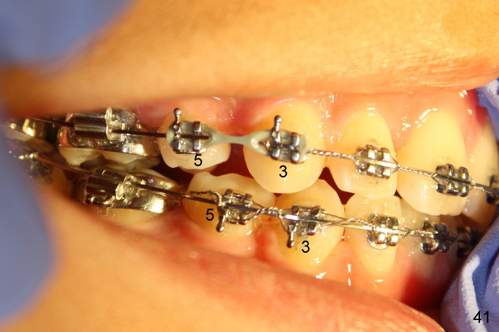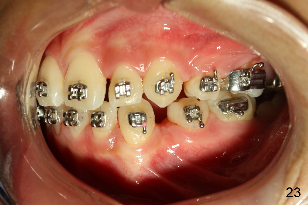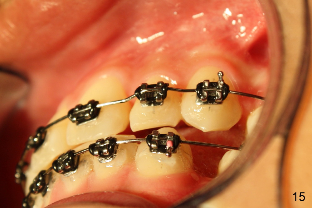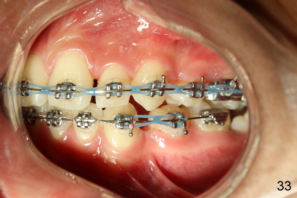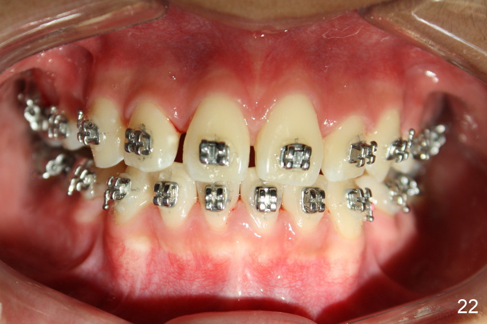 Two months later, LL7 (#18 in Fig.53,54) appears to be uprighted by itself (probably due to mesialization of the teeth mesial to it); a bracket is placed with .012 niti wire. No power chains are used to close the diastemata among the upper teeth, since the anterior overjet is minimal. A rotation wedge is placed in the distal wings of #27 to fix rotation. Is it right?