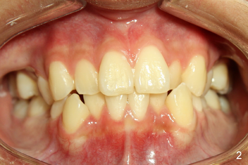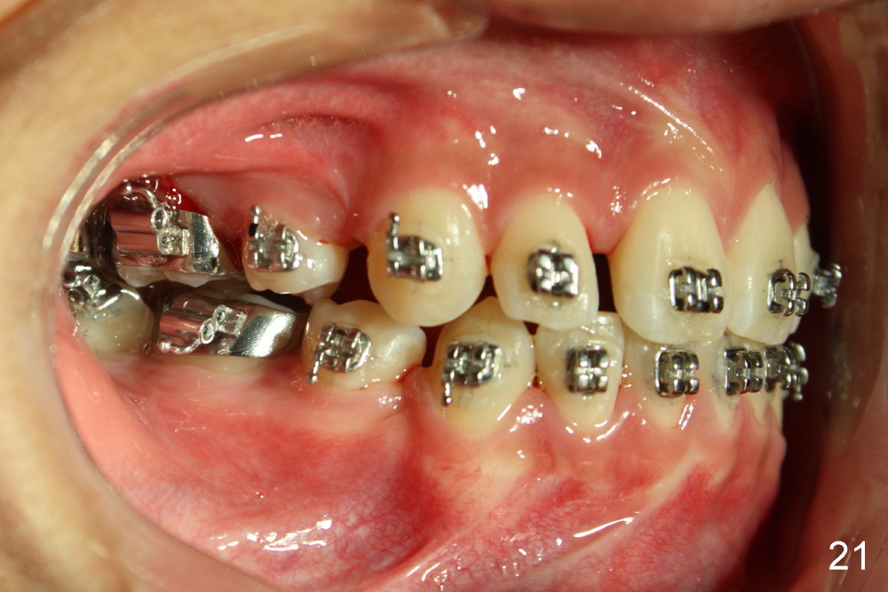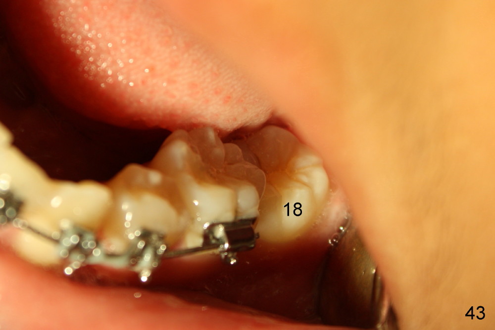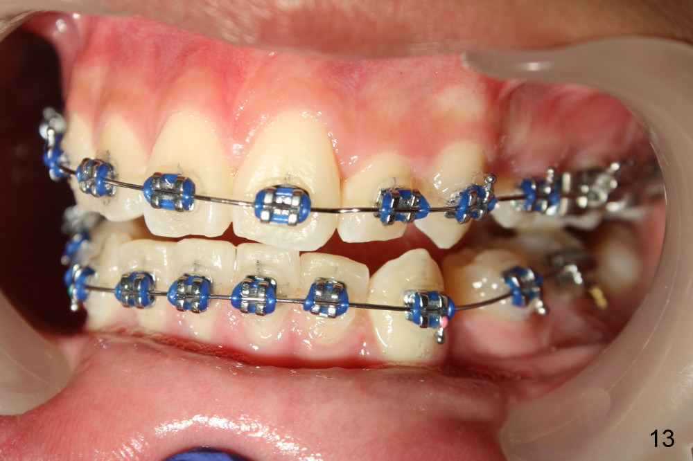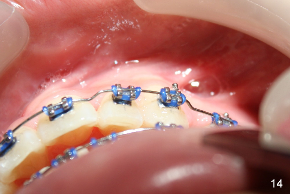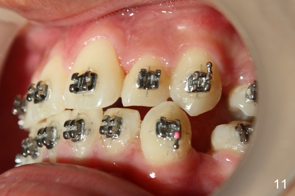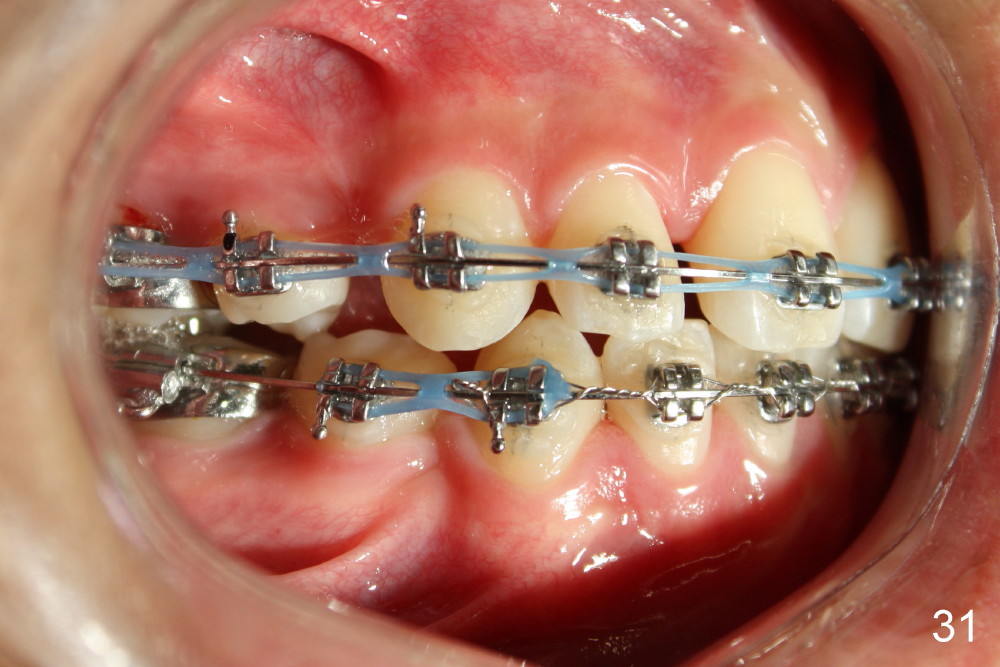 Two months later, LL7 (#18 in Fig.53,54) appears to be uprighted by itself (probably due to mesialization of the teeth mesial to it); a bracket is placed with .012 niti wire. No power chains are used to close the diastemata among the upper teeth, since the anterior overjet is minimal. A rotation wedge is placed in the distal wings of #27 to fix rotation. Is it right?