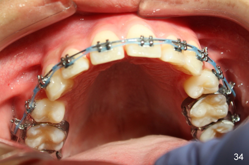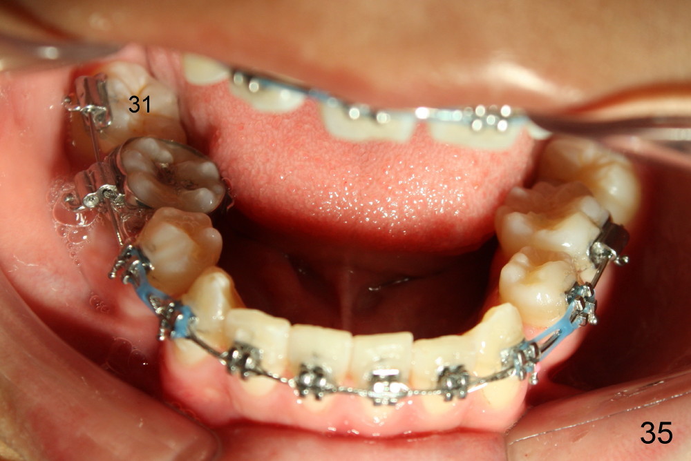 Prior to bracketing, the mesiodistal space for #18 is planned to be obtained by moving #20 and then #19 mesially (Fig.31-35, 16x16 ss). The six anterior lower teeth are tied together in a figure 8 fashion. Power chains are placed between the lower canine and the 2nd bicuspids. The upper diastemata are to be closed by power chains between the 1st molars.