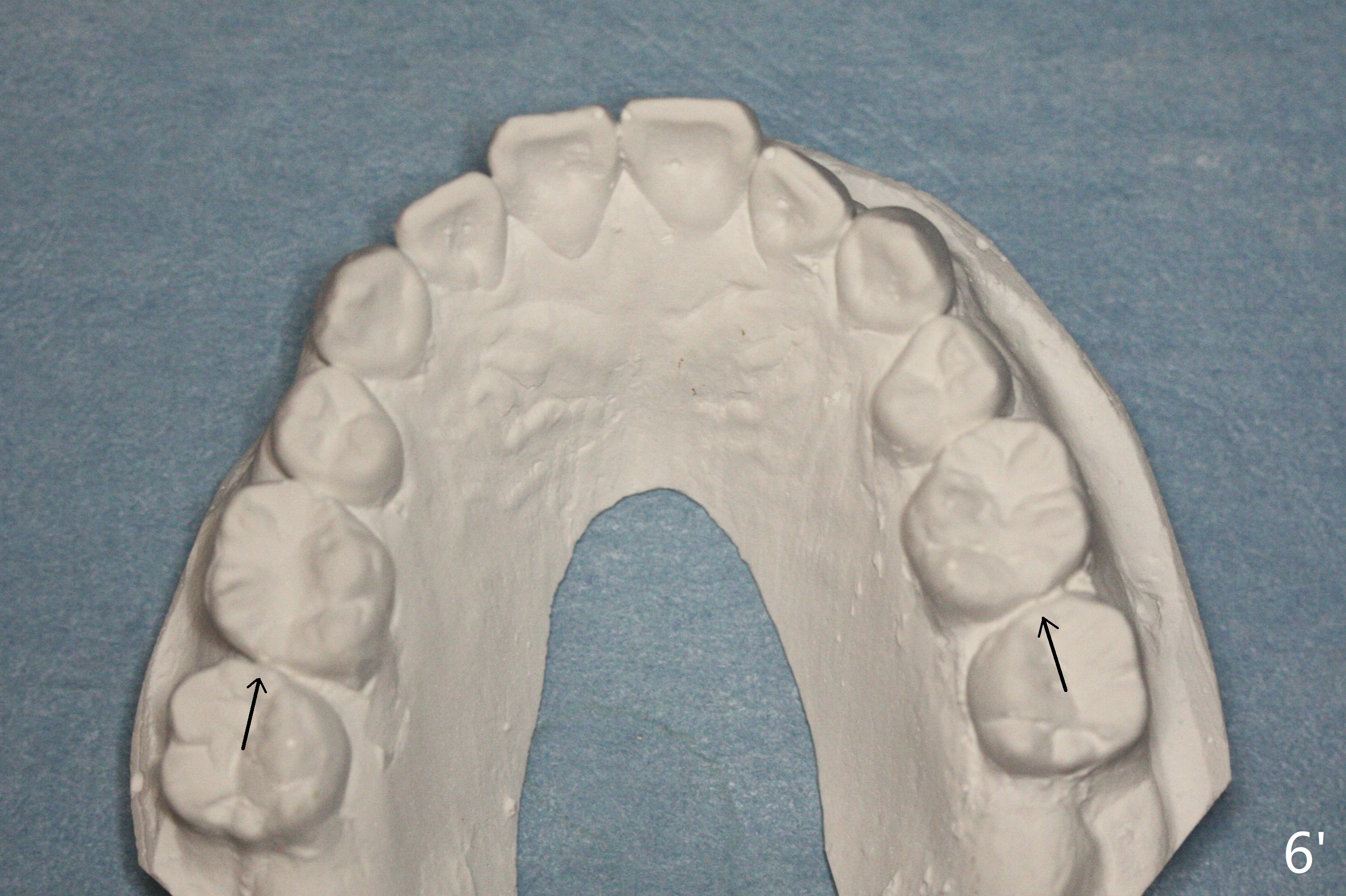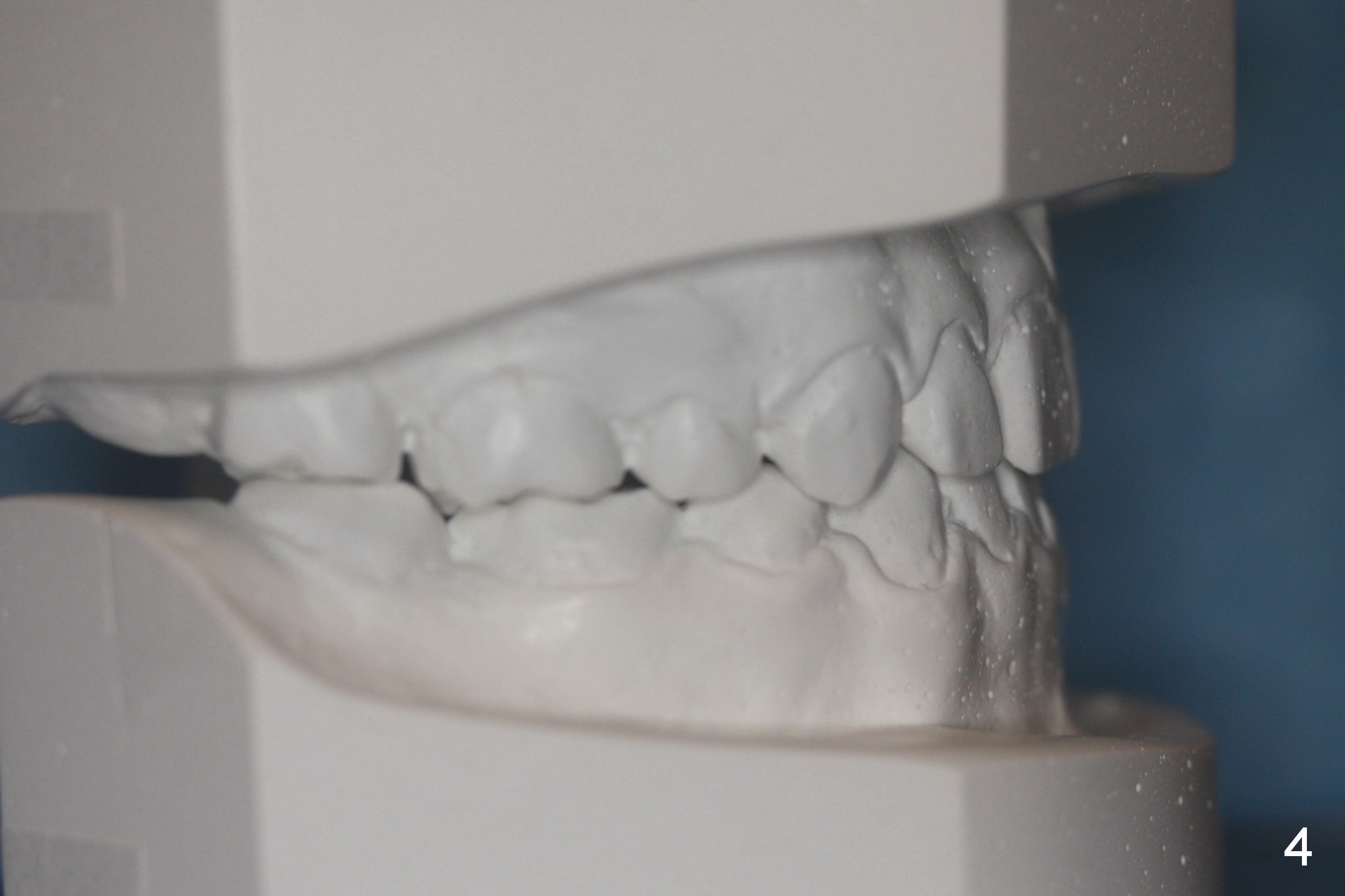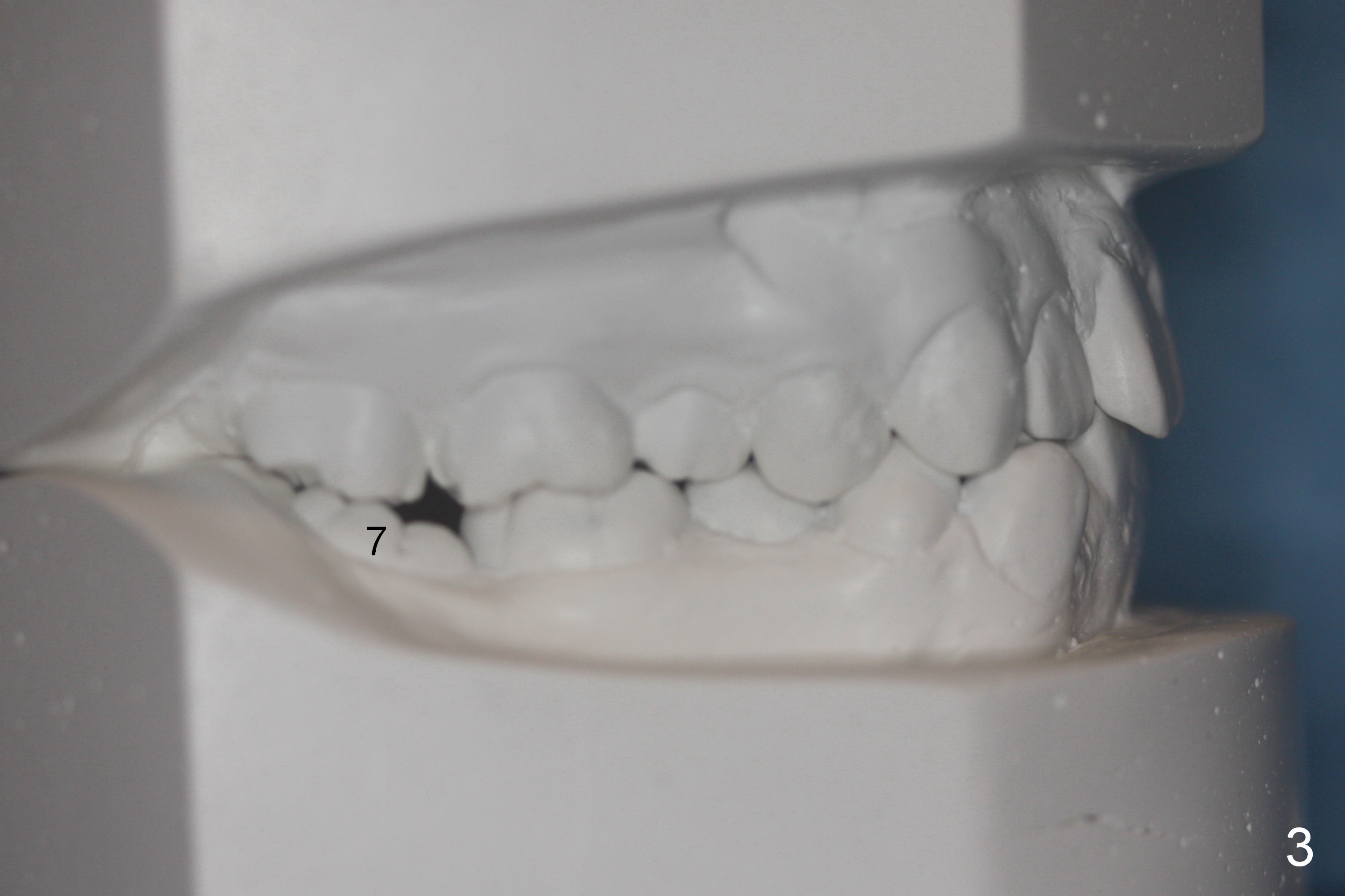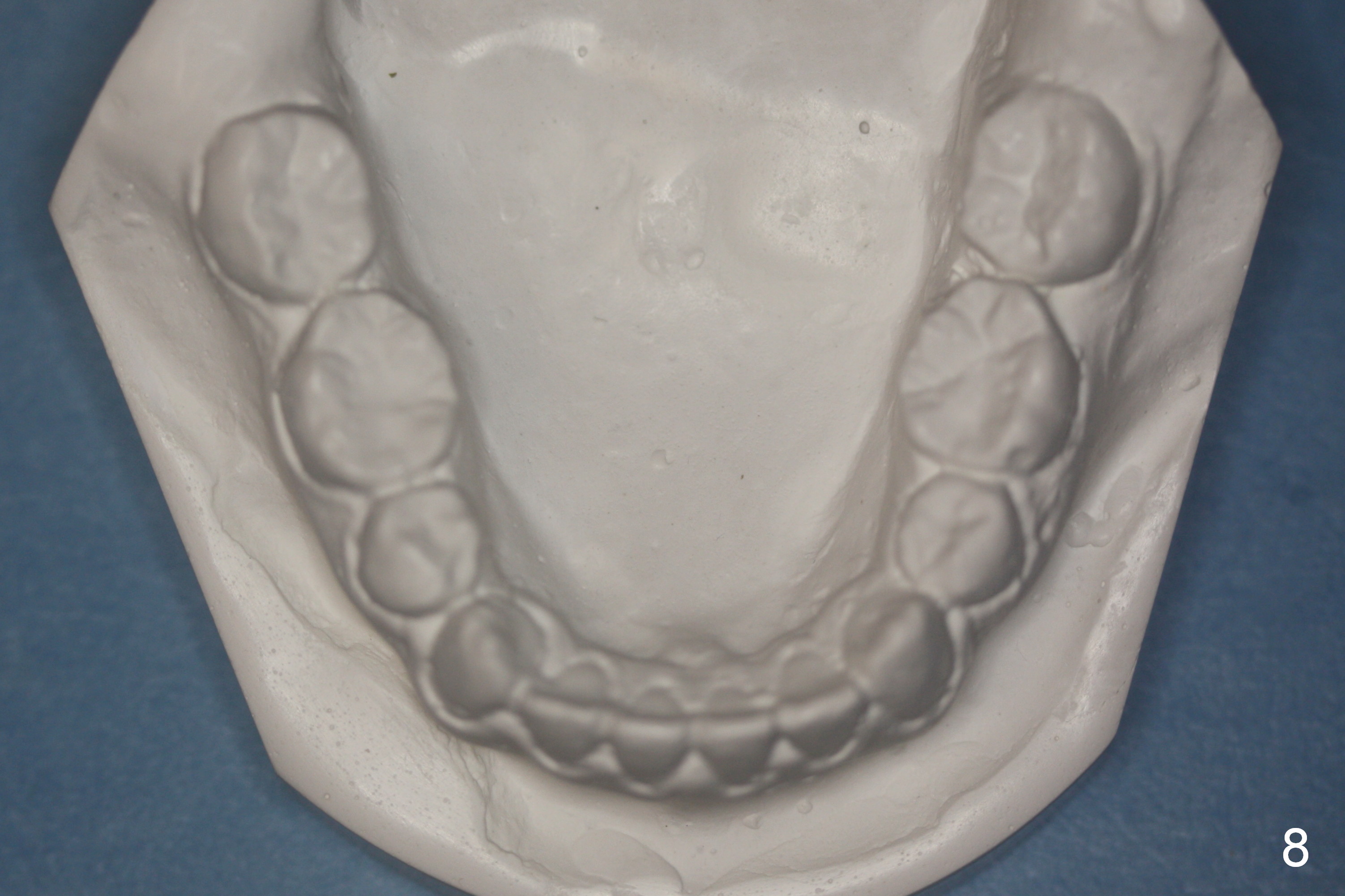 As noted, the orthodontic treatment finishes with extraction of four of the 1st bicuspids. To establish posterior interdigitation (Fig.4), the macrodontia (the lower 2nd bicuspids) have to be trimmed. It would be more efficient to have the lower 2nd bicuspids extracted. It would be helpful to upright the lower 2nd molars (Fig.3,7).