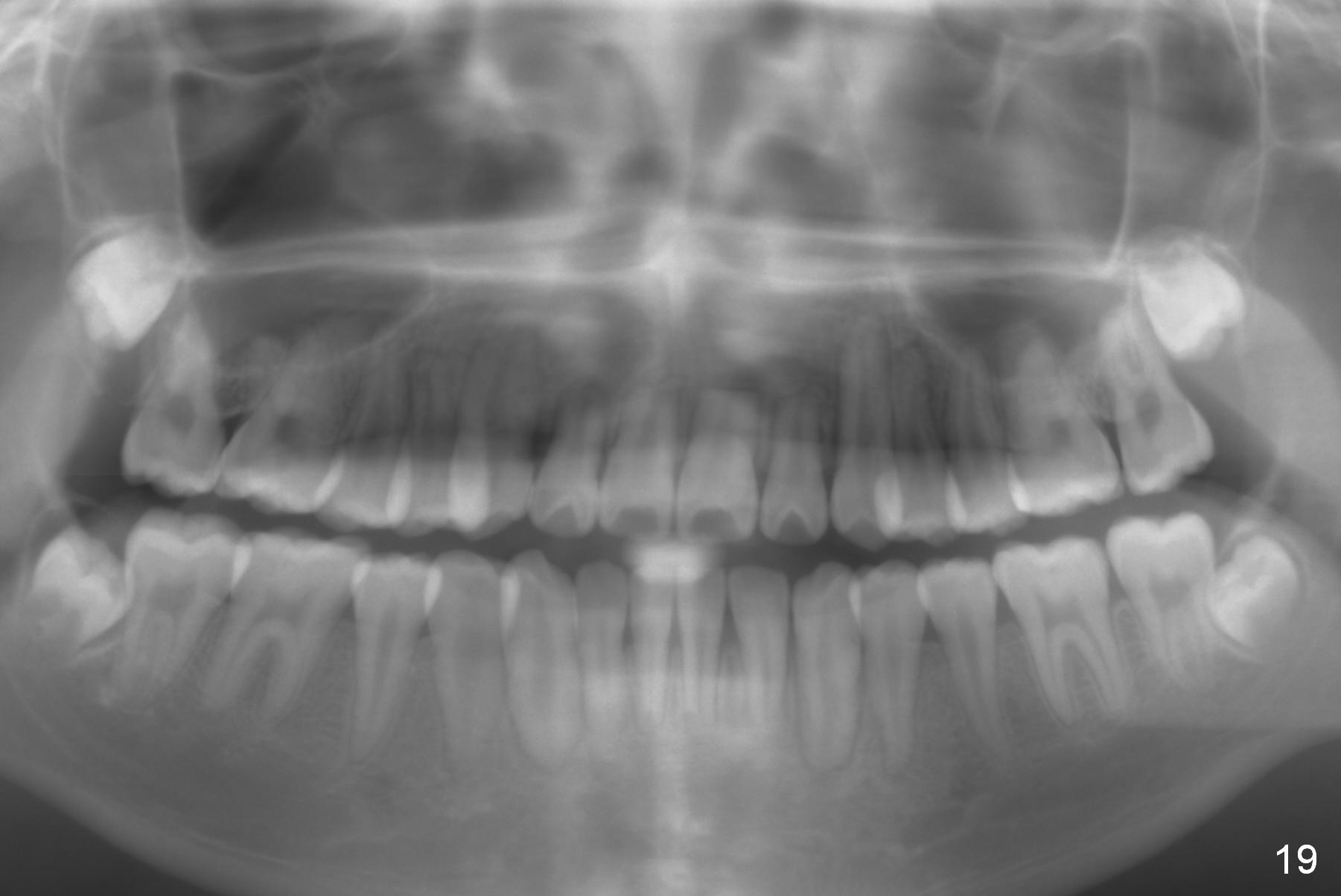 Non-extraction ortho takes 3 years 8 months to finish with shortening of #6-10, 22 and 27 roots (Fig.19) and compromised cosmetics (on the right column).