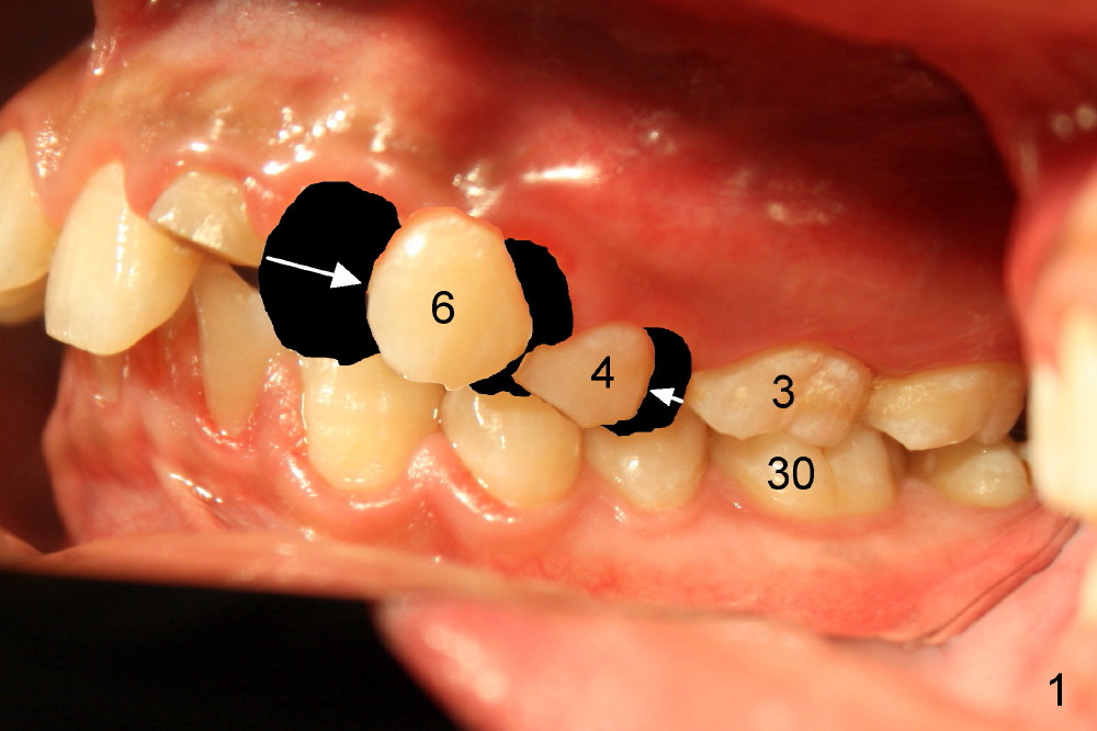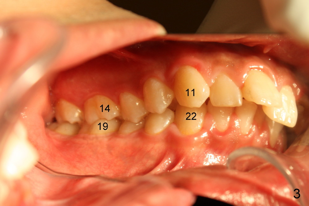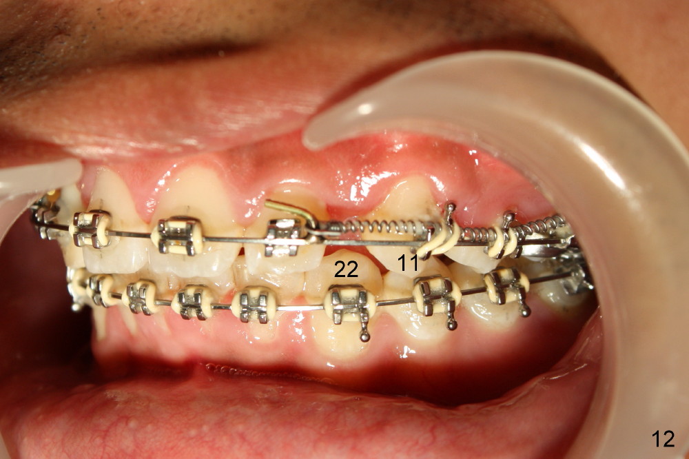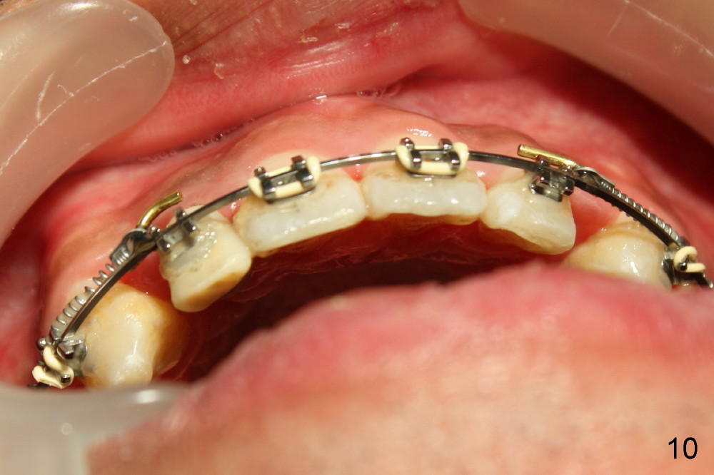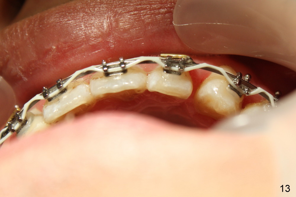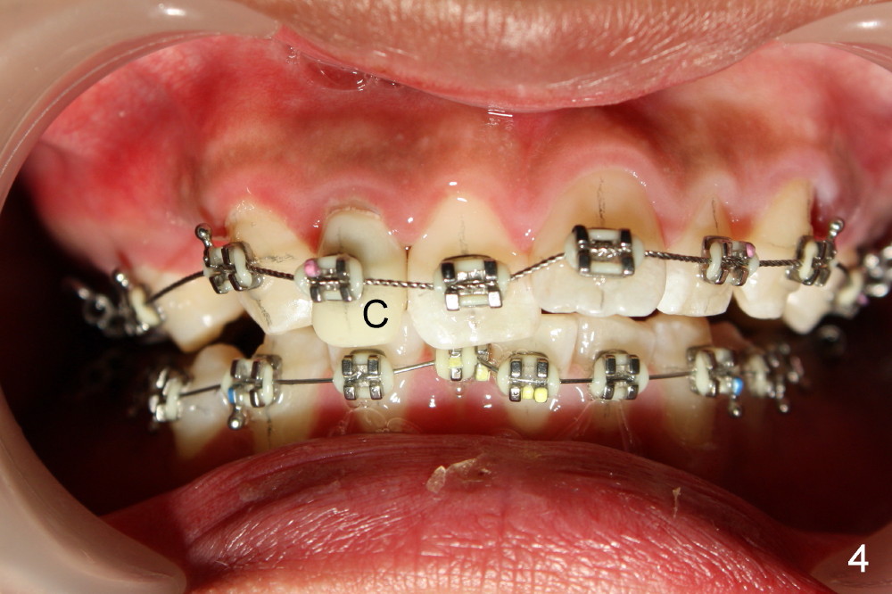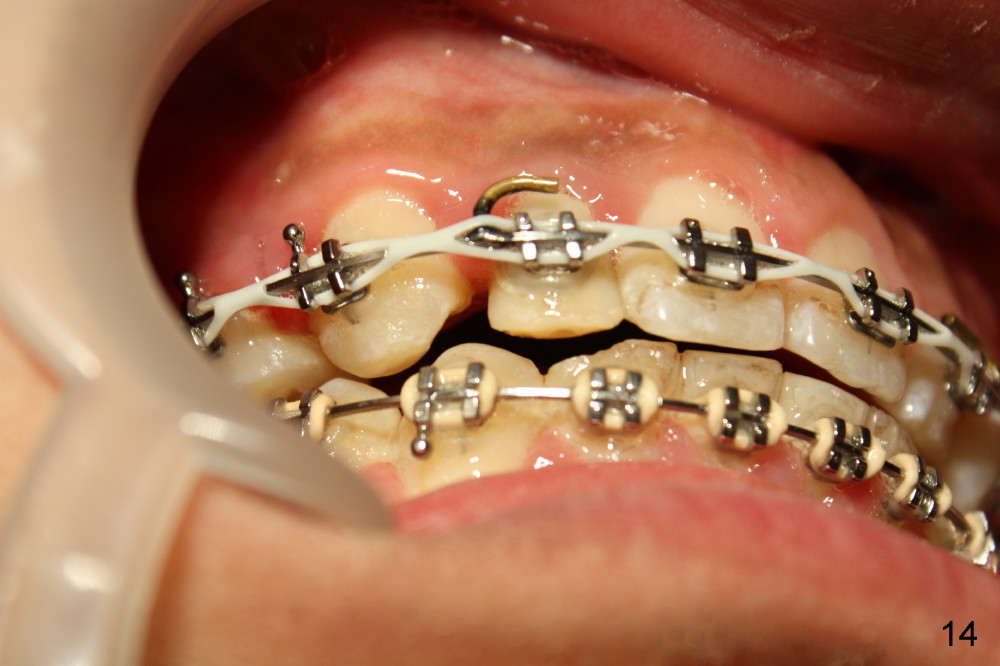 One month of power chains appears to close the space between the lateral and canine (data not shown). Braided wires are placed; posterior interdigitation is under way.